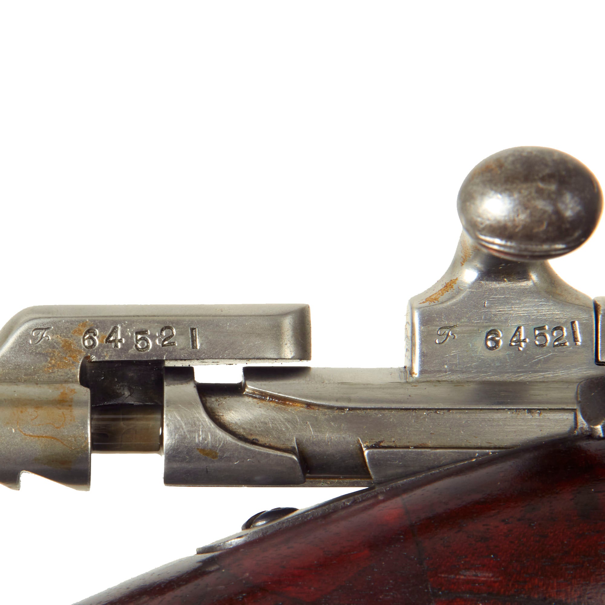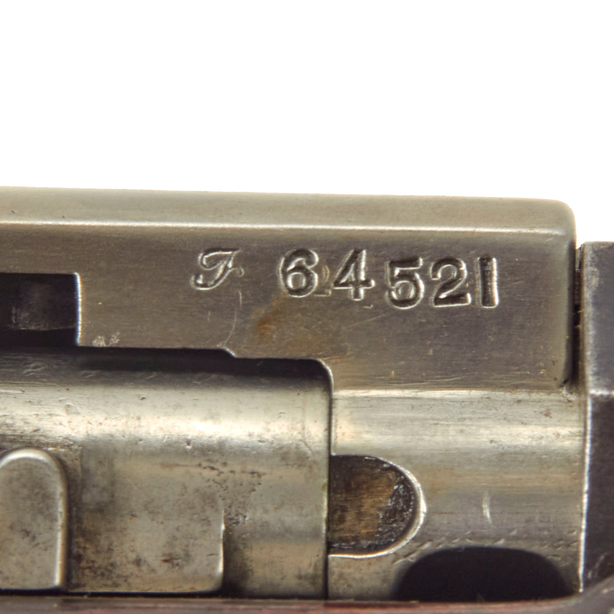 The carbine is marked with serial number F 64521 is present on the barrel, stock, and on all components of the bolt. Only the cleaning rod an unmarked replacement, making this a great "Mostly Matching" example, with no functional parts swapped out over the years. The metalwork is in excellent condition, still showing strong bluing overall, with just a bit of wear and peppering in places. The bolt is still the correct bright steel, with just a bit of light staining. The bolt still moves correctly and dry fires, though it is definitely a bit stiff. The bore is in very good condition, with strong lands and grooves with a mostly bright finish. There is just a bit of wear and past fouling in areas, now cleaned away.