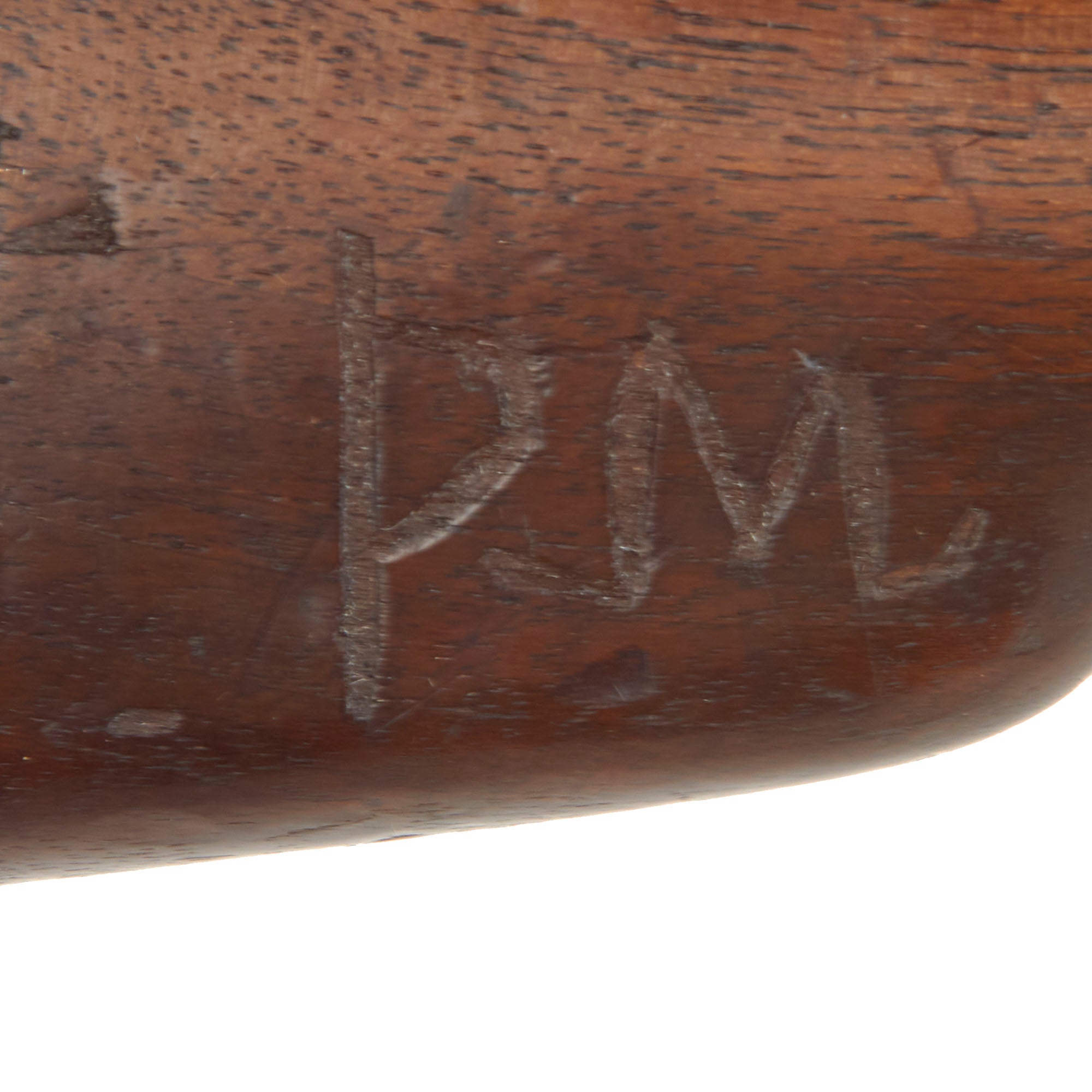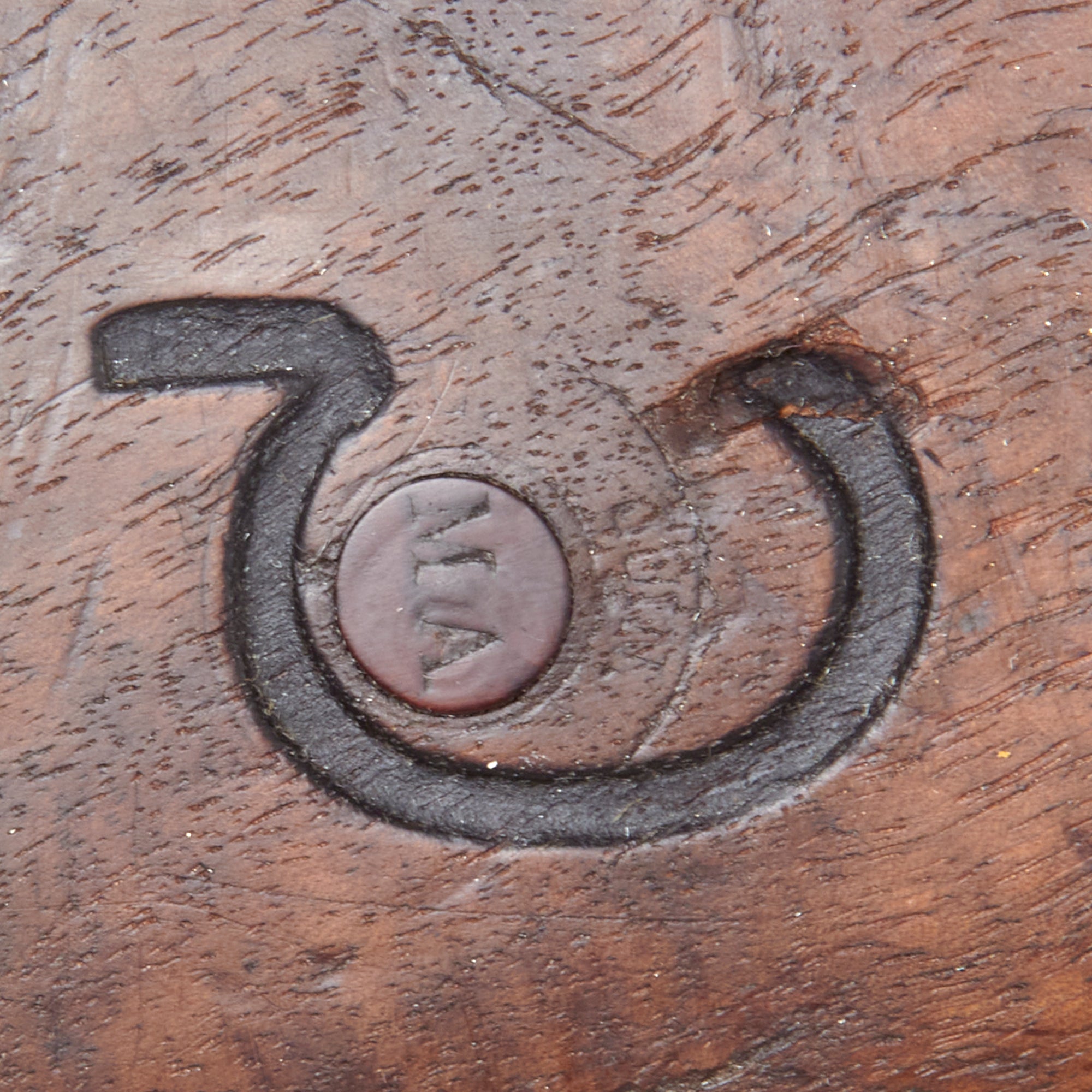 The stock is in very good condition with great color, showing the expected dents, dings, and other wear from service. It does not look to have been arsenal reconditioned, however it definitely has been worn down a bit from cleaning. This has made some of the markings faint, though we can still see the MA on the "Holy Water Plug" boxwood insert on the right side of the stock, and just a bit of the cartouche. There are also several letters and symbols carved into both sides of the butt stock. Both sling swivels are present and move relatively easily, and the rear sight is fully functional, though a bit stiff.