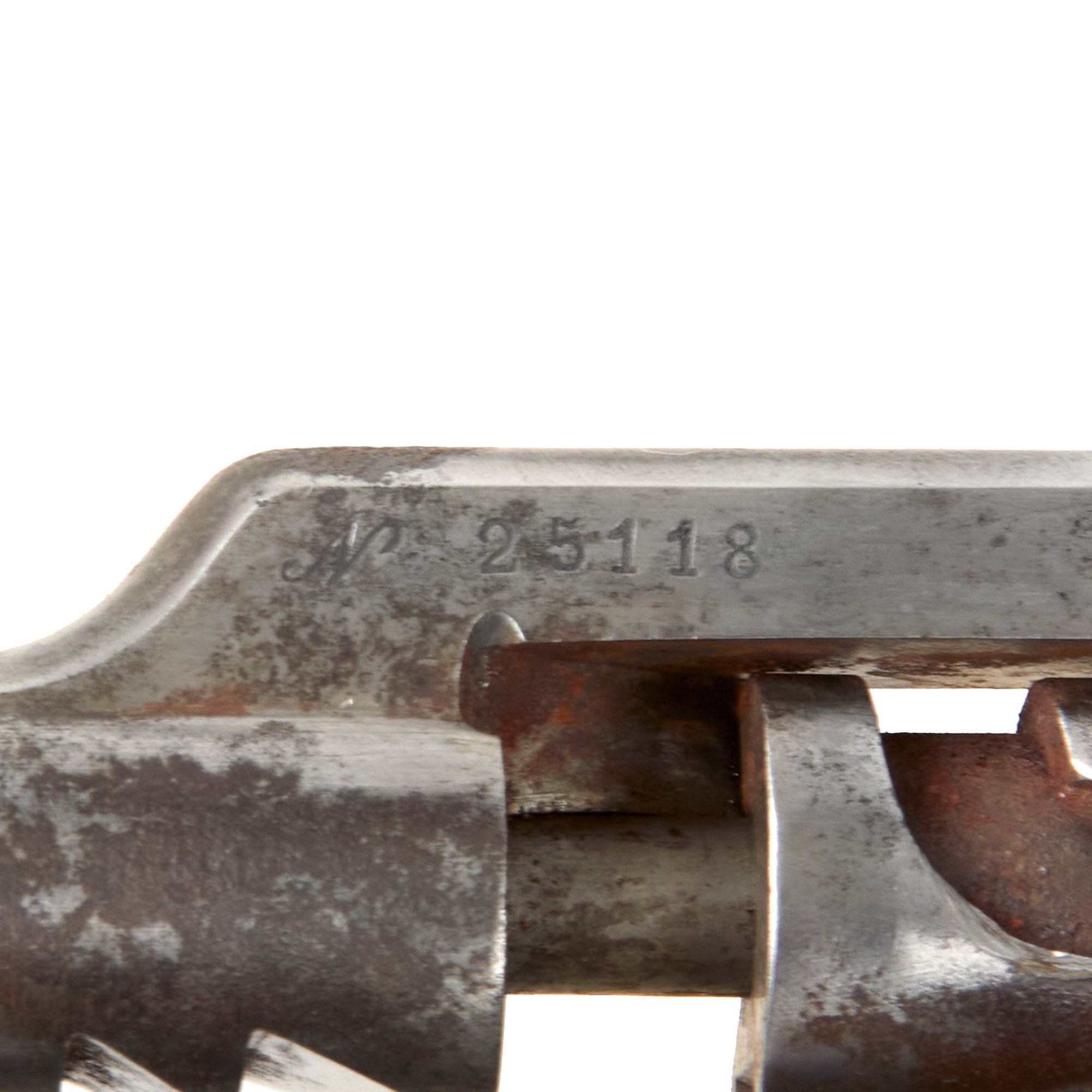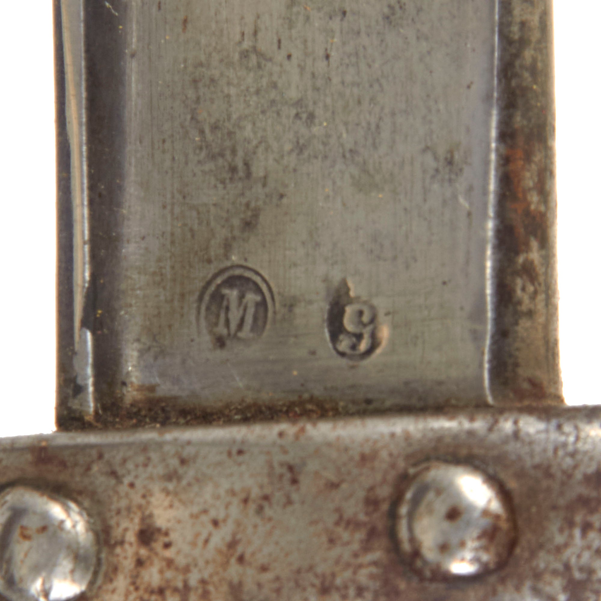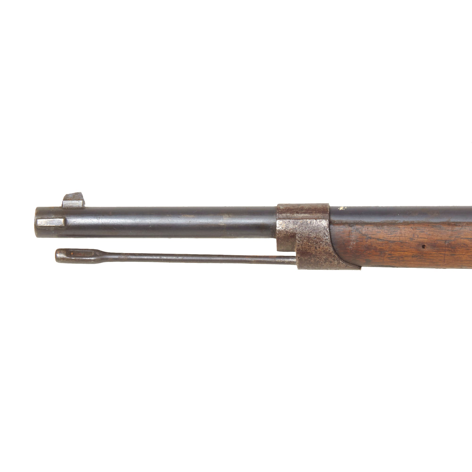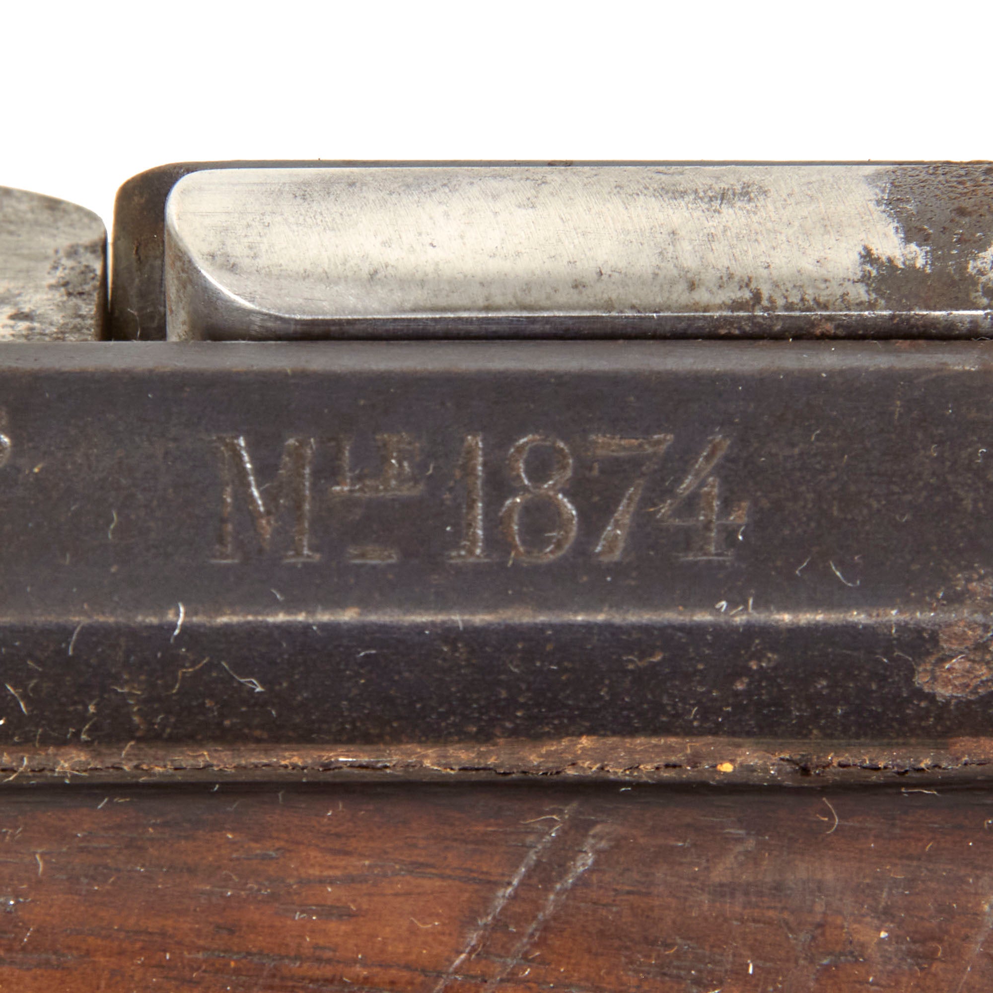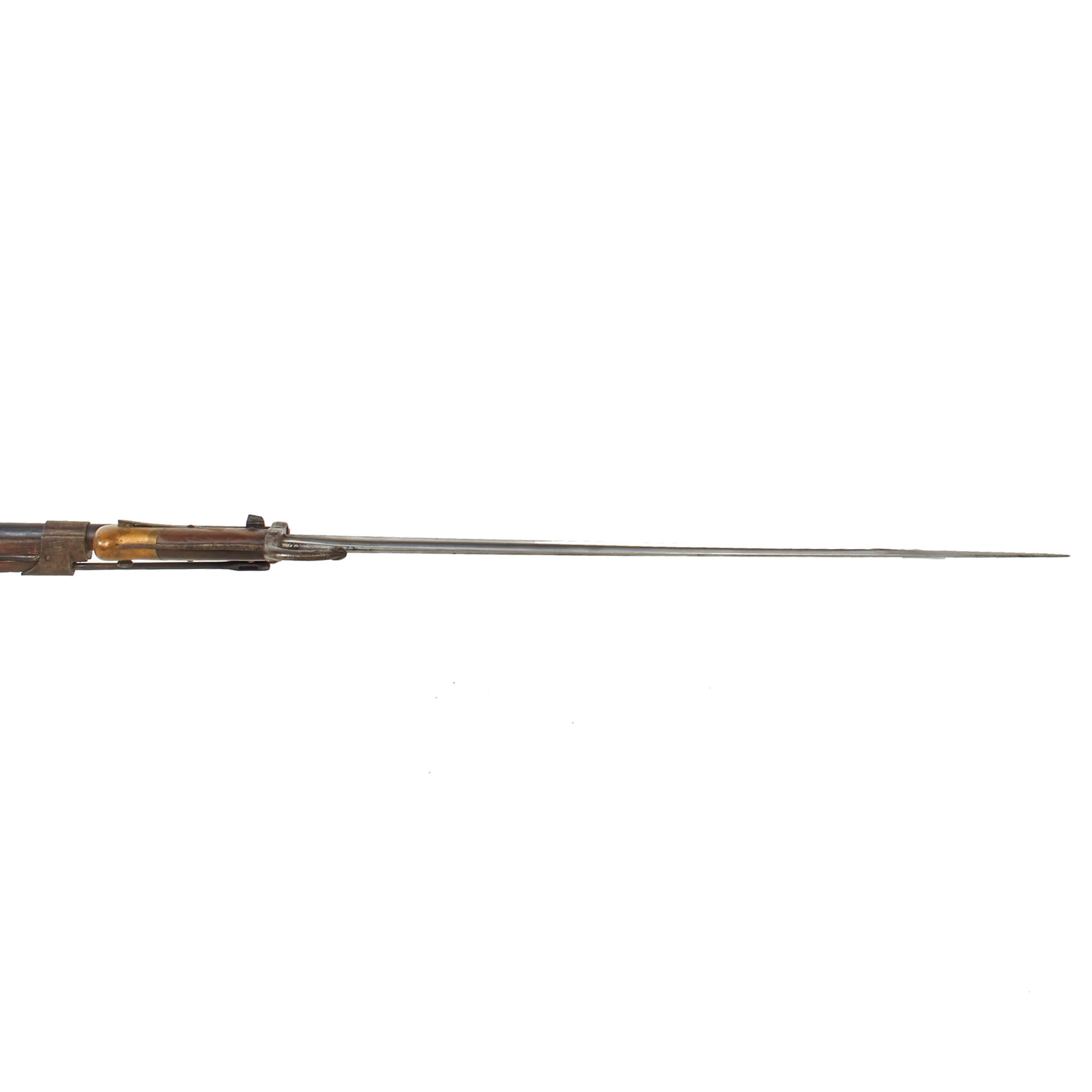 Included with this rifle a correct issue T-backed Blade Model 1874 "Gras" sword bayonet with steel scabbard. This bayonet is in very good good condition, with a bright steel blade with little corrosion, and all the correct issue markings. The T-shaped back of the bayonet is marked M're d'Armes de St. Étienne 7bre 1876, indicating manufacture at the St. Étienne Arsenal in September 1876. The hilt is in very good used condition, with some oxidation staining on the steel components, and light wear to the wooden grip. The scabbard is in very good condition and easily fits over the blade, with the original blued finish well retained, and shows no major dents. The bayonet fits the rifle well, though there is some deformation of the front of the bayonet stand, so it does not fit into the slot in the cross guard, preventing it from locking on without modification.