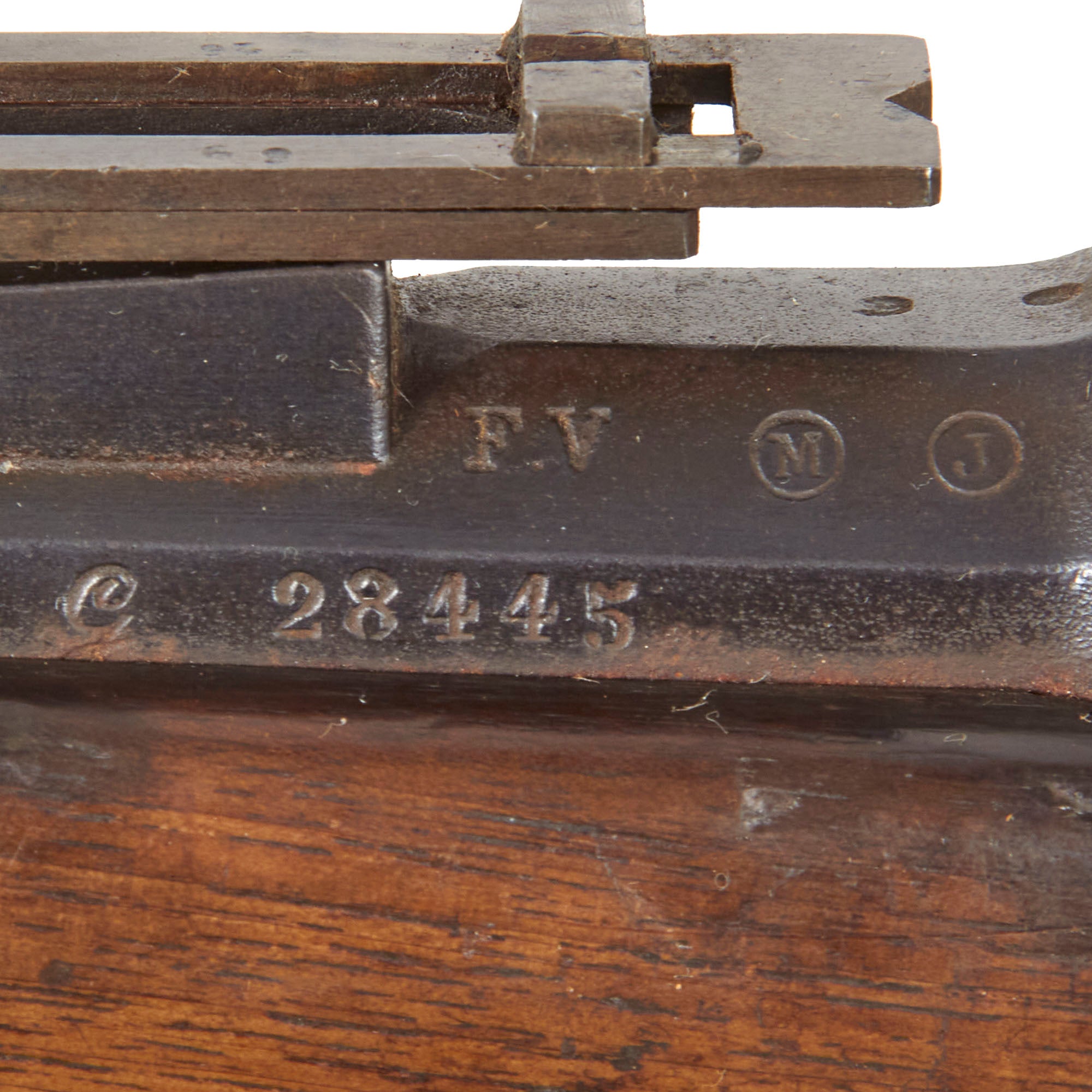 This rifle has mismatched serial numbers, which would indicate that it did have parts swapped at arsenal, a very common occurrence once the Gras was obsolete. It is marked with serial number G 28445 on the barrel and bayonet stand, while the bolt components, cleaning rod, and stock are marked with different serial numbers. The metalwork may have been refinished at some point, and the bluing is well retained on the barrel and receiver, with some oxidation along the wood line. The bolt shows some past oxidation, with light pitting in areas, now mostly cleaned away. The bore however is in truly excellent condition, showing a mirror bright finish with crisp lands and grooves. It shows little to no sign of use, and must have been well protected from the elements. The rifle cycles and dry fires well, with no major issues to note.