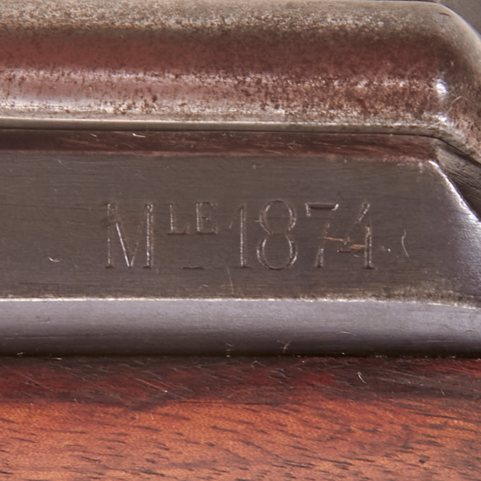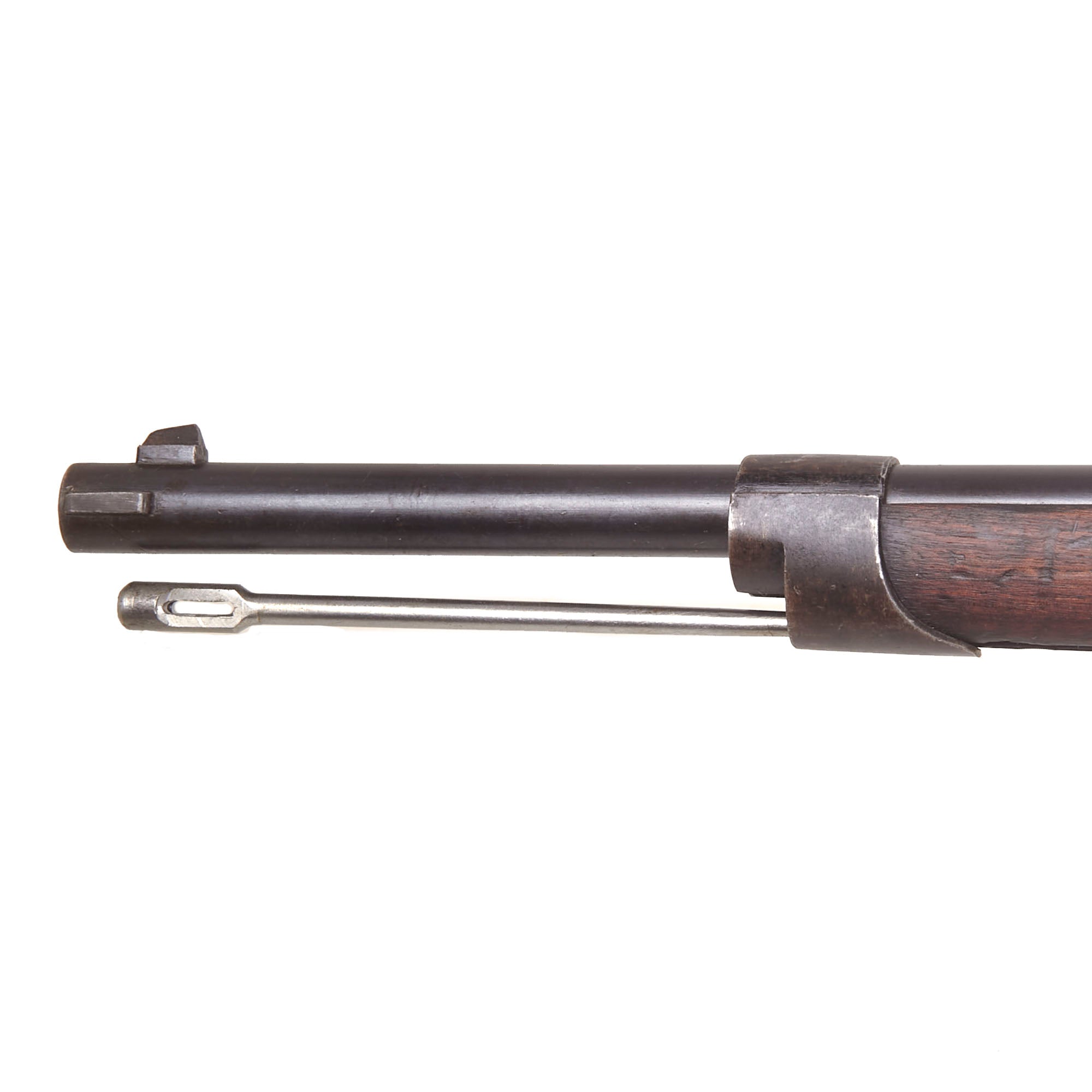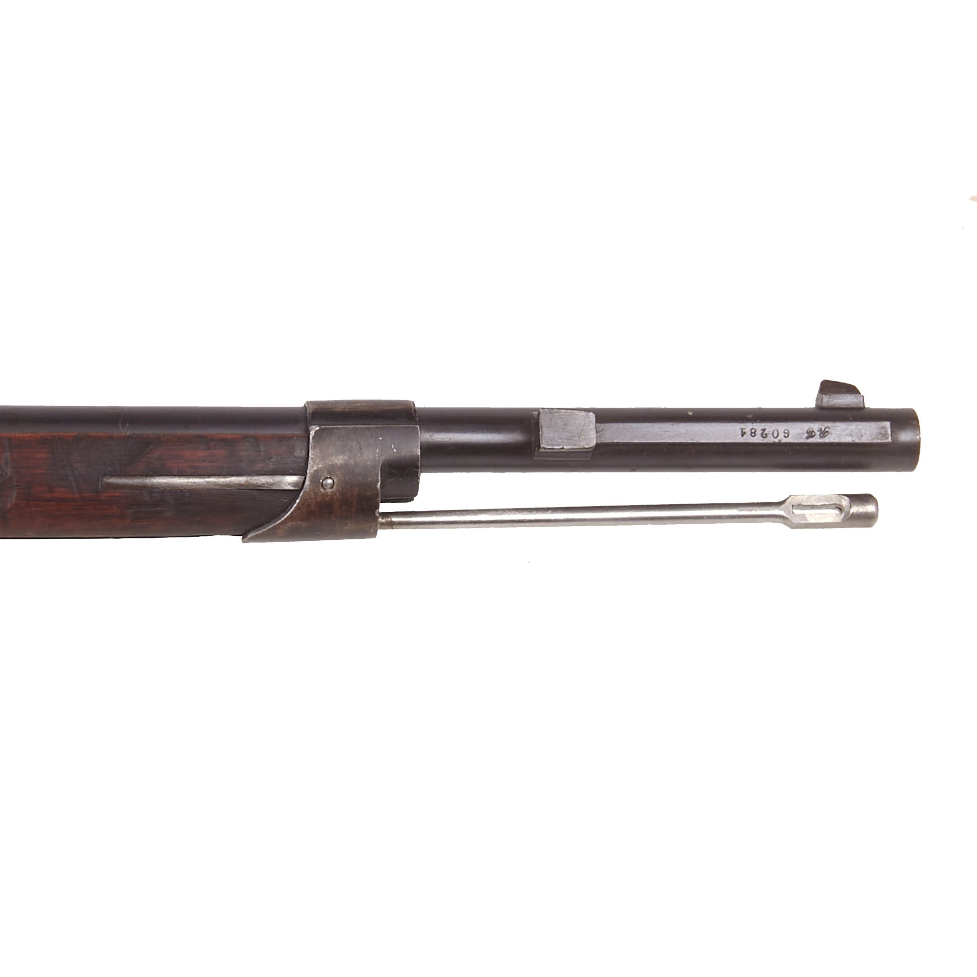 This is a lovely honest used example of the Fusil Gras Modèle 1874 M80, still clearly marked on the receiver with MANUFACTURE D'ARMES / Tulle over M.80, and to the right is the model designation Mle 1874. The rifle has an issue date marking of T. 1884 stamped into the right barrel nocks form, for manufacture at the Imperial Arsenal of Tulle in 1884. The "M.80" marking is for the update to the action that added a channel for gas escape to the bolt head and receiver, in the case of a ruptured primer. It comes with all original steel mounts and an intact cleaning rod, which looks to be a replacement. Most fittings bear the correct government proof marks, though some are worn.