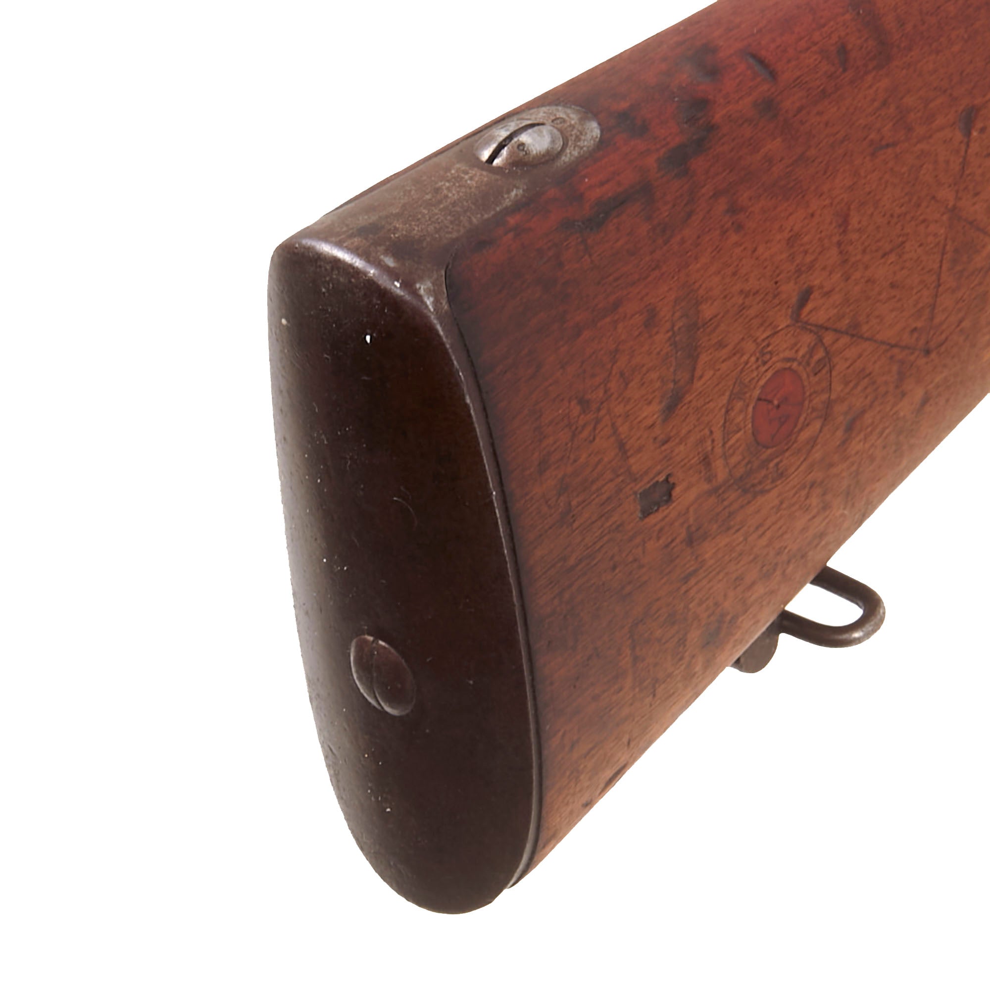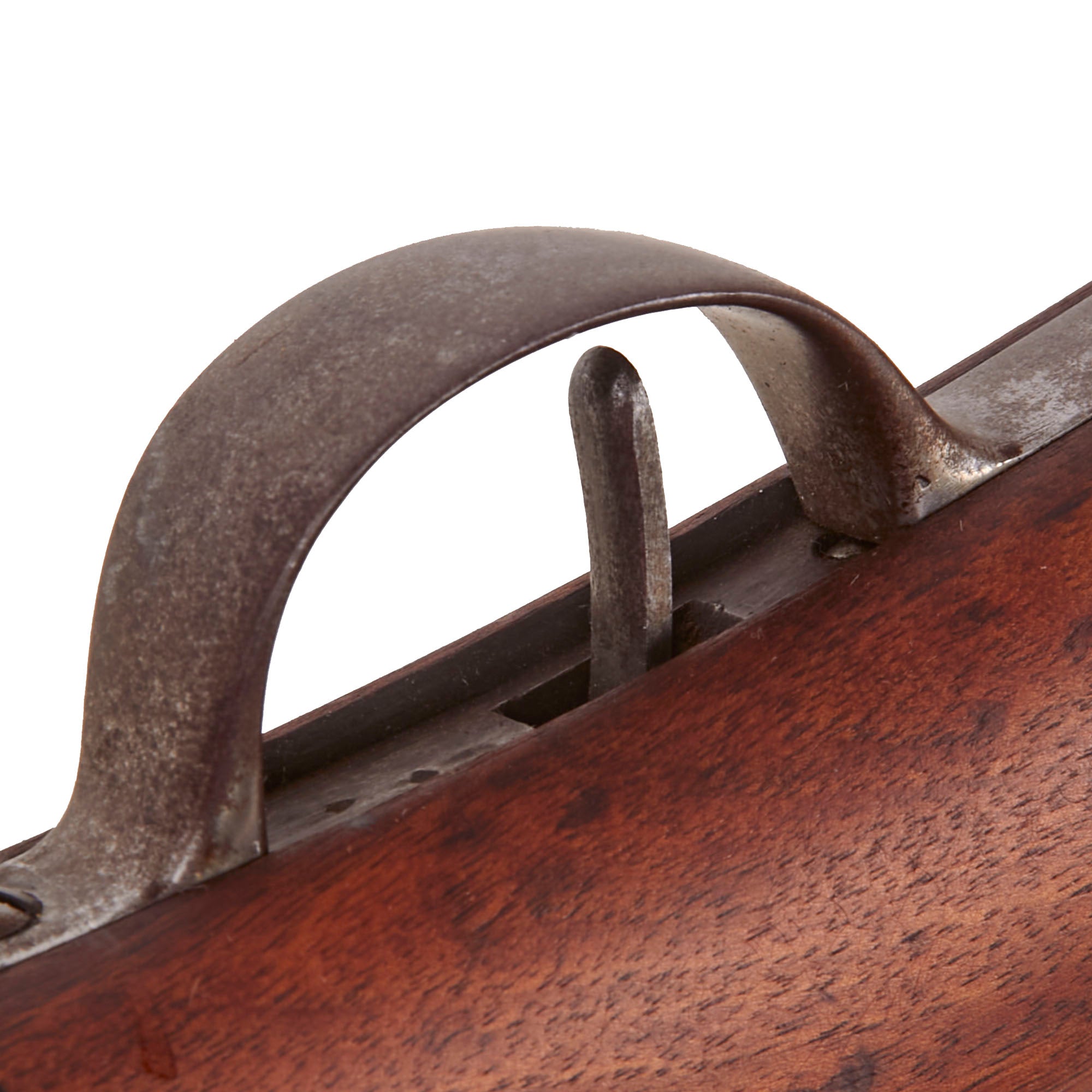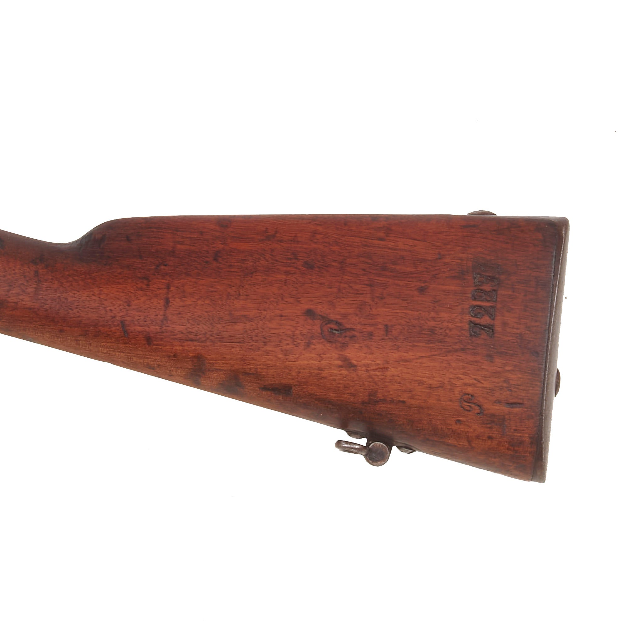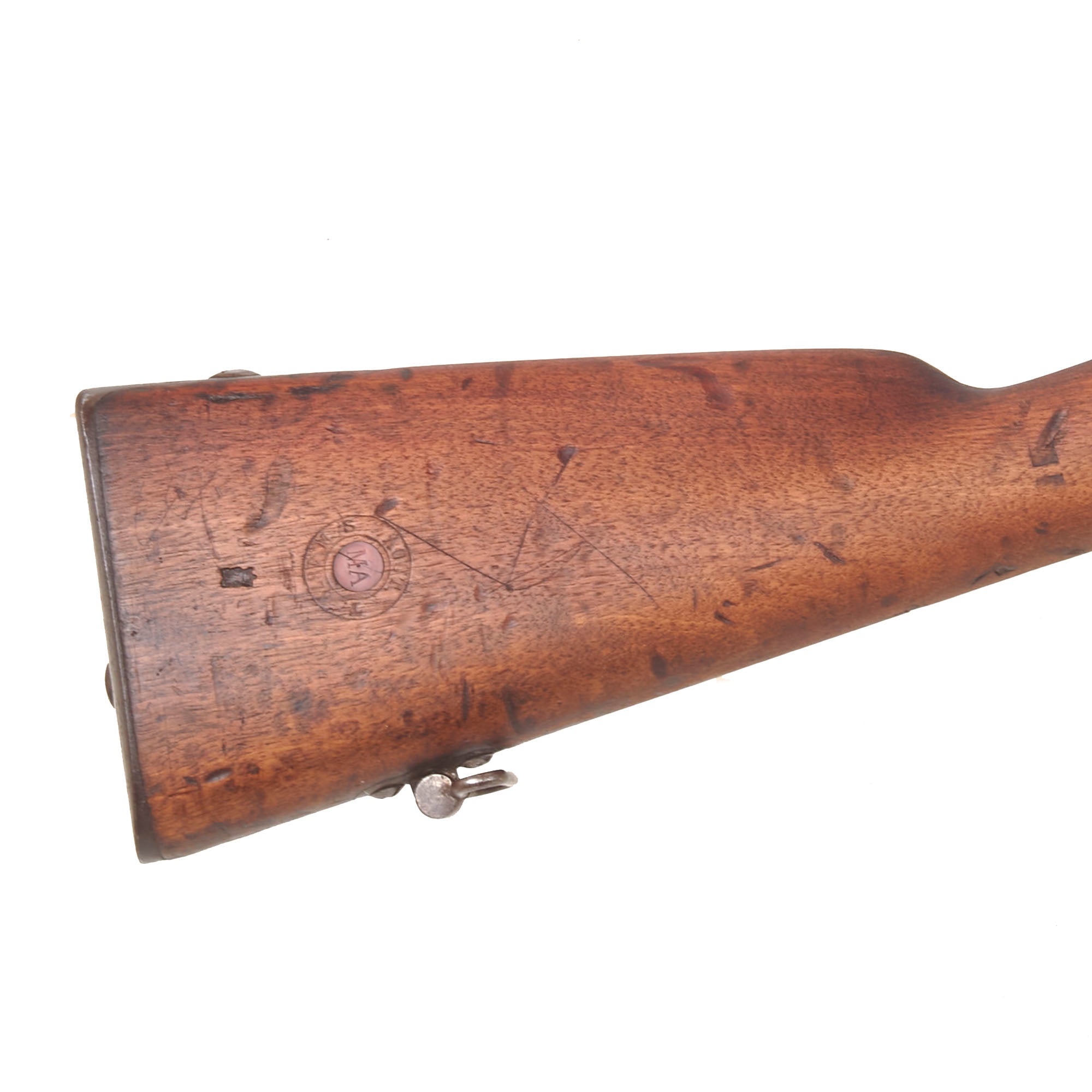 This is a lovely honest used example of the Fusil Gras Modèle 1874 M80, still clearly marked on the receiver with MANUFACTURE D'ARMES / Tulle over M.80, and to the right is the model designation Mle 1874. The rifle has an issue date marking of T. 1884 stamped into the right barrel nocks form, for manufacture at the Imperial Arsenal of Tulle in 1884. The "M.80" marking is for the update to the action that added a channel for gas escape to the bolt head and receiver, in the case of a ruptured primer. It comes with all original steel mounts and an intact cleaning rod, which looks to be a replacement. Most fittings bear the correct government proof marks, though some are worn.