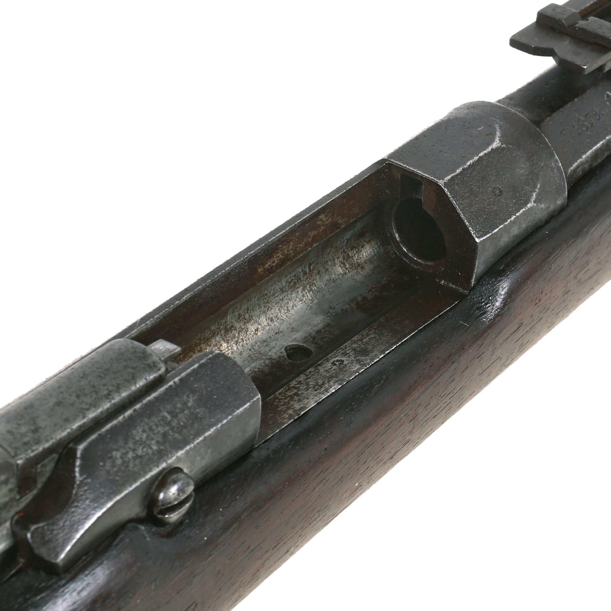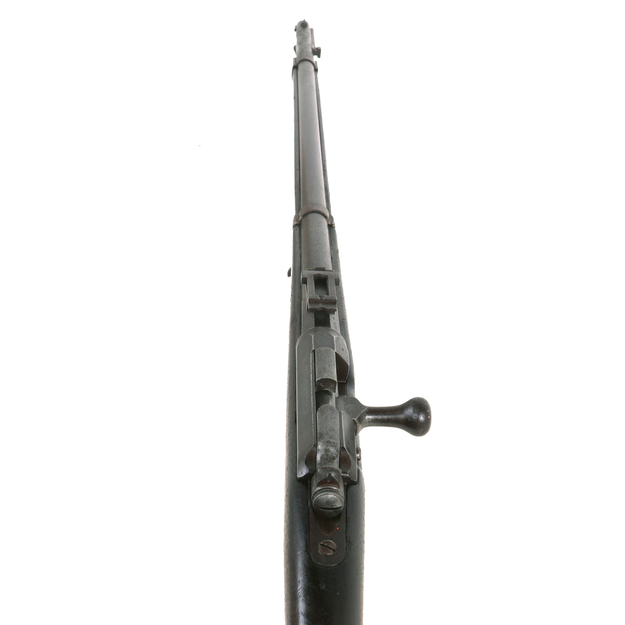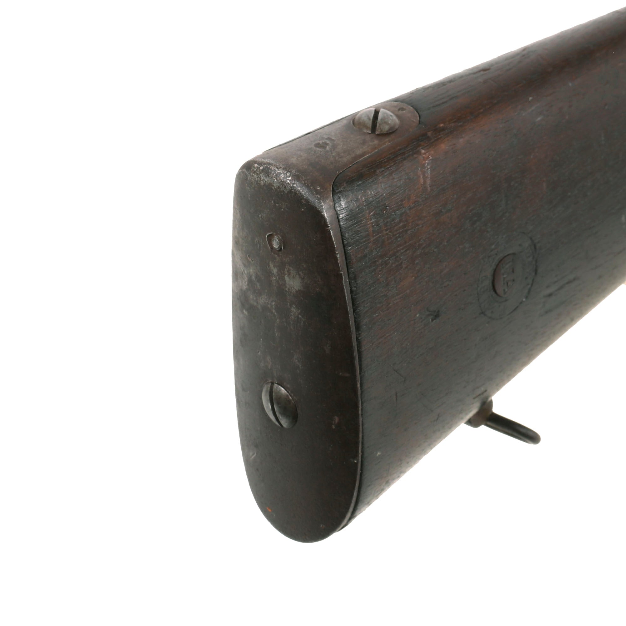 Condition is very good overall, with an aged patina due to years of service and cleaning. The receiver, barrel bands, rear sight, and bolt all have some moderate oxidation and pitting. There are some areas of past oxidation on the barrel, now cleaned away. The action functions well, with a crisp dry fire. The bore still shows clear rifling, though it is a bit dark from lead fouling and heavy oxidation.