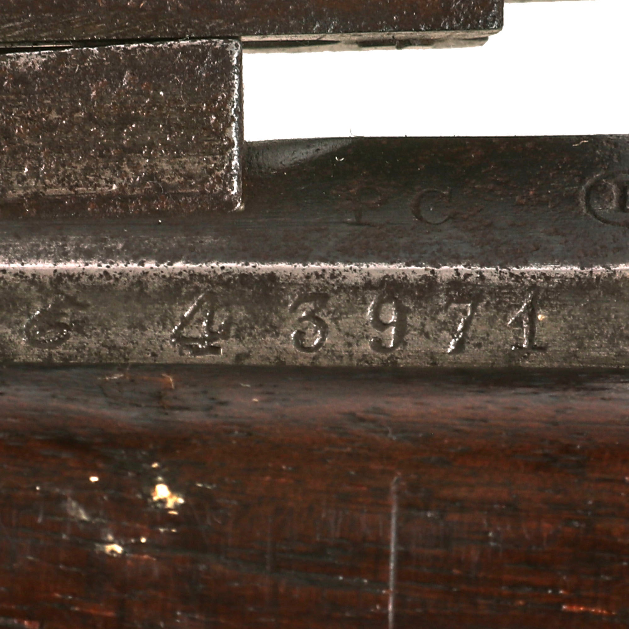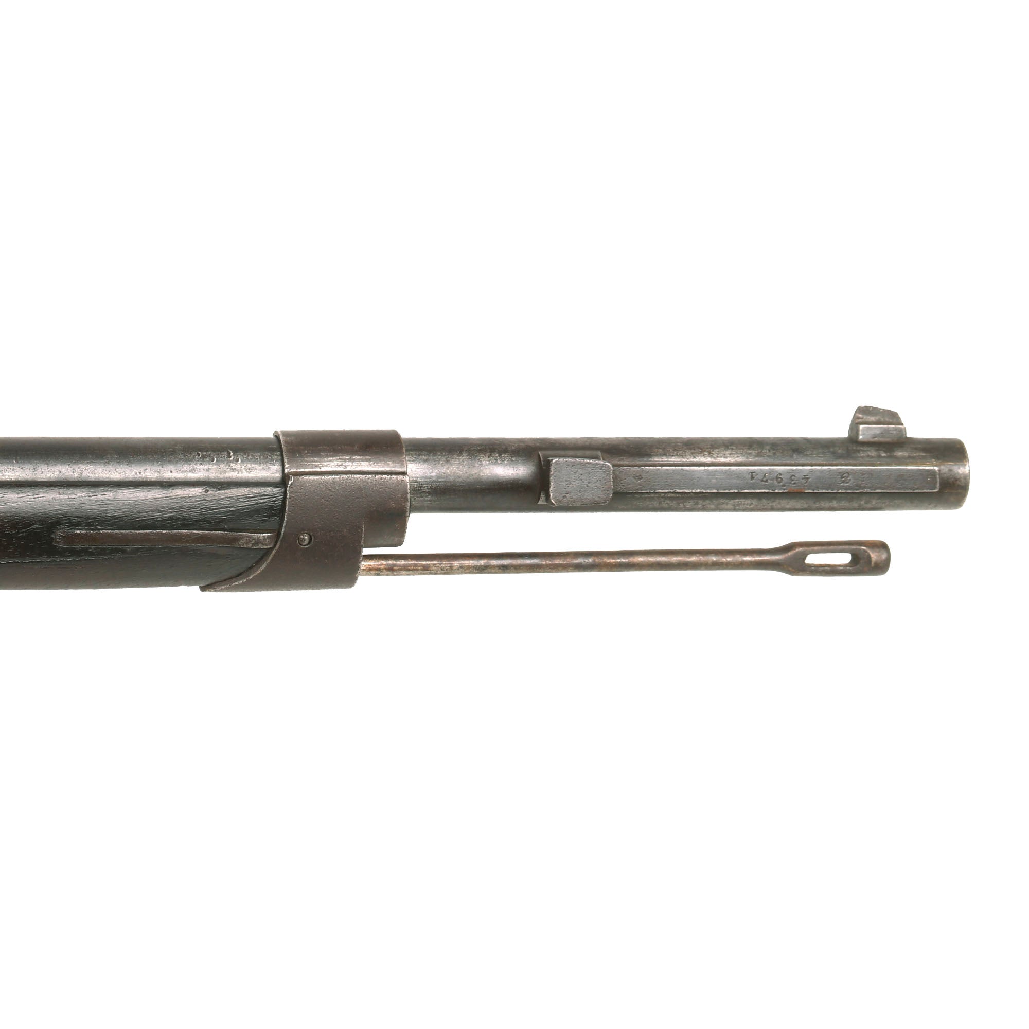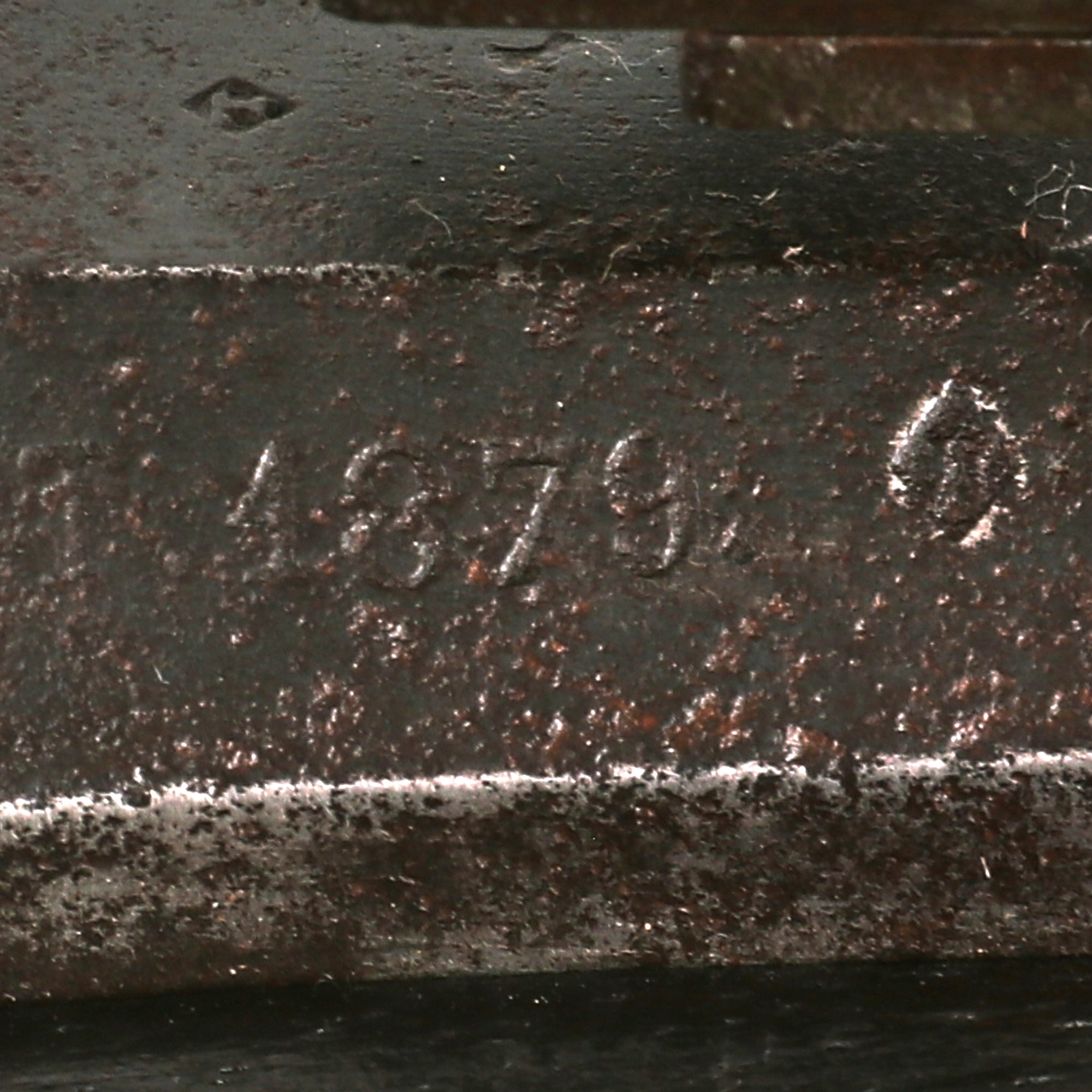 This is a nice service used example of the Fusil Gras Modèle 1874 M80, still relatively clearly marked on the receiver with MANUFACTURE D'ARMES / Tulle, and to the right is the model designation Mle 1874. There does not appear to be any "M80" stamp, so this example did not have the modification done to help with gas escape from the chamber in the case of a ruptured cartridge. The rifle has a clear issue date marking of T. 1879 stamped into the right barrel nocks form, for manufacture at the Imperial Arsenal at Tulle in 1879. There is no "M80" marking, most likely due to the early manufacture date. The left side of the barrel is marked with serial number T 43971, and this same serial number is found on the buttstock, the bolt, the rear sight, and the breech frame, making this an ALL MATCHING example. It comes with all original steel mounts and an intact cleaning rod. Most fittings bear the correct government proof marks, though some are worn.