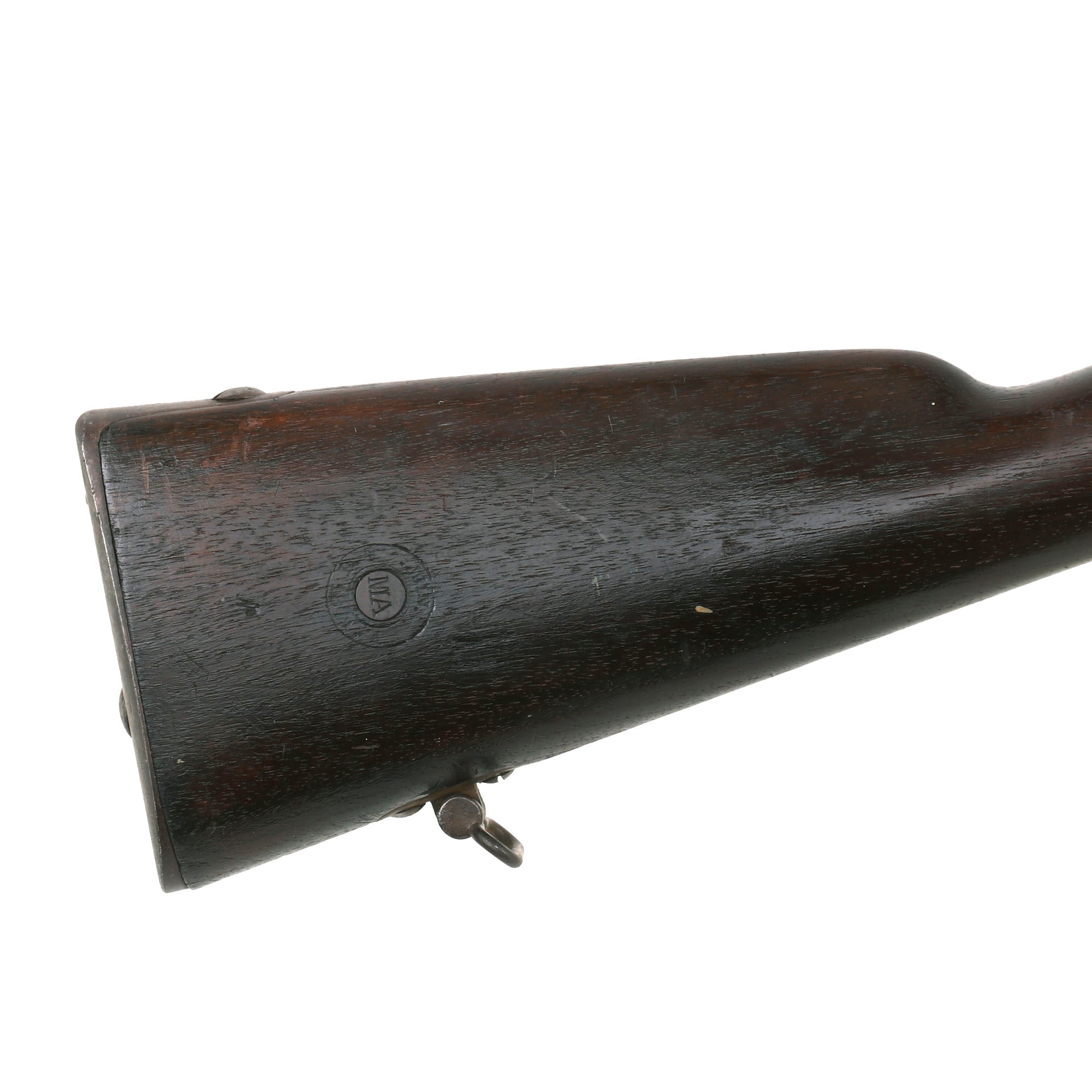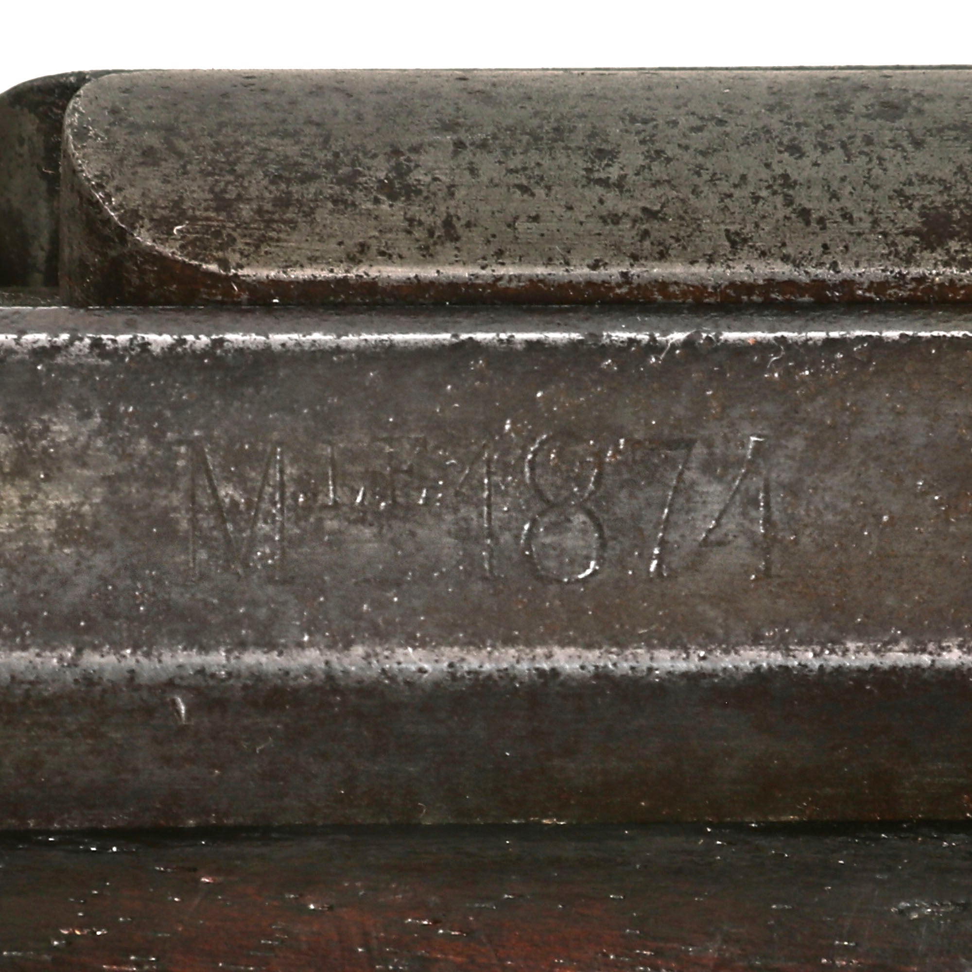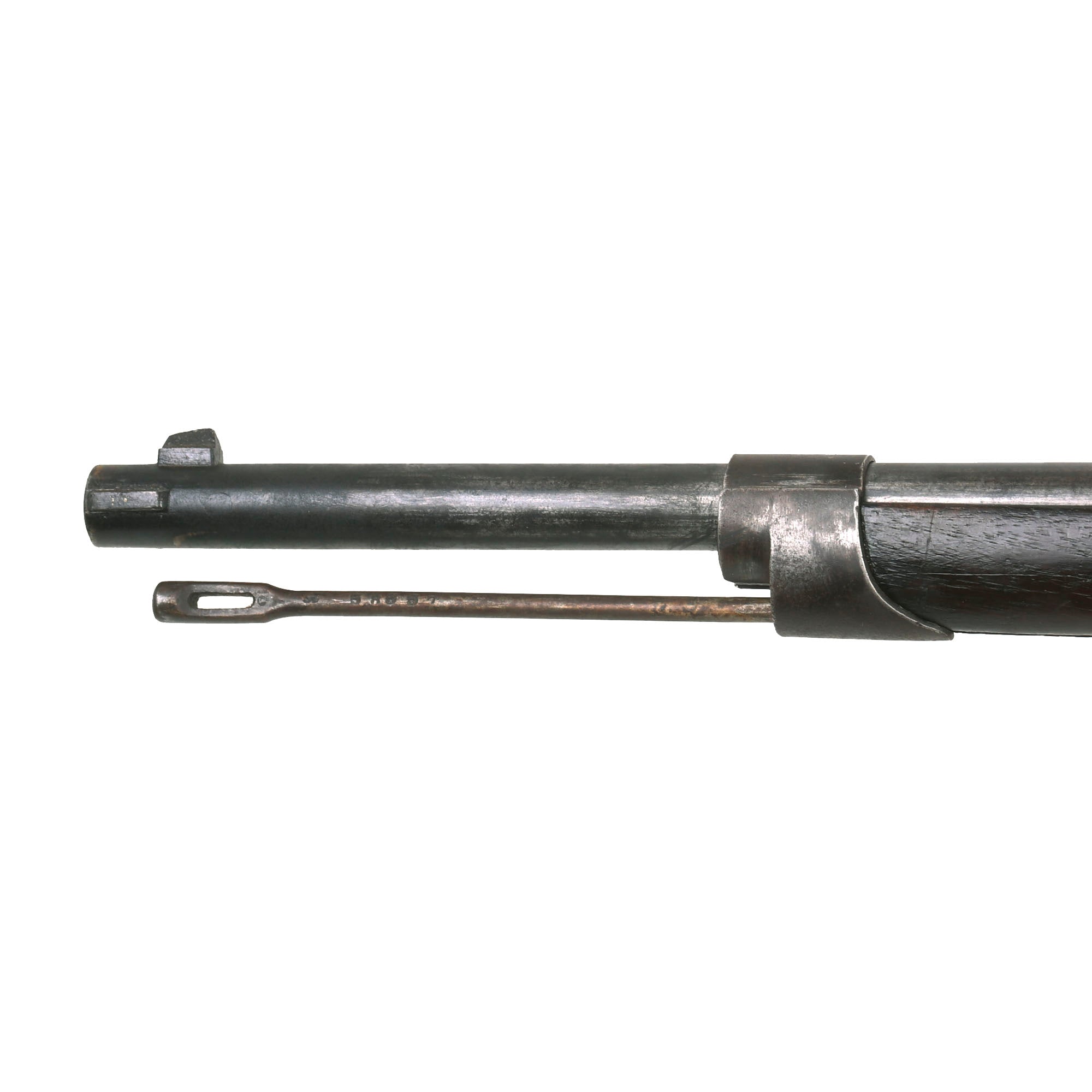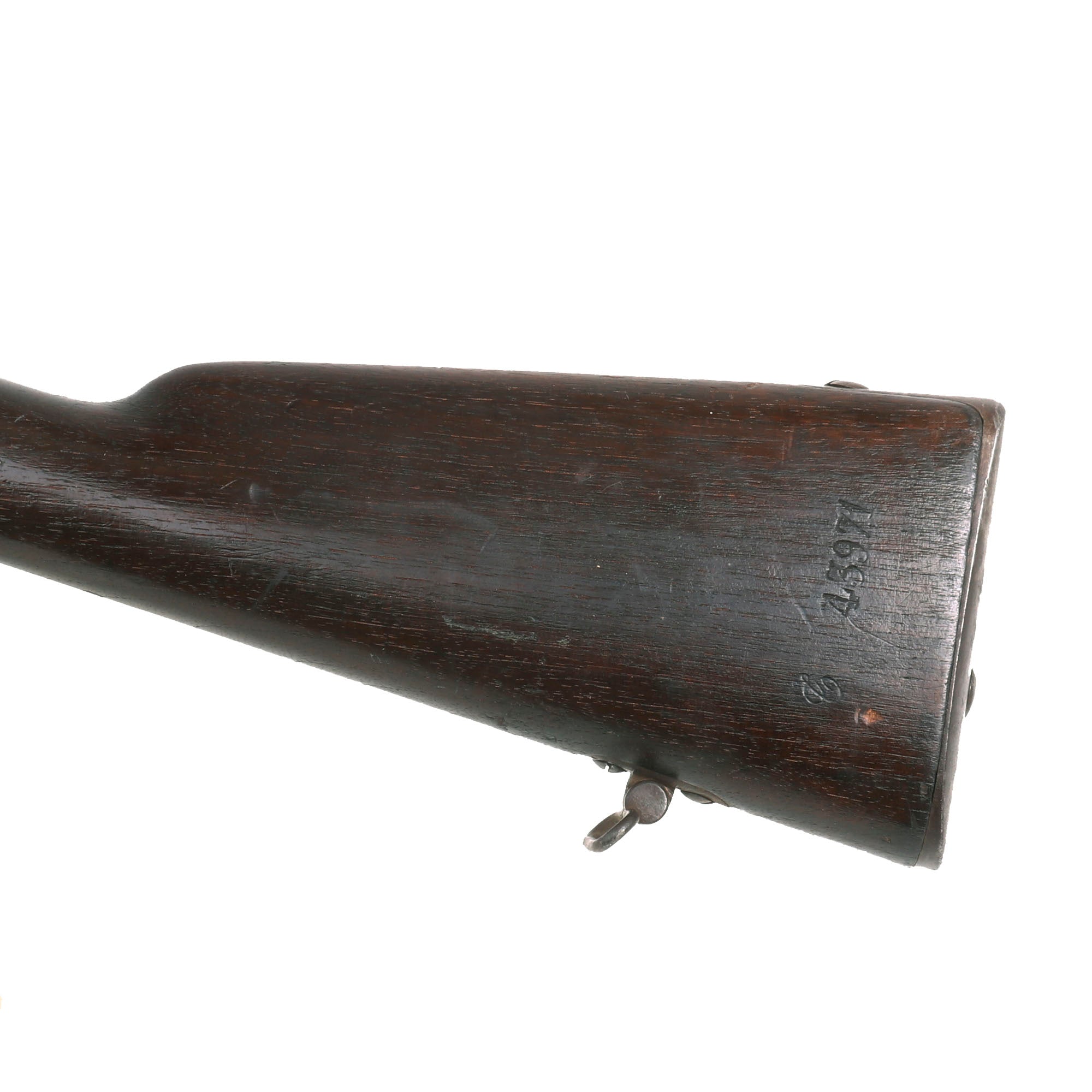 This is a nice service used example of the Fusil Gras Modèle 1874 M80, still relatively clearly marked on the receiver with MANUFACTURE D'ARMES / Tulle, and to the right is the model designation Mle 1874. There does not appear to be any "M80" stamp, so this example did not have the modification done to help with gas escape from the chamber in the case of a ruptured cartridge. The rifle has a clear issue date marking of T. 1879 stamped into the right barrel nocks form, for manufacture at the Imperial Arsenal at Tulle in 1879. There is no "M80" marking, most likely due to the early manufacture date. The left side of the barrel is marked with serial number T 43971, and this same serial number is found on the buttstock, the bolt, the rear sight, and the breech frame, making this an ALL MATCHING example. It comes with all original steel mounts and an intact cleaning rod. Most fittings bear the correct government proof marks, though some are worn.