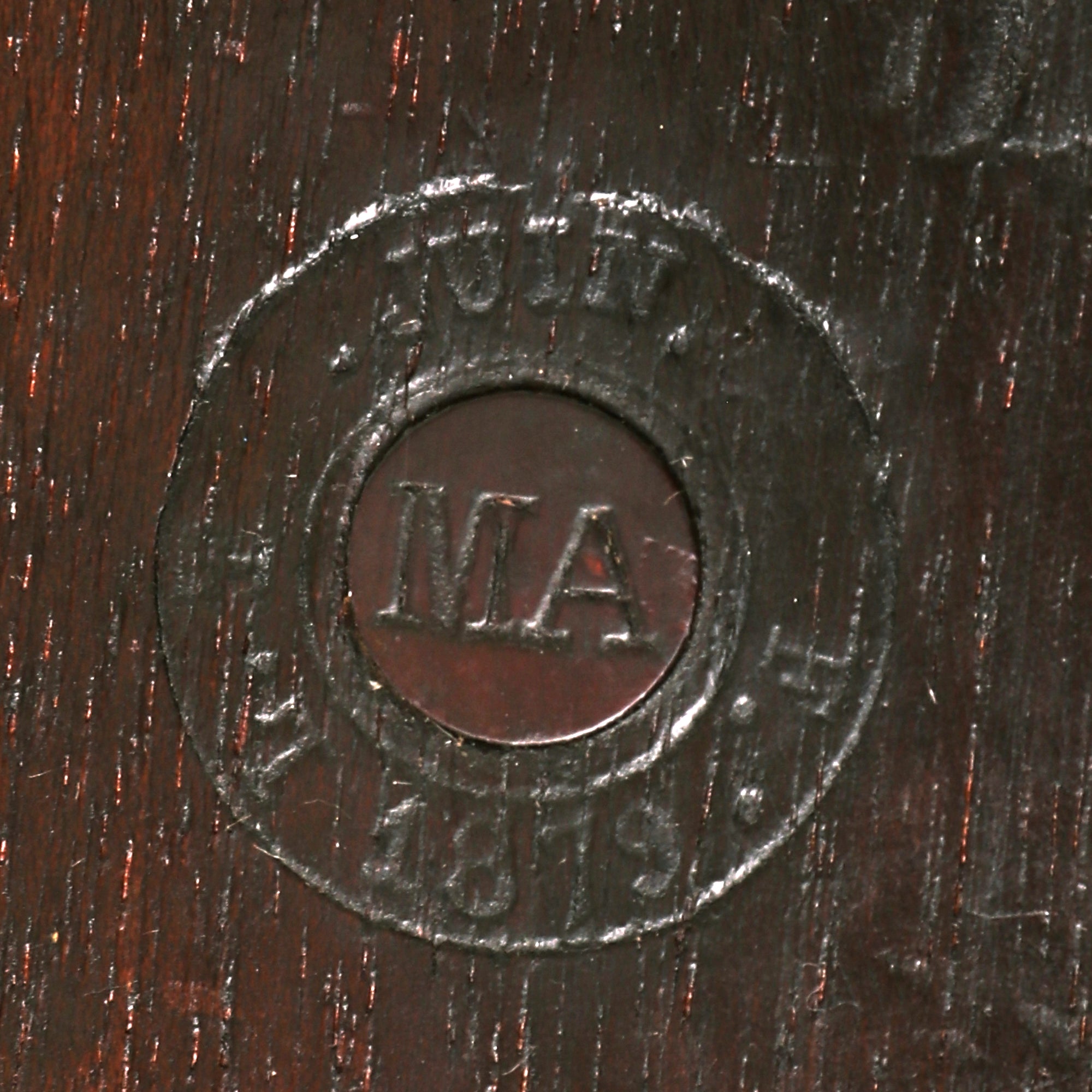 There is a beautiful circular inspector’s cartouche with a small plate on the buttstock, with initials MA on the plate and the text of the cartouche reading L.T. JUIN F. 1879.