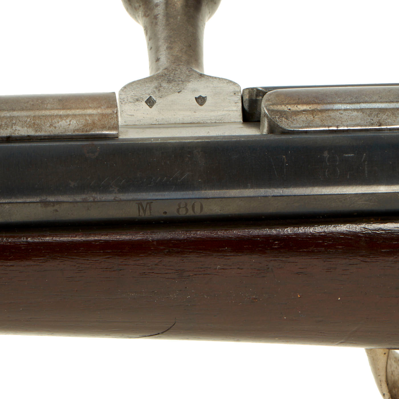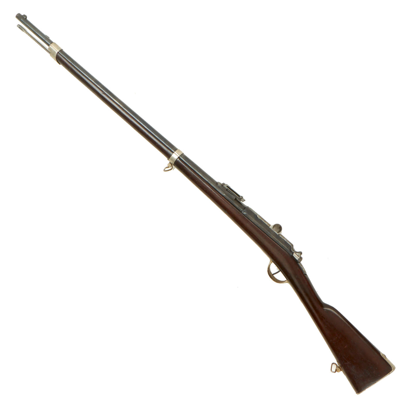 Original item: Only One Available. This is a very good example of the Fusil Gras Modèle 1874 M80, which was later "Dressed Up" for parade use. The receiver, barrel, sight, and cleaning rod were all buffed and heavily blued, which looks great, though it did make the markings faint. The fittings were then nickel plated, and the bolt left as polished bright steel. The stock was also refinished with a brown translucent varnish. This rifle is definitely quite the looker!
