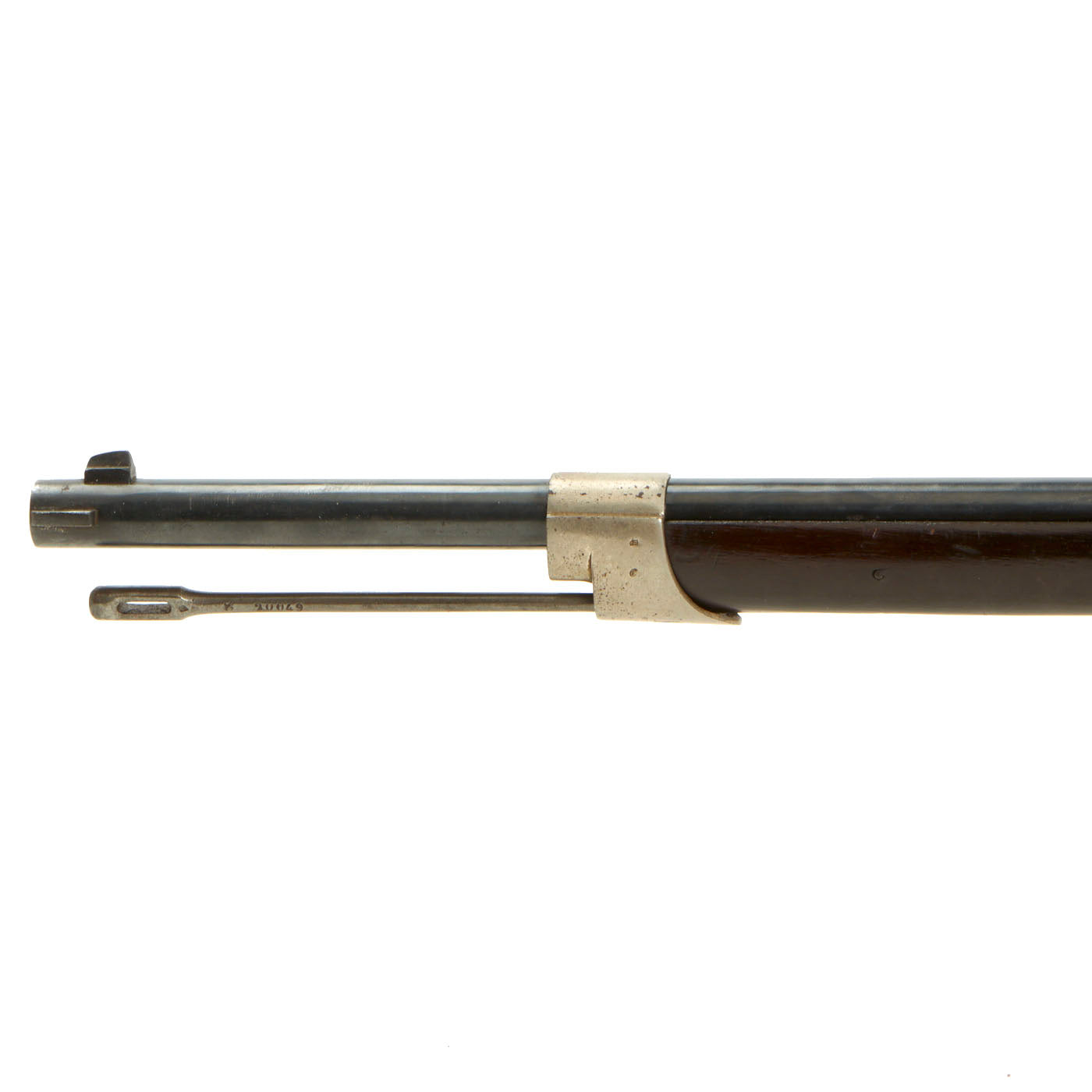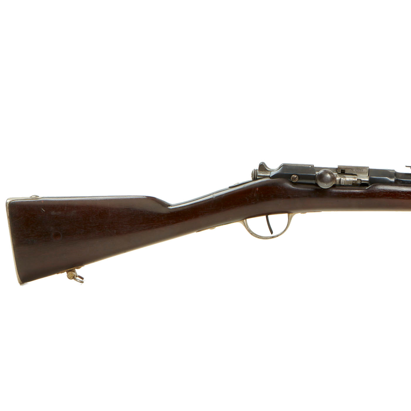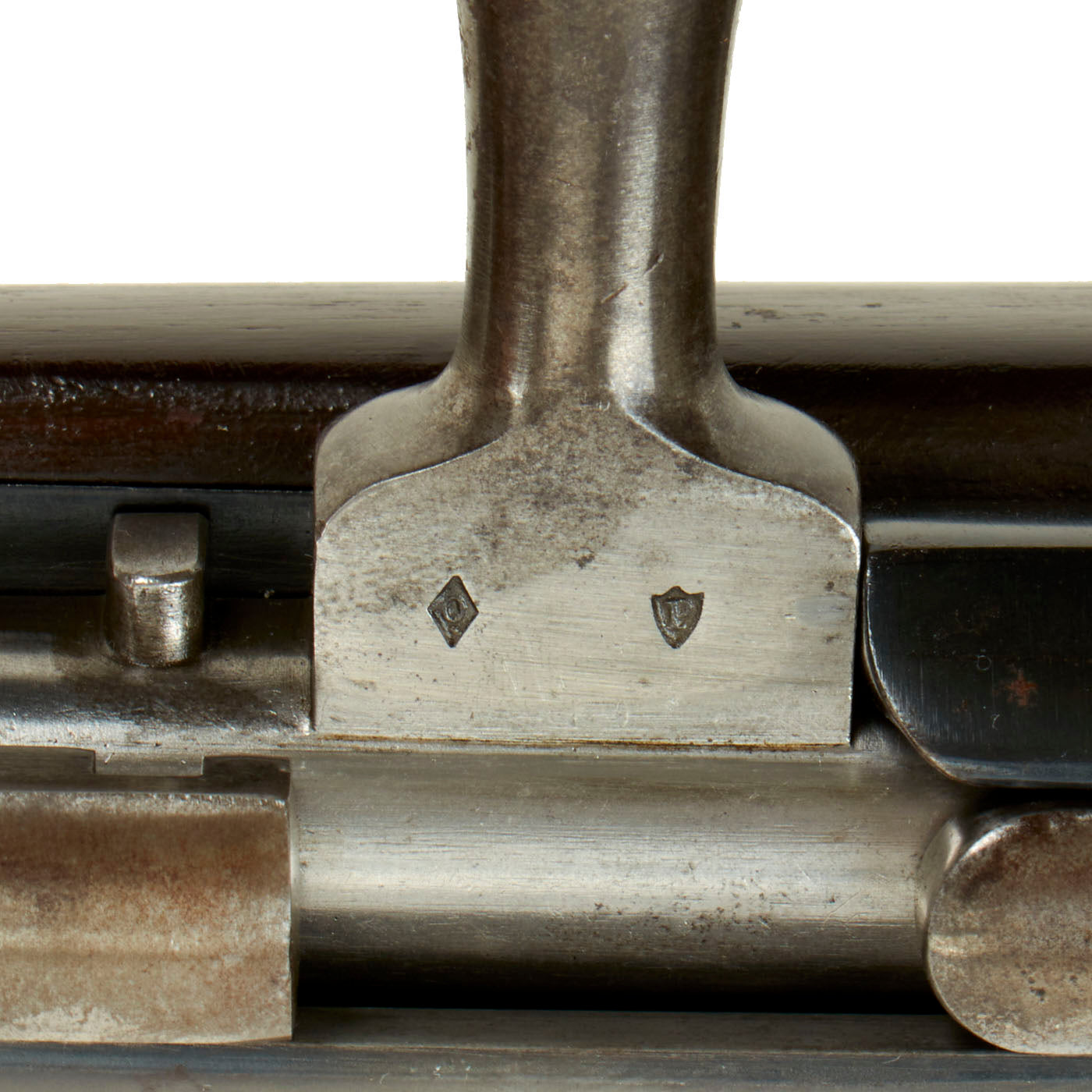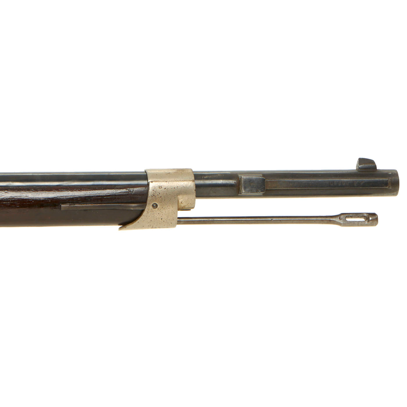 The receiver on the rifle still has traces of the original receiver markings, though they are very faint: MANUFACTURE D'ARMES / Châtellerault over M80, and to the right is the model designation Mle 1874. The rifle has a clear issue date marking of C. 1881 stamped into the right barrel nocks form, for manufacture at the Imperial Arsenal of Châtellerault in 1881. This rifle has mismatched serial numbers, another indication of arsenal reconditioning. Serial number AB 86850 is present on the barrel and bayonet stand, while the bolt and stock are marked with different serial numbers. It comes with all original plated steel mounts and an intact cleaning rod. Most fittings bear the correct government proof marks, though some are worn.