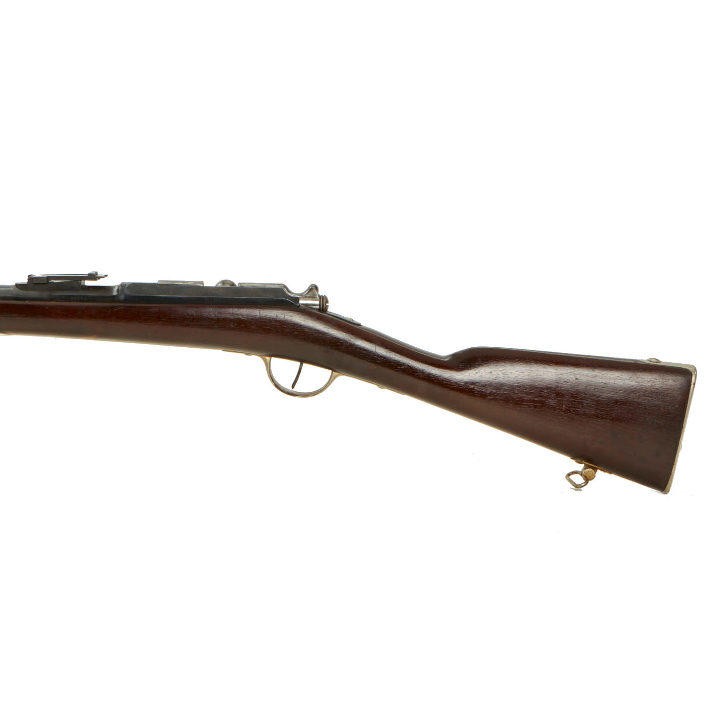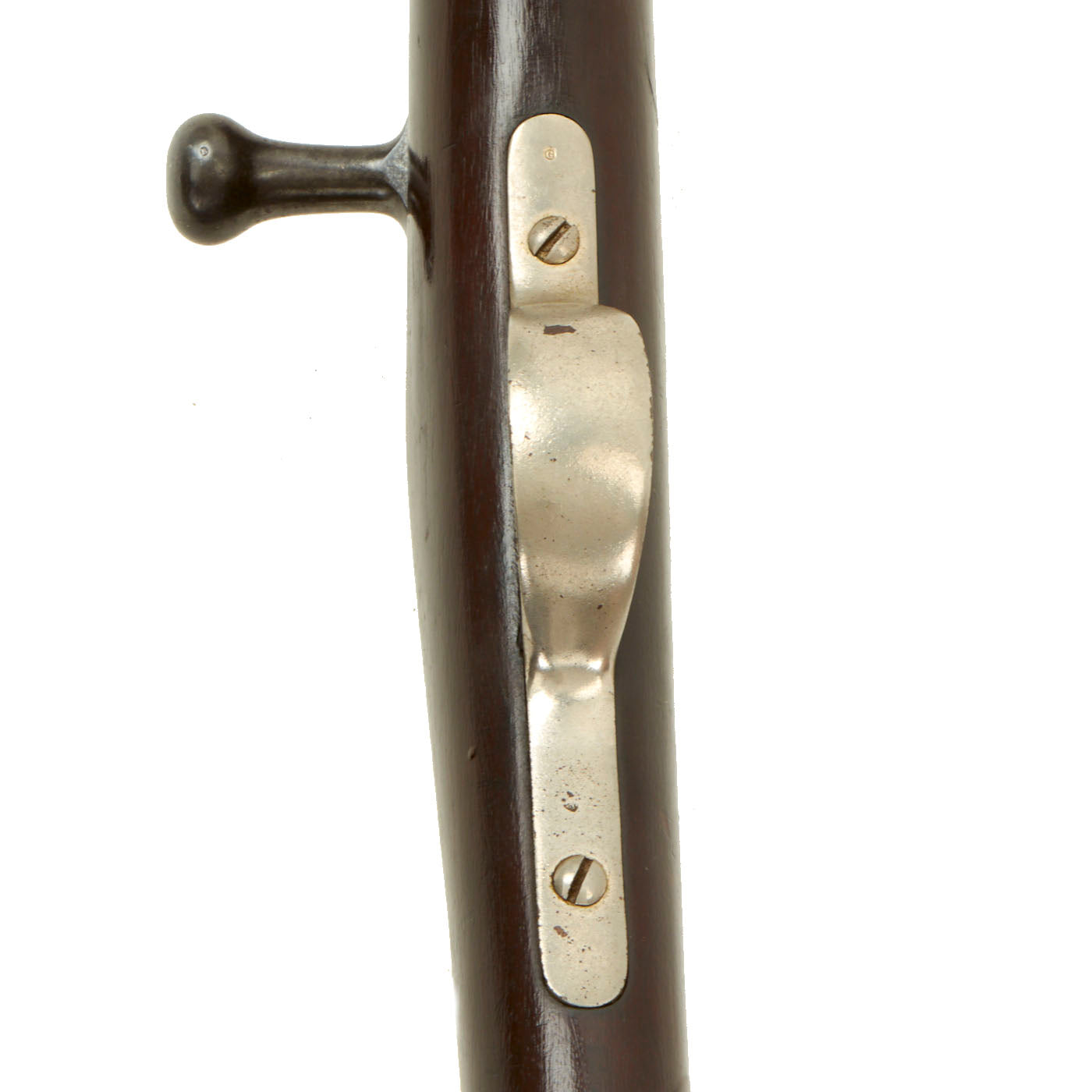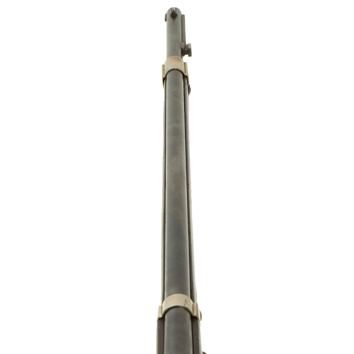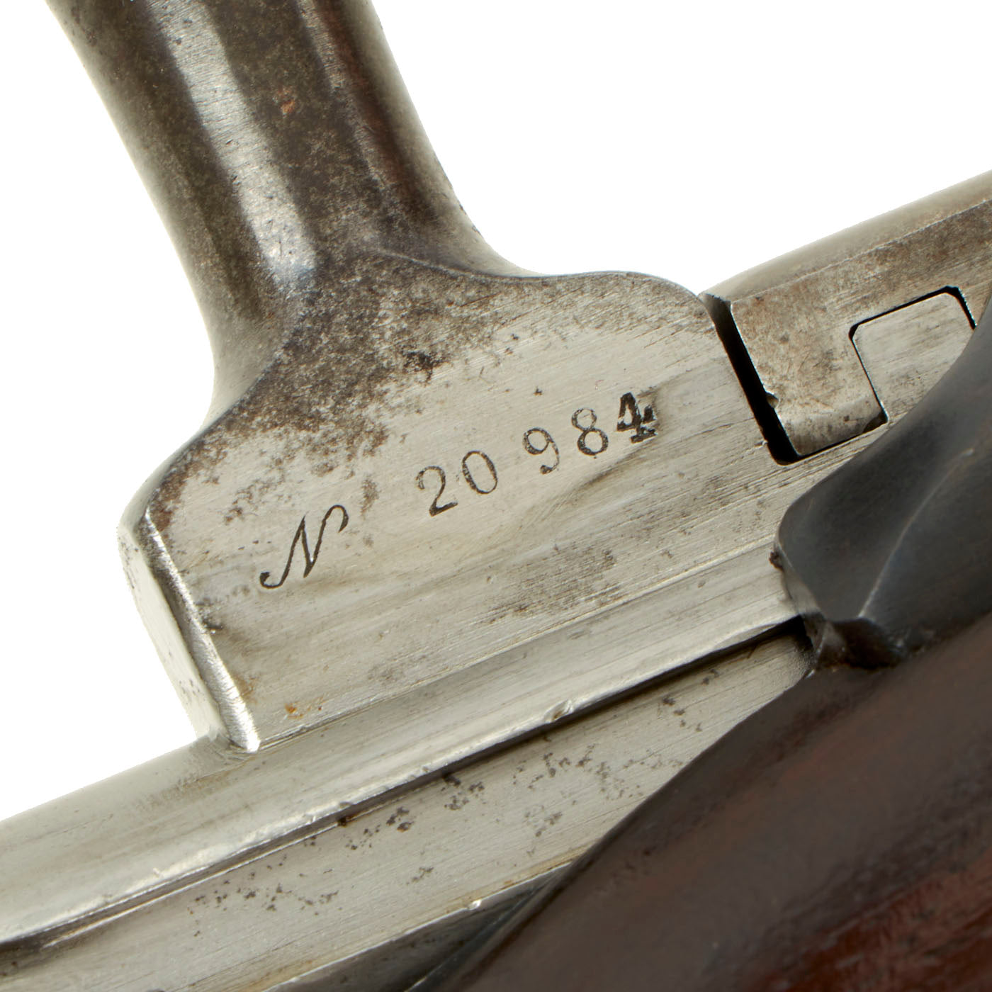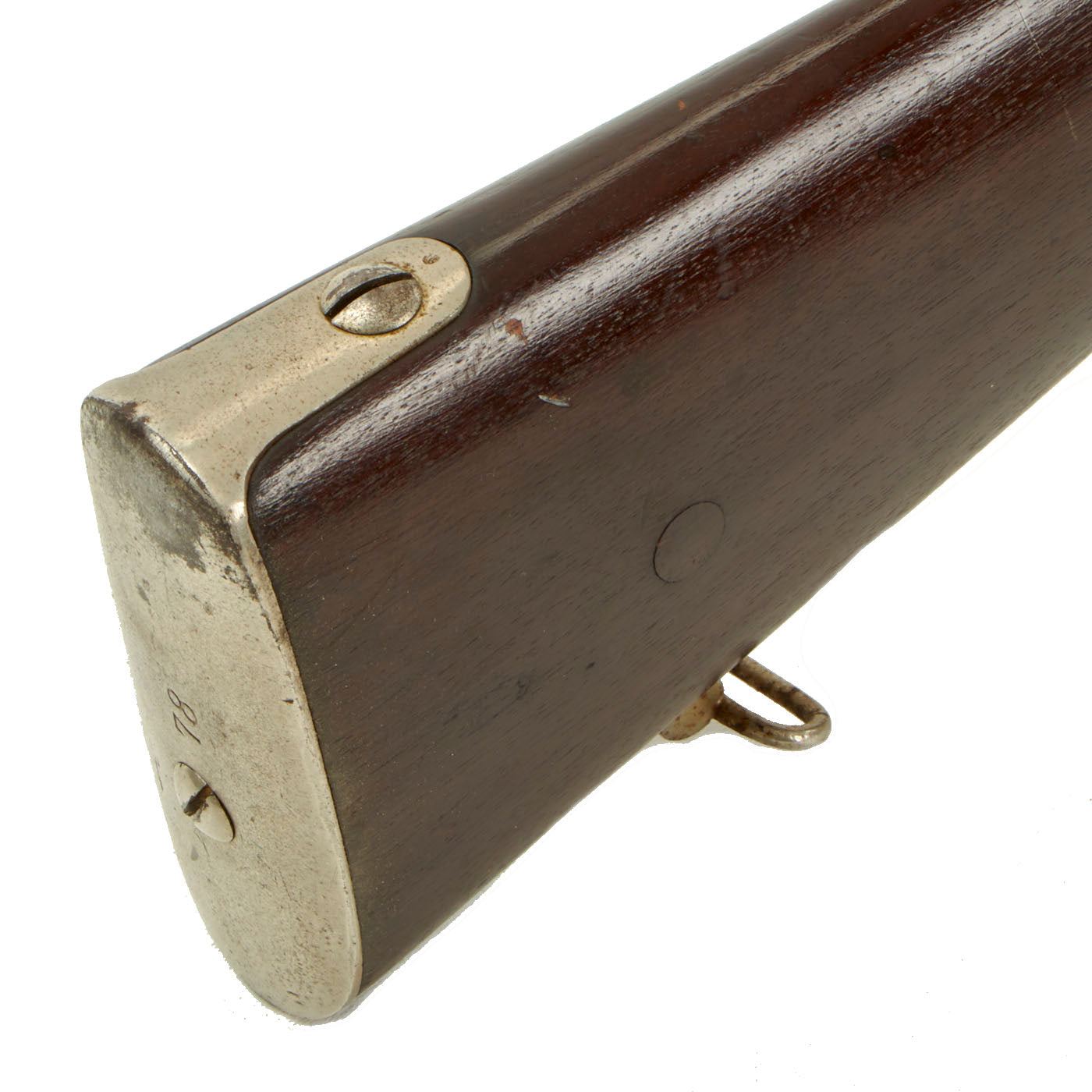 The receiver on the rifle still has traces of the original receiver markings, though they are very faint: MANUFACTURE D'ARMES / Châtellerault over M80, and to the right is the model designation Mle 1874. The rifle has a clear issue date marking of C. 1881 stamped into the right barrel nocks form, for manufacture at the Imperial Arsenal of Châtellerault in 1881. This rifle has mismatched serial numbers, another indication of arsenal reconditioning. Serial number AB 86850 is present on the barrel and bayonet stand, while the bolt and stock are marked with different serial numbers. It comes with all original plated steel mounts and an intact cleaning rod. Most fittings bear the correct government proof marks, though some are worn.