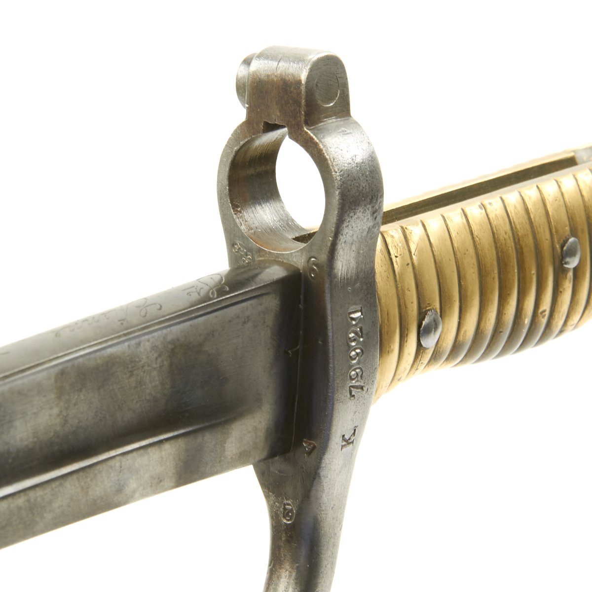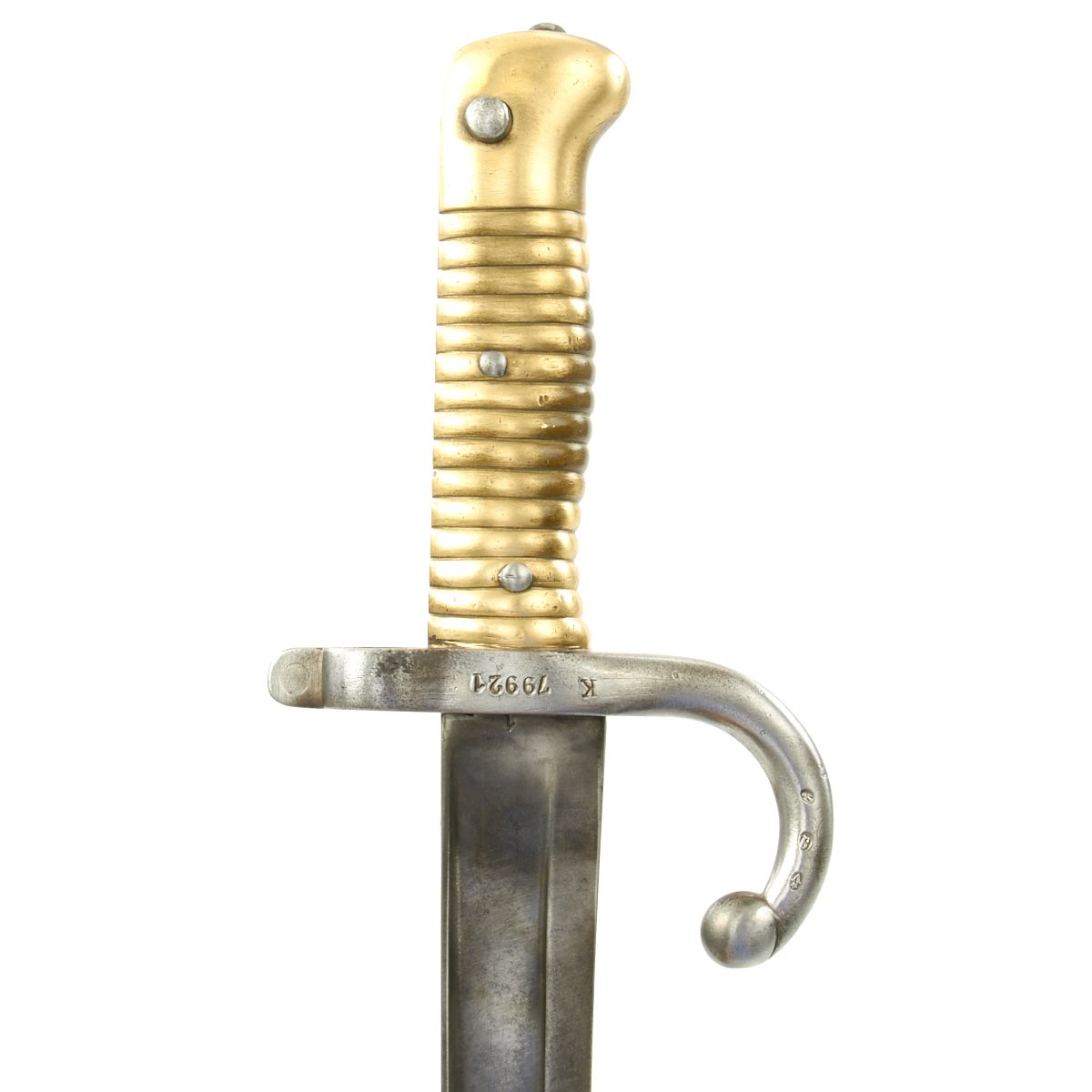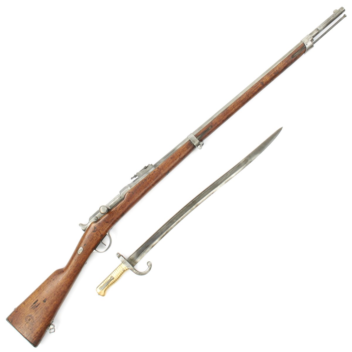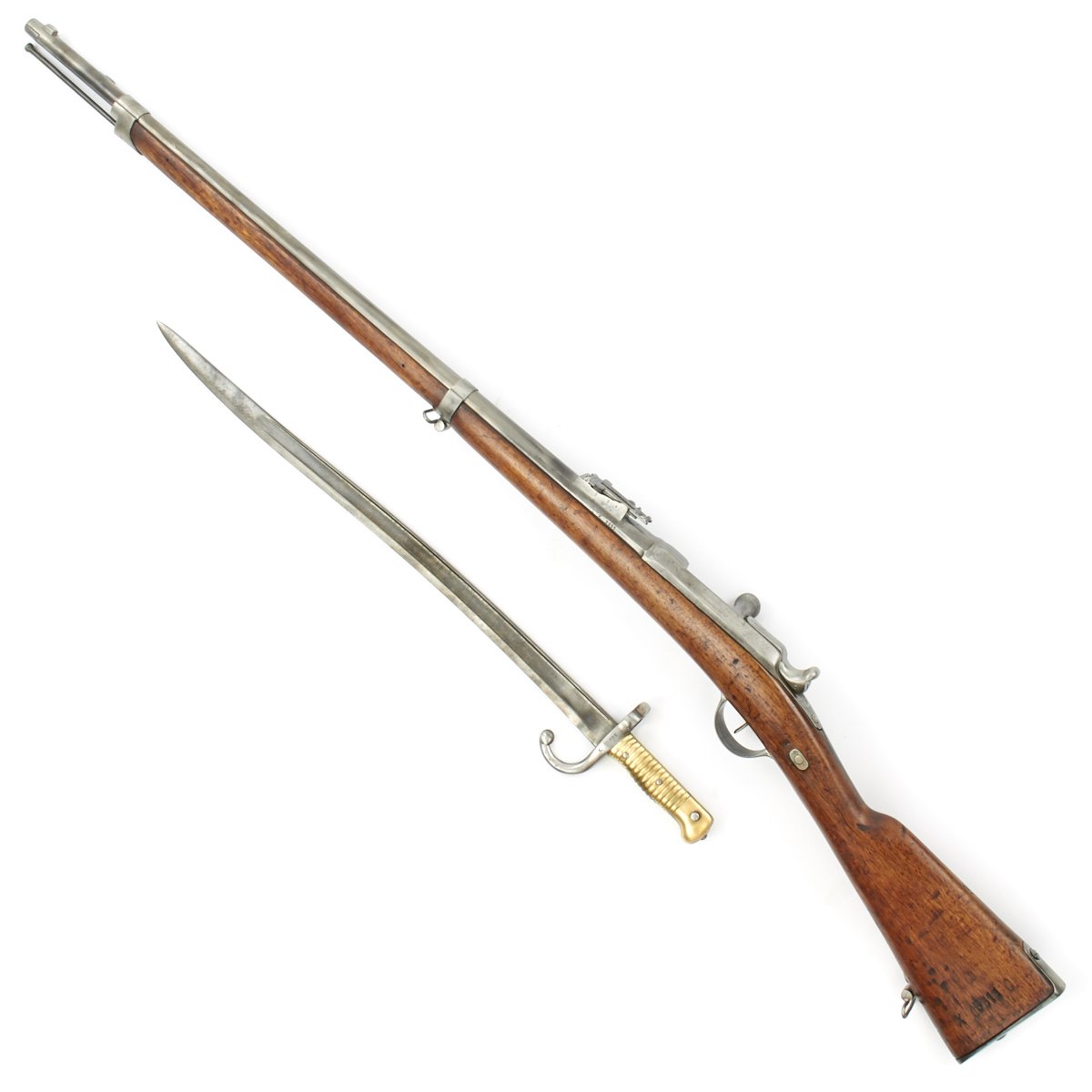 Included with this rifle a correct issue Yataghan-Bladed Model M1866 Chassepot sword bayonet. This bayonet is in good condition, with a nice blade with a peppery patina of age. The spine of the bayonet is marked Saint-Étienne Mai 1871, indicating manufacture at the arsenal in Saint-Étienne, during May 1871. There are also numerous proof marks on the blade and cross guard.