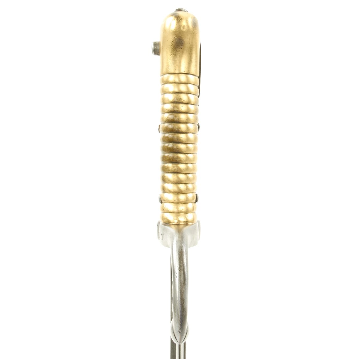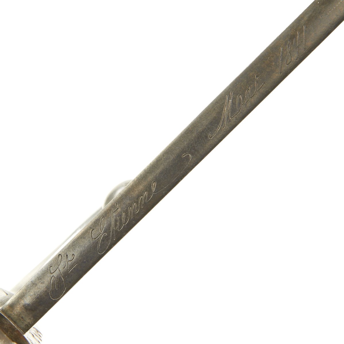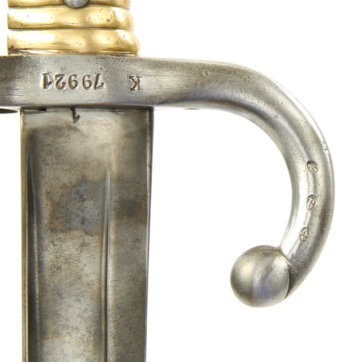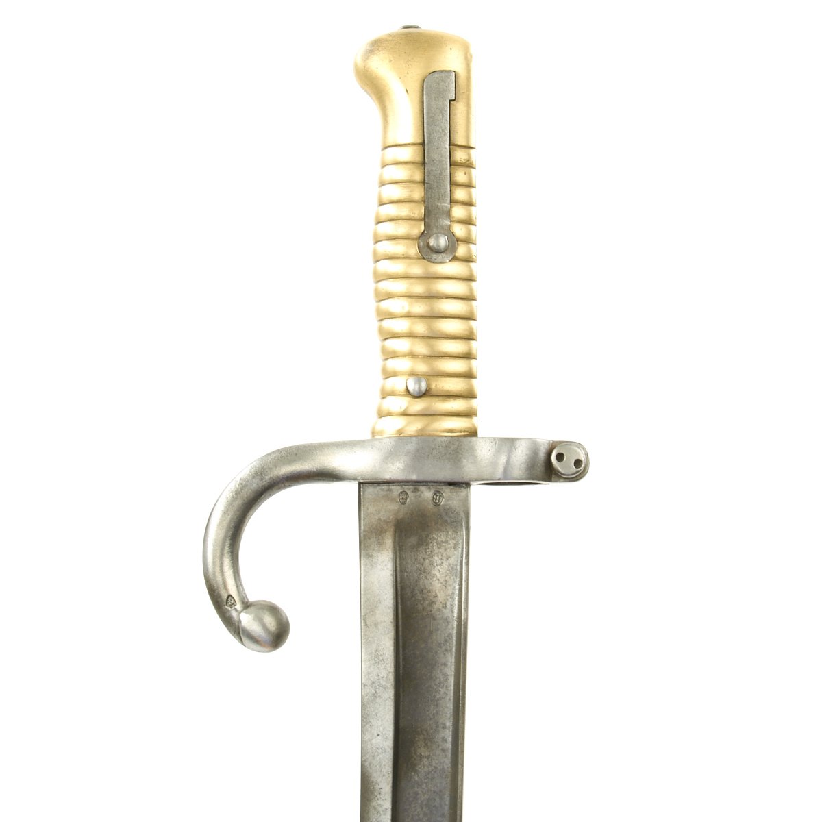 Included with this rifle a correct issue Yataghan-Bladed Model M1866 Chassepot sword bayonet. This bayonet is in good condition, with a nice blade with a peppery patina of age. The spine of the bayonet is marked Saint-Étienne Mai 1871, indicating manufacture at the arsenal in Saint-Étienne, during May 1871. There are also numerous proof marks on the blade and cross guard.