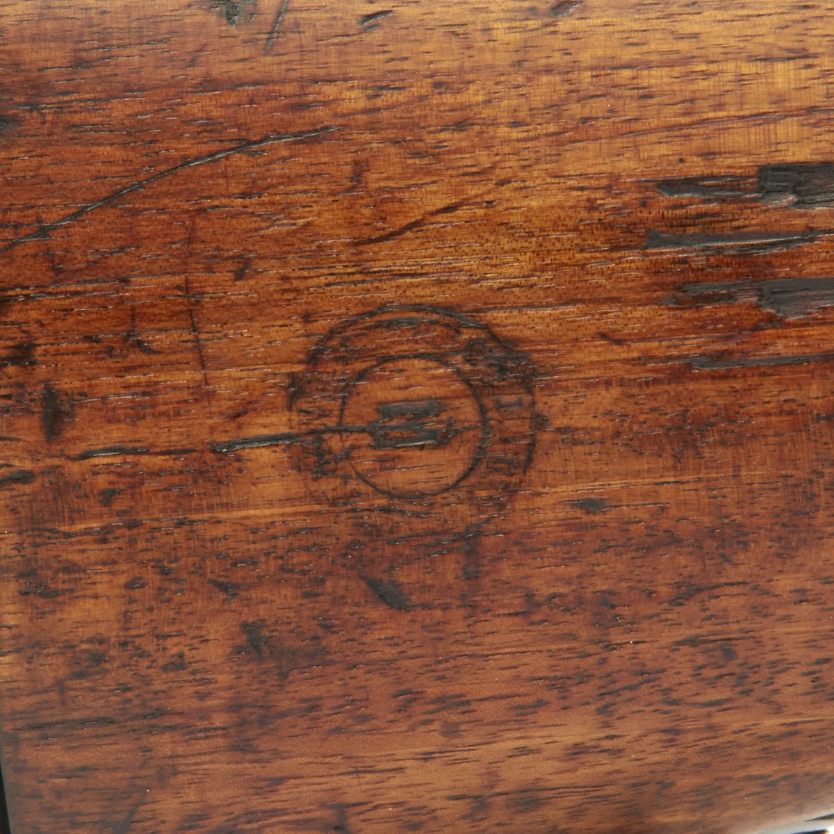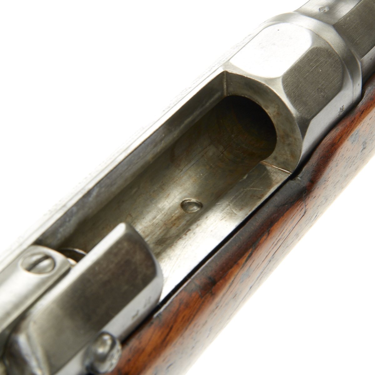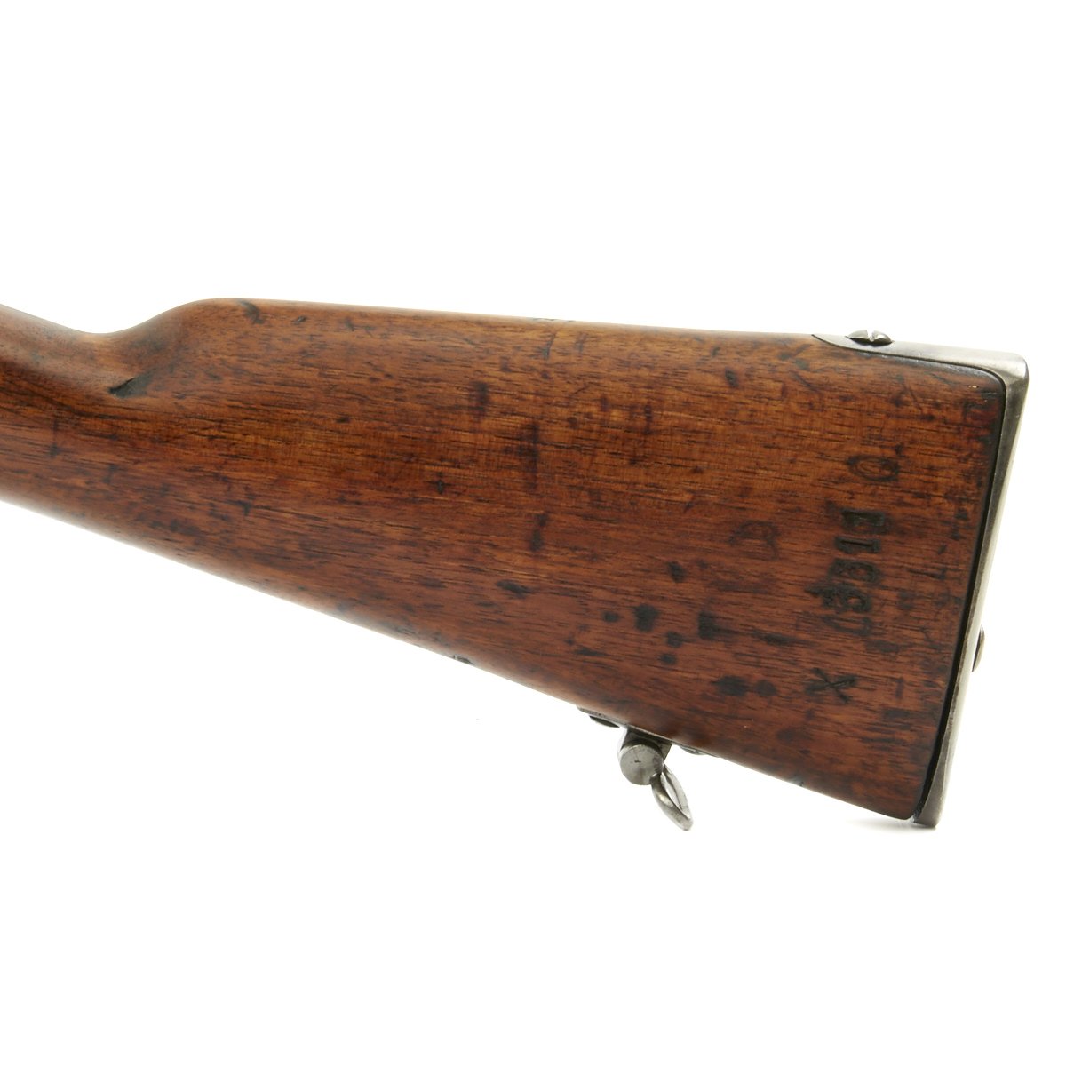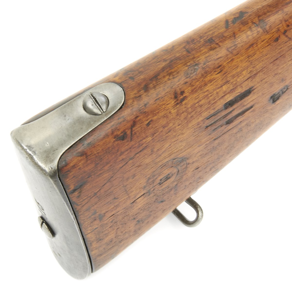 The rifle bears French proofs along with French military and acceptance markings. These are present on most of the metal components of the rifle. The bore is in good condition, with clear lands and grooves, but some wear and definitely a bit of light oxidation in places. the stock has been refinished several times, so the markings are faint, and it has a few cracks and repairs in places. Still it has a very nice color, with a great look of age.