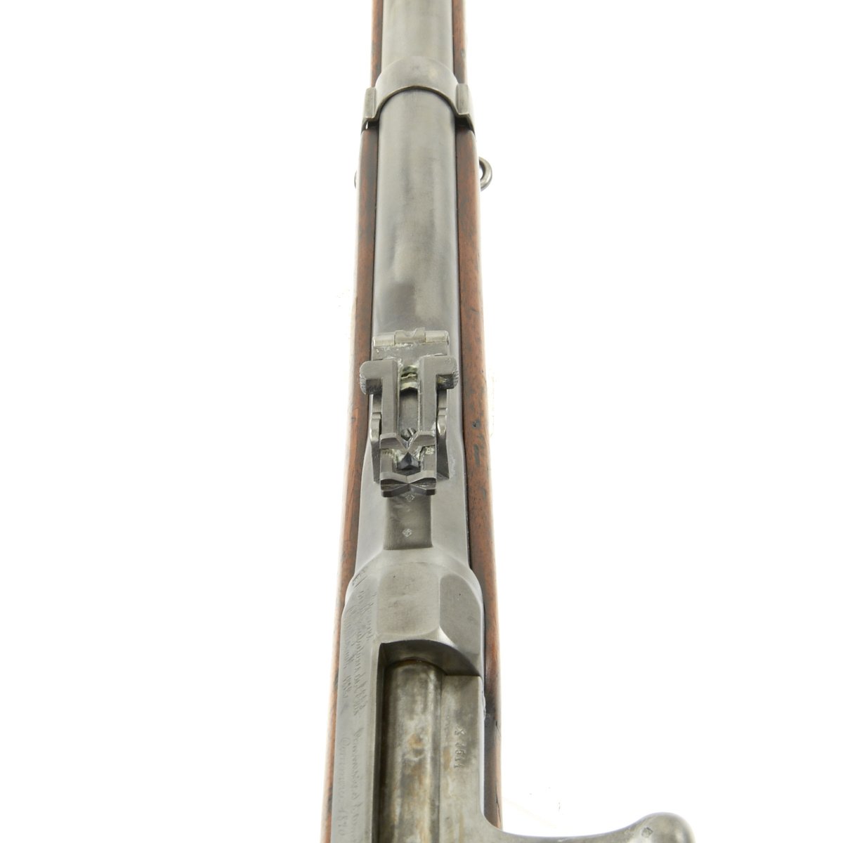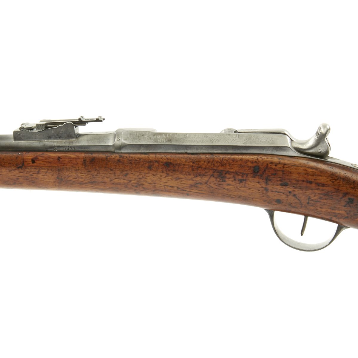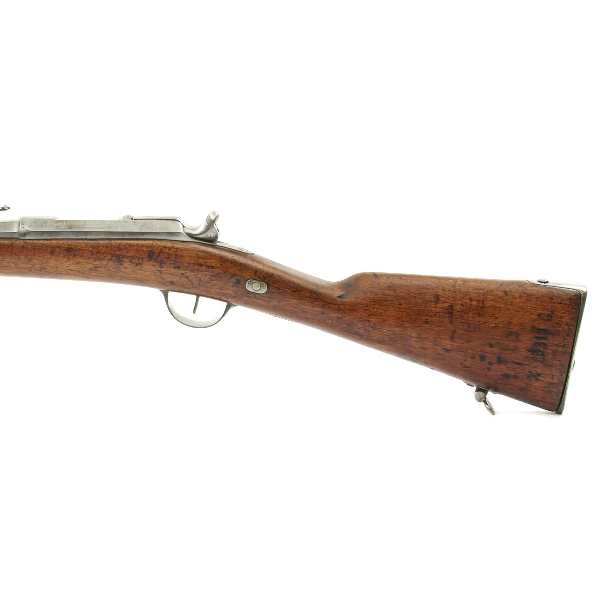 This Chassepot Rifle is actually dated 1870/71 and was most likely produced directly as a result of the uprising. It has some very interesting markings on the receiver, a rare contractor who produced these rifles, Commission d'Armement Commerce 1870-1871, as well as with MLE 1866. This was one private firm that the French government contracted to meet the increased demand while the new factory at St-Etienne was being completed. To the Left of the markings are additional script markings: Epreuve des Manufres. d'armes Châtellerault 1872, which indicates that the rifle was tested at the French Arsenal in Châtellerault in 1872.