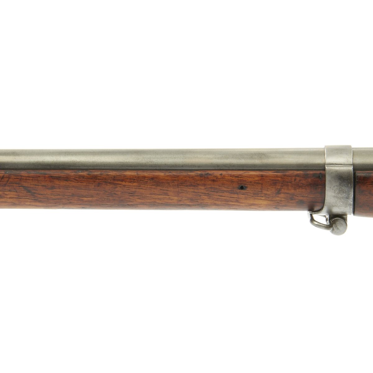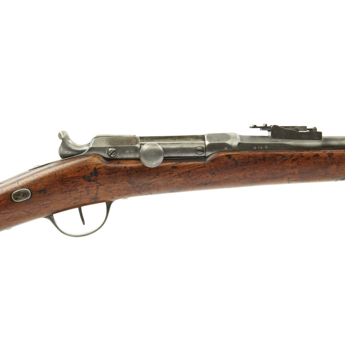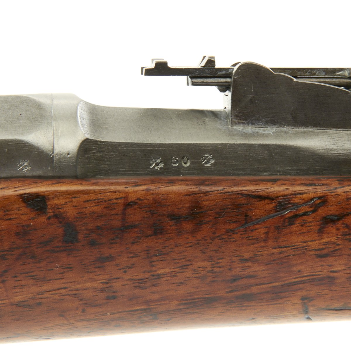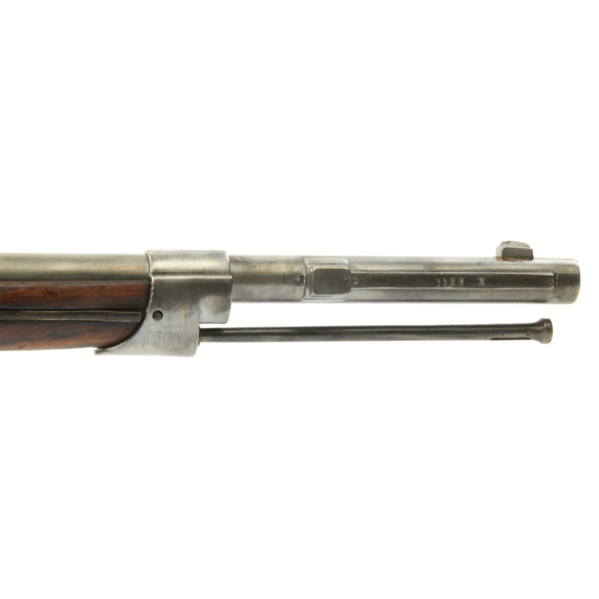 This Chassepot Rifle is actually dated 1870/71 and was most likely produced directly as a result of the uprising. It has some very interesting markings on the receiver, a rare contractor who produced these rifles, Commission d'Armement Commerce 1870-1871, as well as with MLE 1866. This was one private firm that the French government contracted to meet the increased demand while the new factory at St-Etienne was being completed. To the Left of the markings are additional script markings: Epreuve des Manufres. d'armes Châtellerault 1872, which indicates that the rifle was tested at the French Arsenal in Châtellerault in 1872.