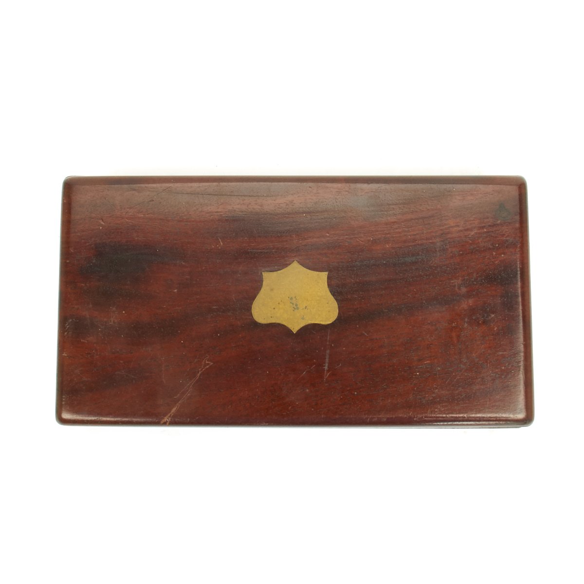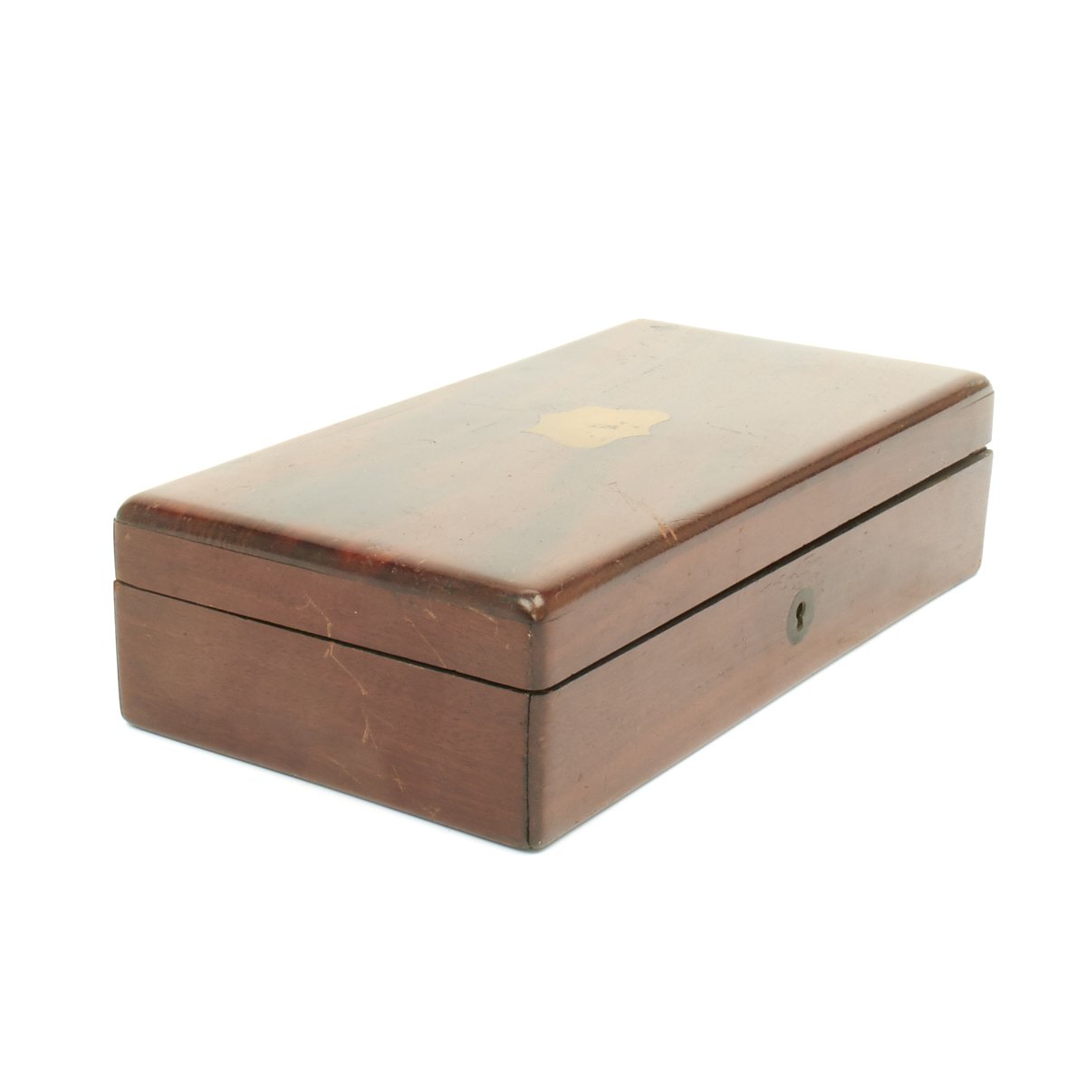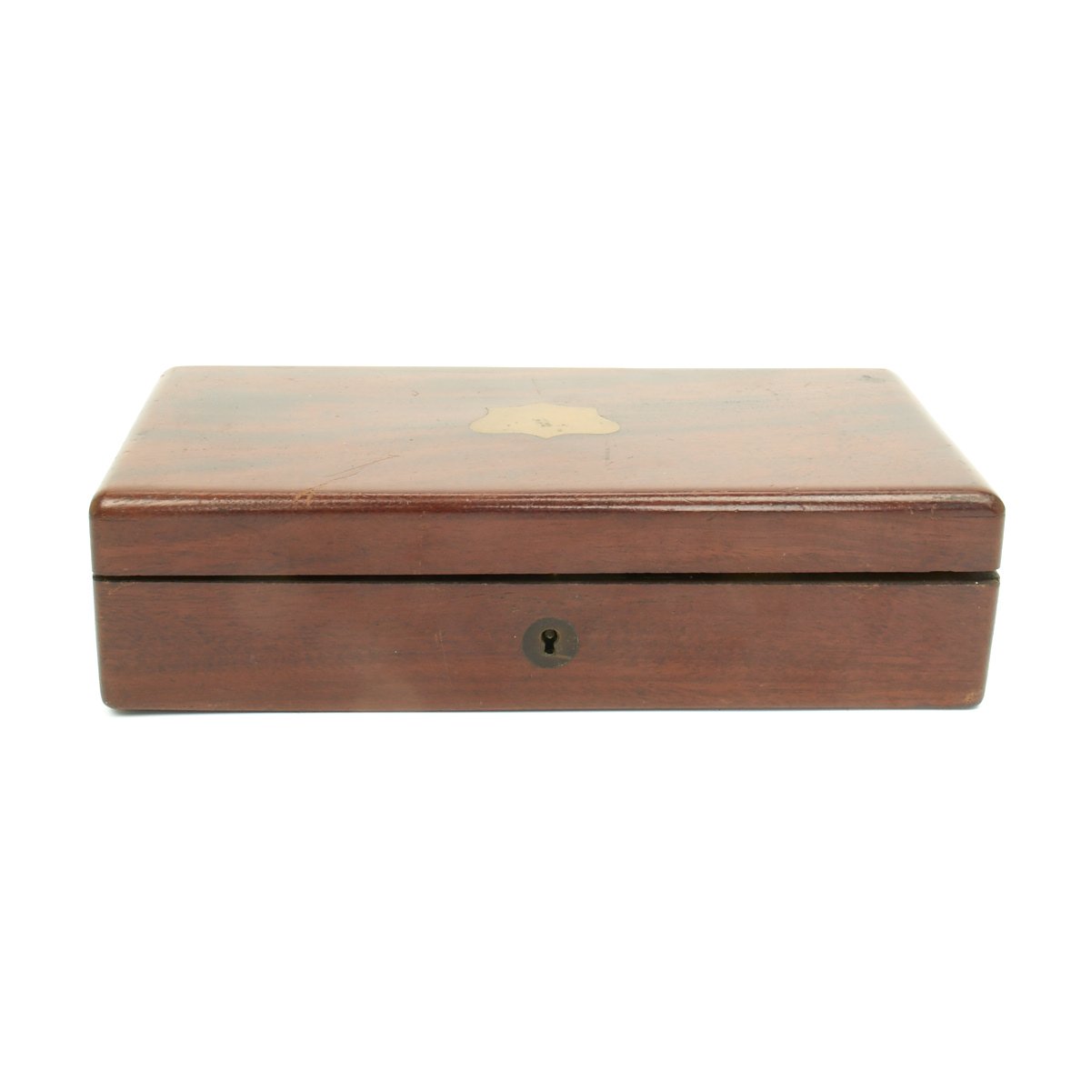 It comes complete with a very attractive purple velvet-lined locking wooden case, measuring approximately 9" x 5" x 2". We unfortunately do not have the key. The interior has spaces for the pistol, the included cleaning rod, and the ebony-handled screwdriver. There is also a compartment on the left for storing cartridges.