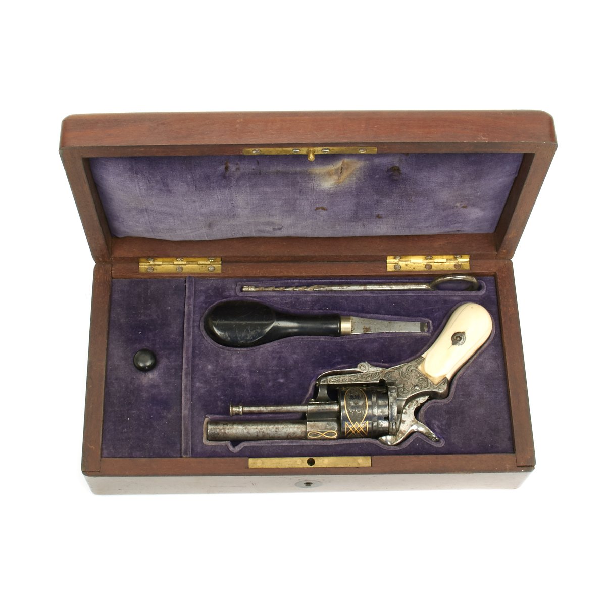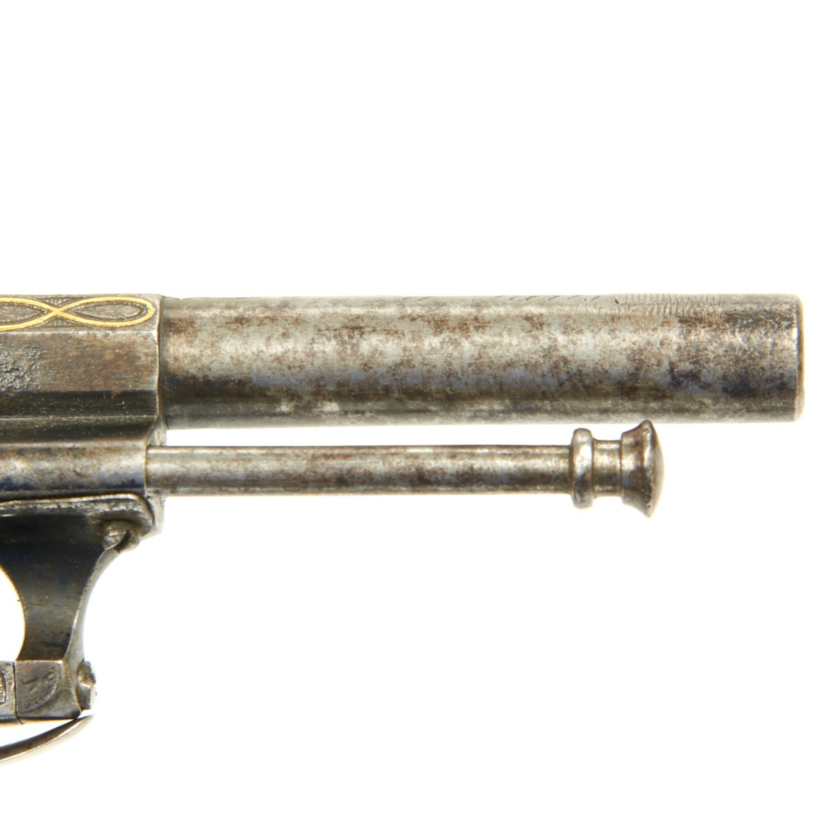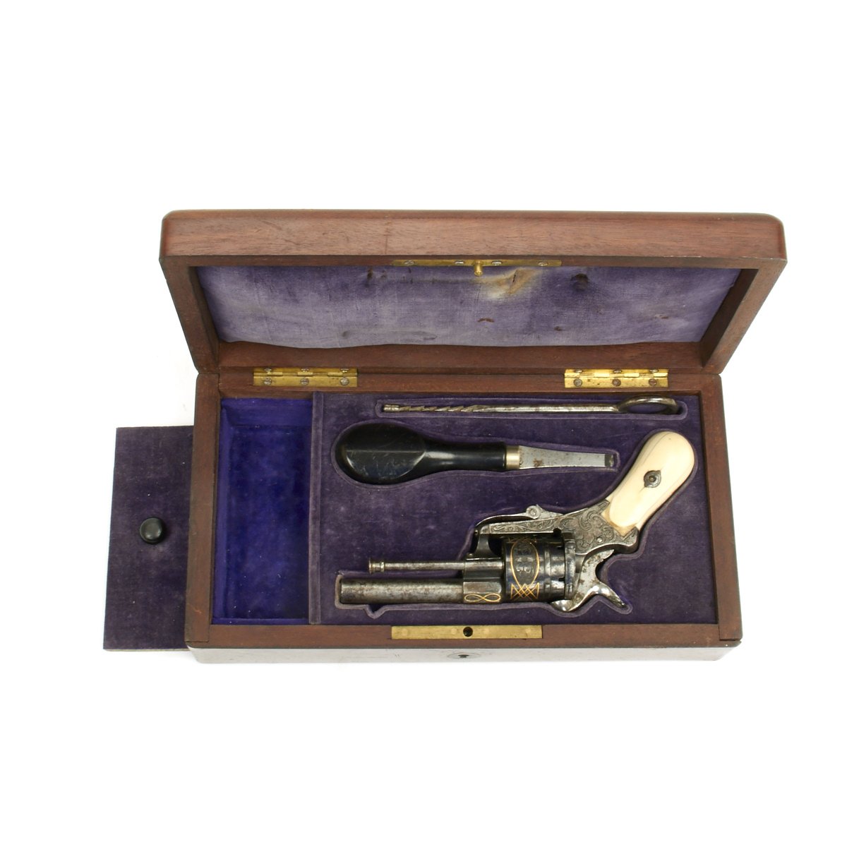 The fore sight has been filed off, which enhances its concealment properties, as the foresight could snag as it was being drawn. It is signed by the very famous Parisian Gunsmith on the barrel: Devisime a Paris for Louis Francois Devisme, considered one of France's leading Gun smiths, who worked from the 1830s until the 1880s. Revolver is in good working order showing little use, cartridge gate spring appears absent but otherwise excellent.