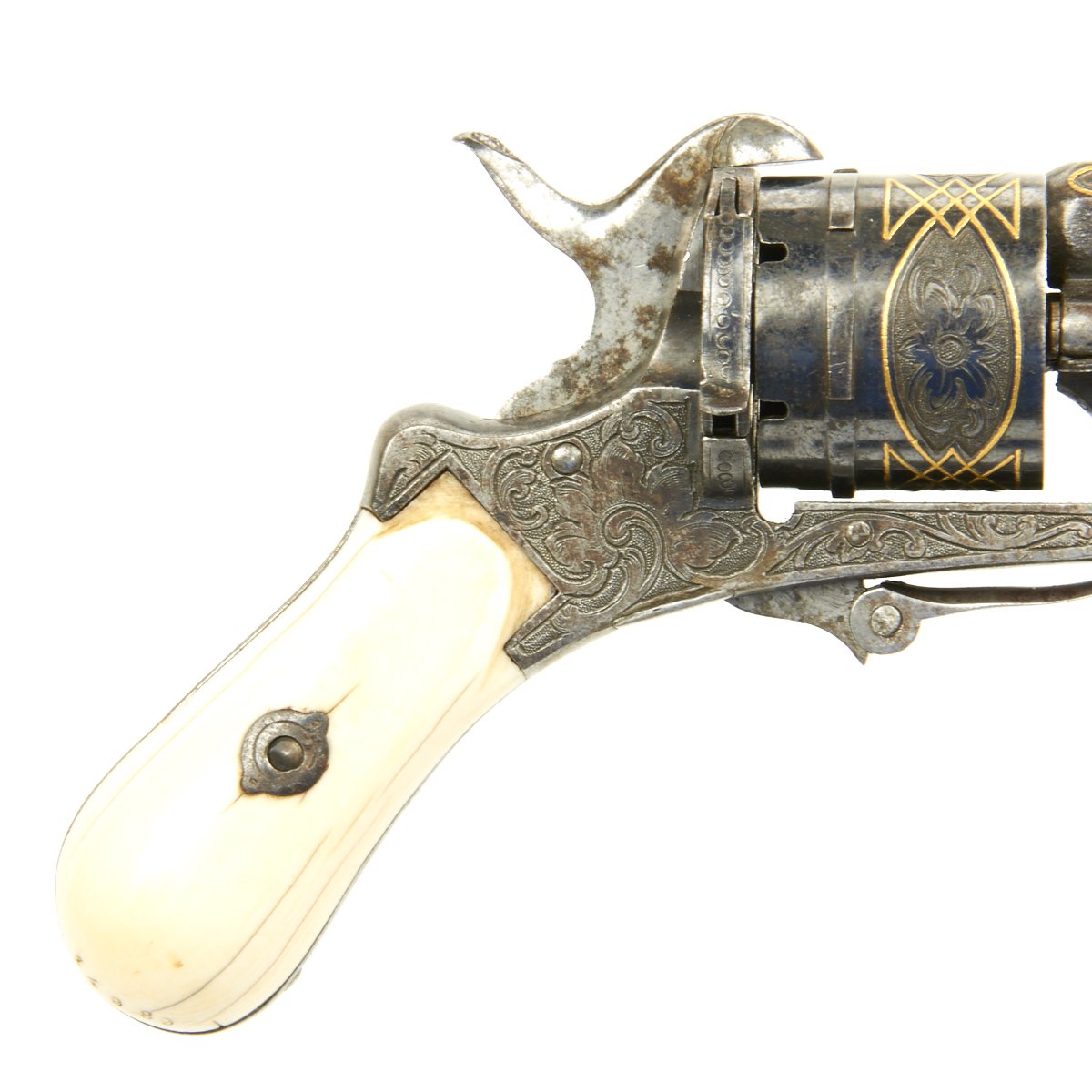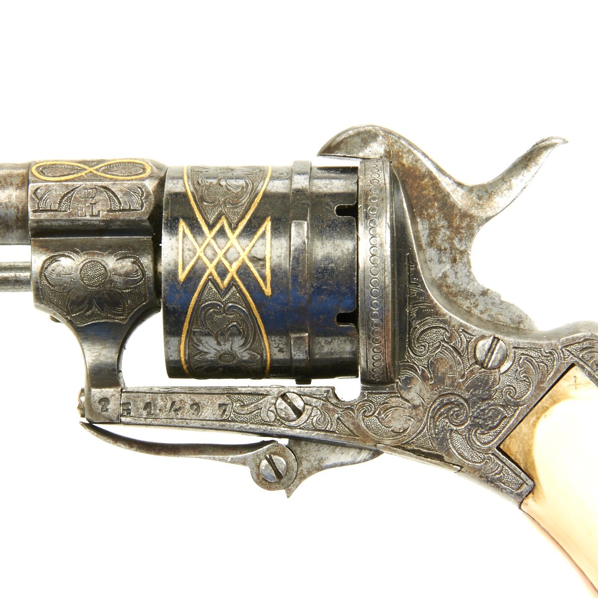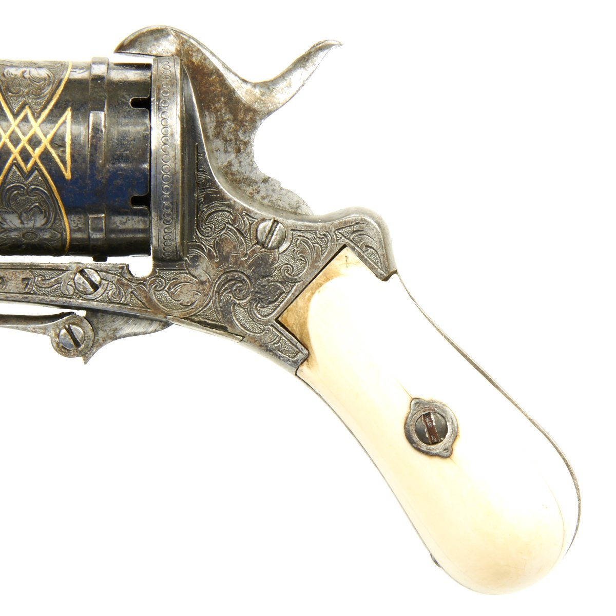 This is a truly beautiful little PIN FIRE Revolver, all engraved and then with GOLD inlay on the engraved cylinder also. It has a 2 3/4 inch barrel and overall length of about 6 1/2 inches. The bag grips are very old Ivory and the revolver comes with a folding trigger for easy concealment. Revolver is marked with serial number 231497 on the frame below the cylinder, and marked with 14989 on the bottom of the grips.