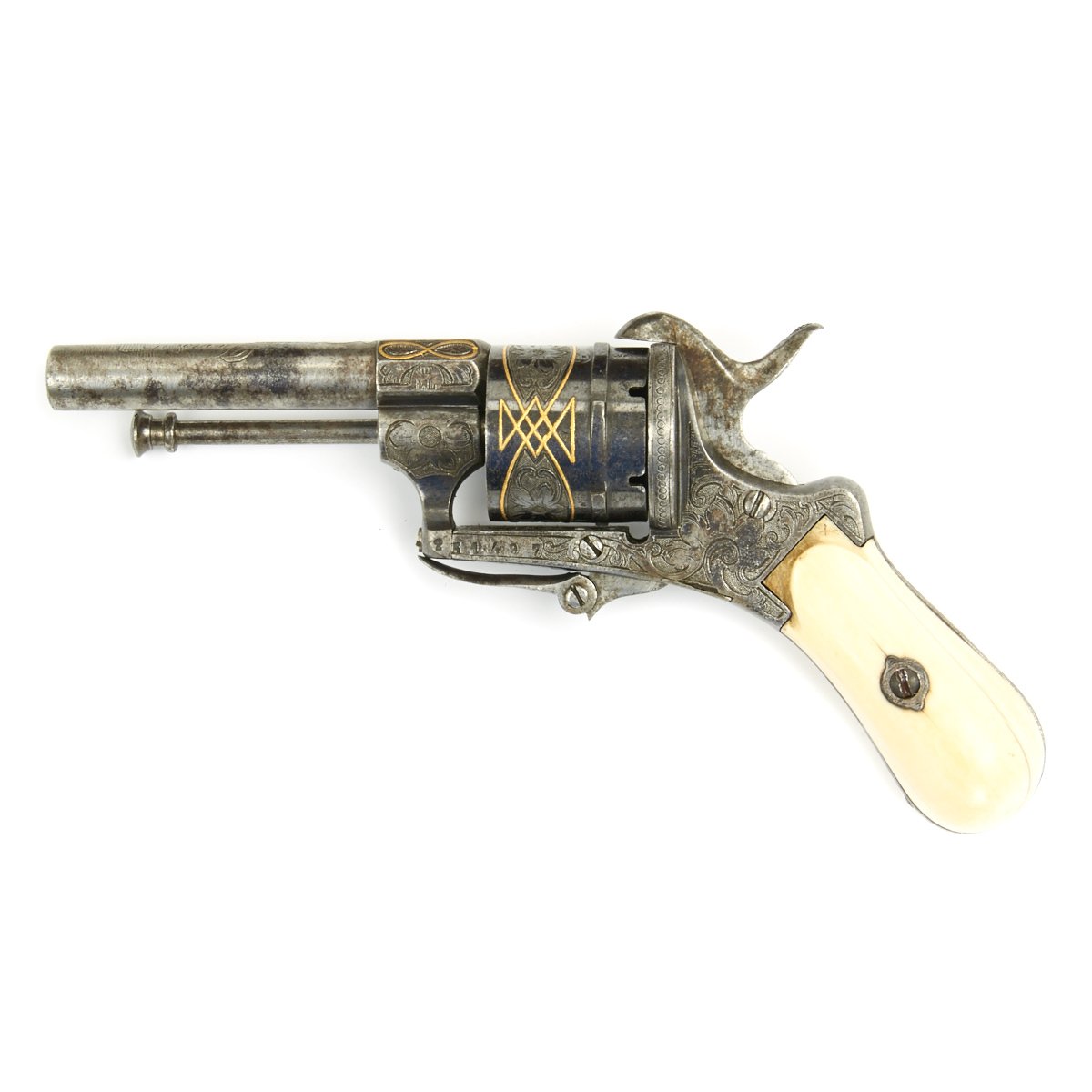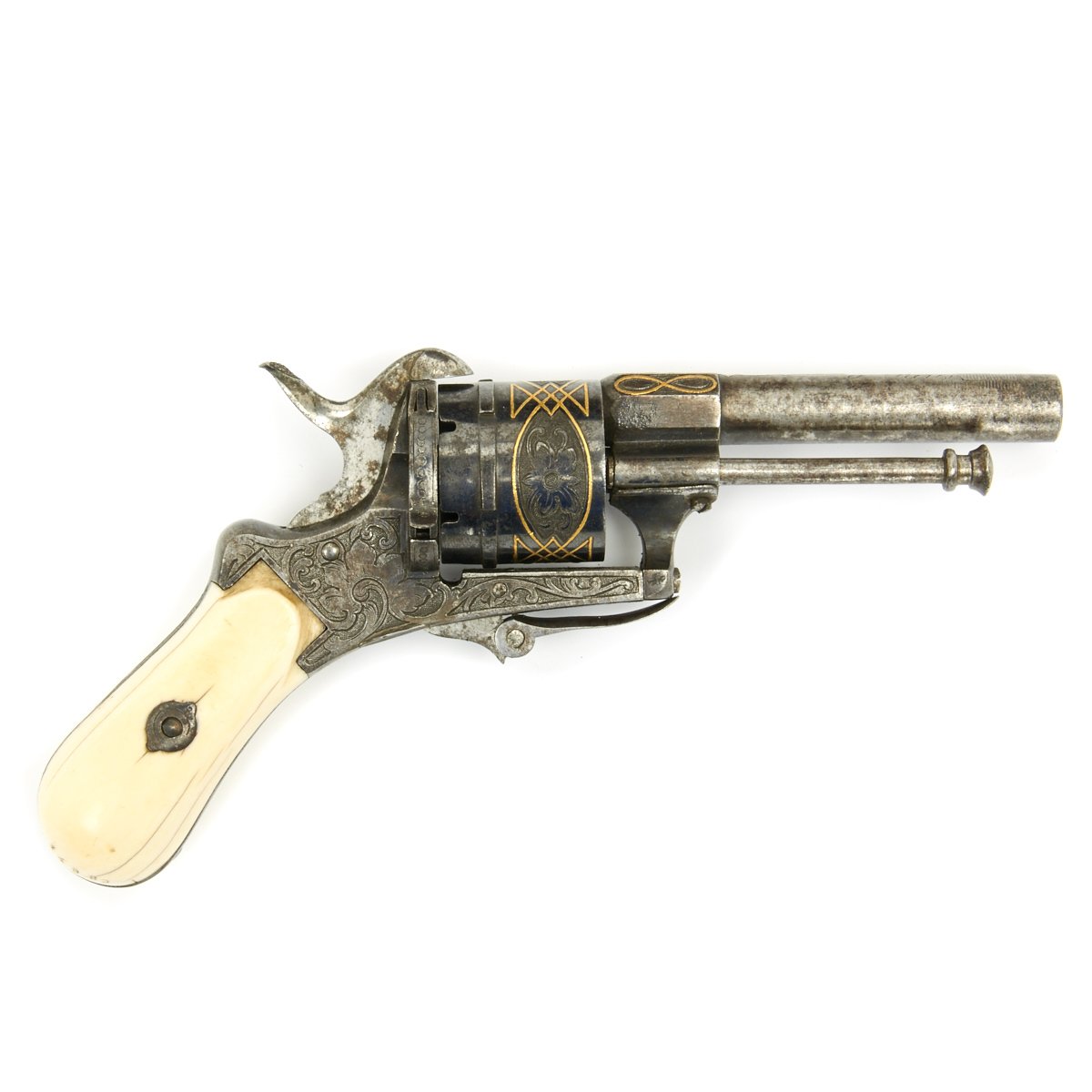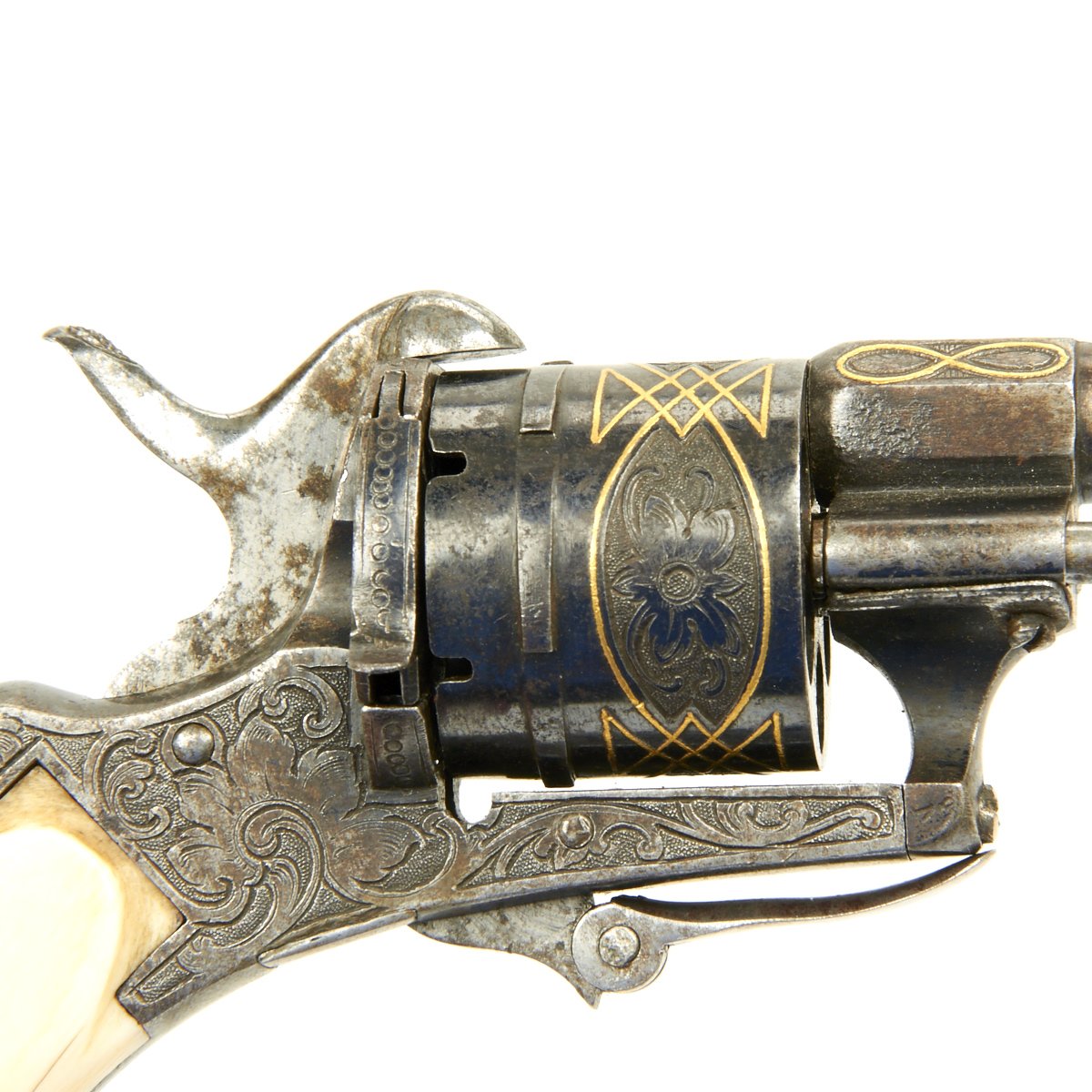 This is a truly beautiful little PIN FIRE Revolver, all engraved and then with GOLD inlay on the engraved cylinder also. It has a 2 3/4 inch barrel and overall length of about 6 1/2 inches. The bag grips are very old Ivory and the revolver comes with a folding trigger for easy concealment. Revolver is marked with serial number 231497 on the frame below the cylinder, and marked with 14989 on the bottom of the grips.