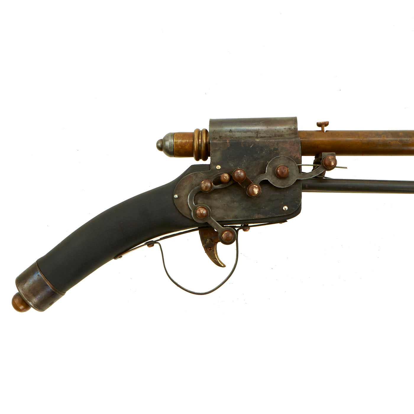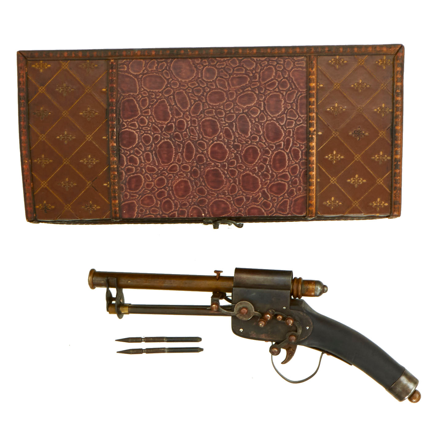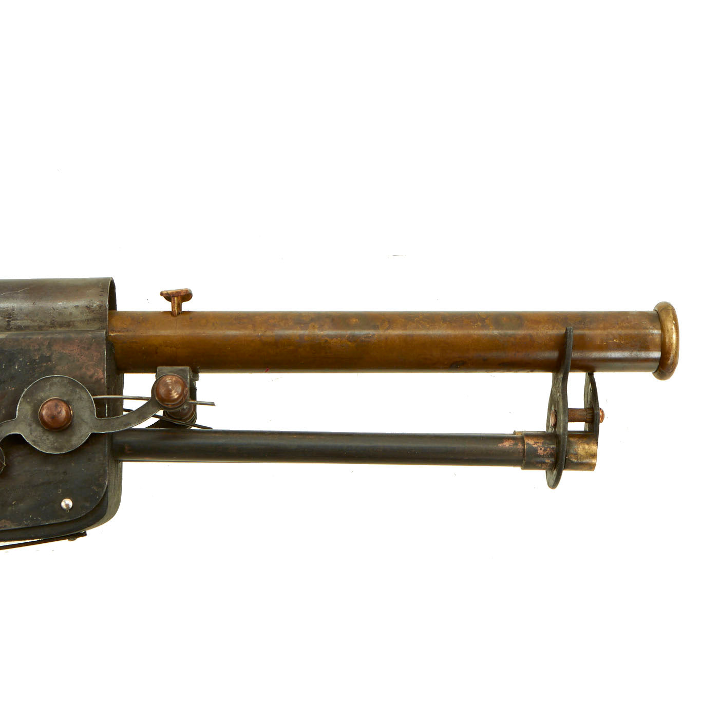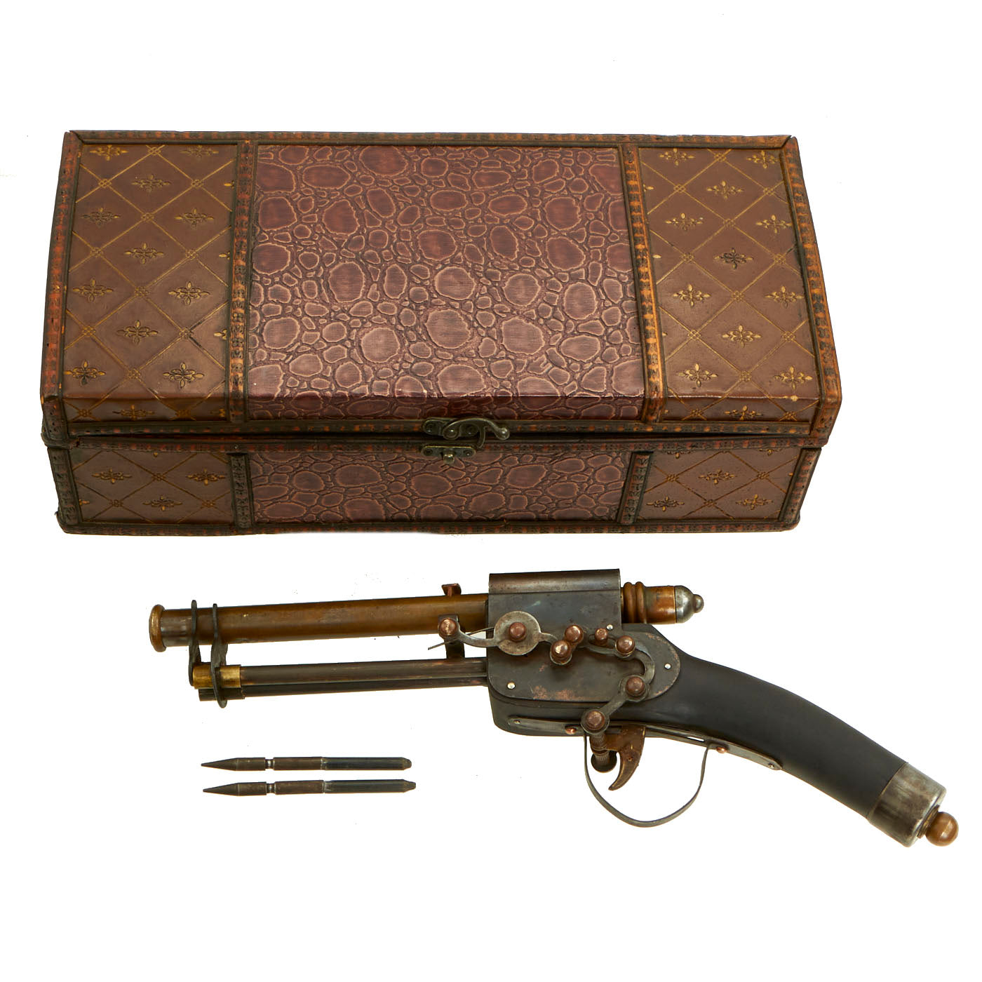 Original Item: One of a Kind. Steampunk fans, this is your chance!!! Looking like it came straight out of a Jules Verne novel is this brass barreled dart pistol, complete with two original darts! We have never seen or heard of anything like this before, and really do not know what its intended purpose was. We have seen these before on the market, and their origin has always been a bit of a mystery. It is powered by a large internal coil spring and the pistol has an elaborate trigger system, which releases the dart once it is loaded and the spring put under tension.