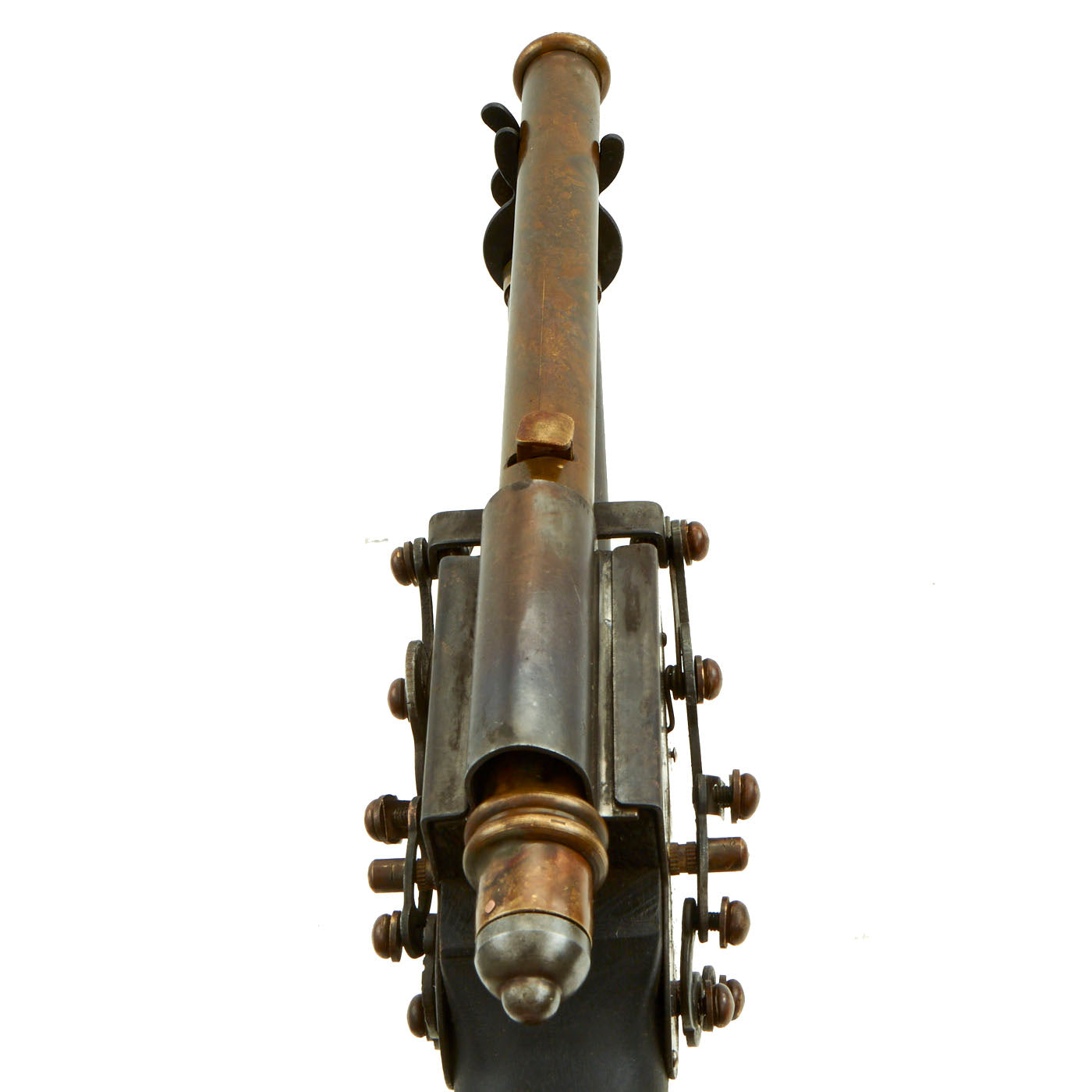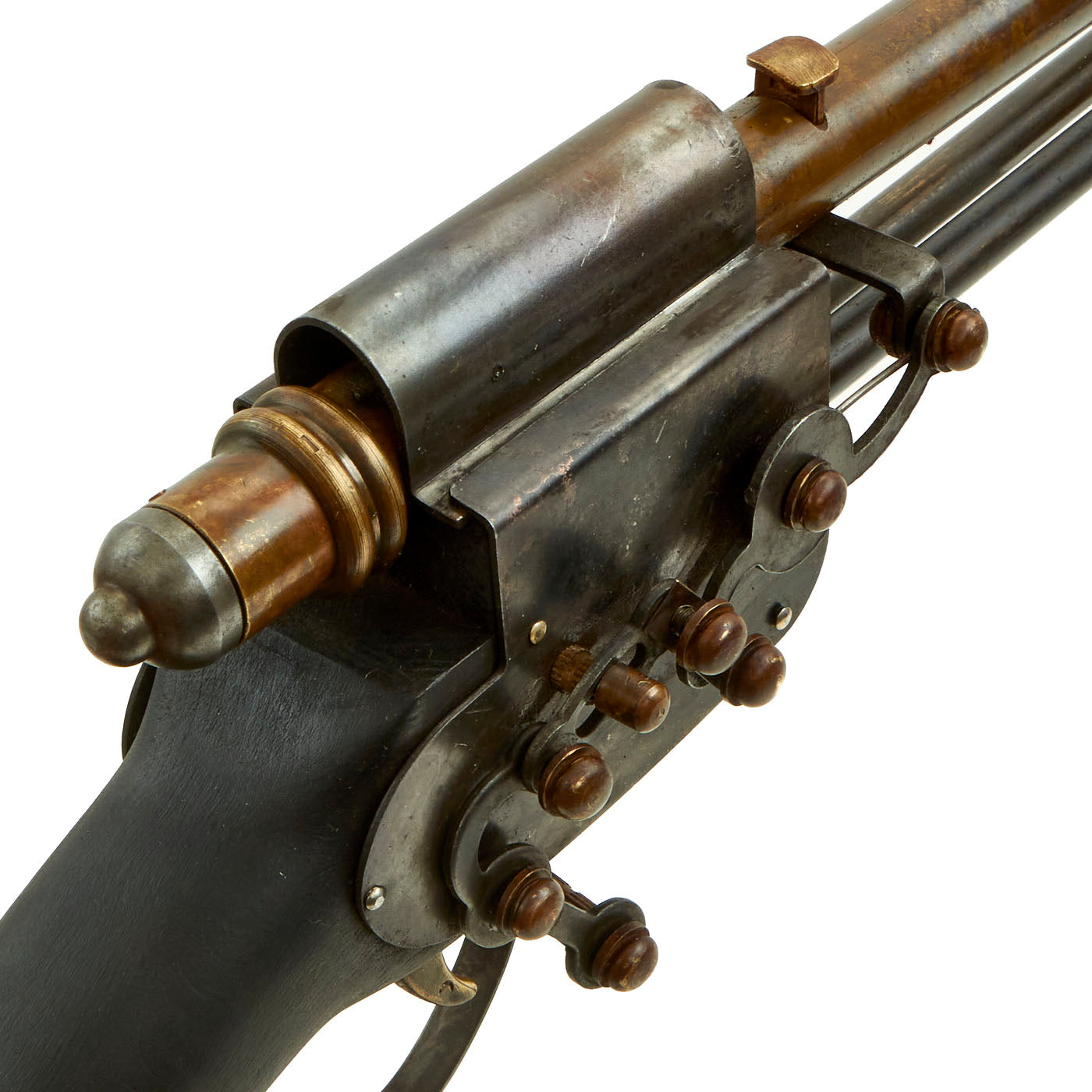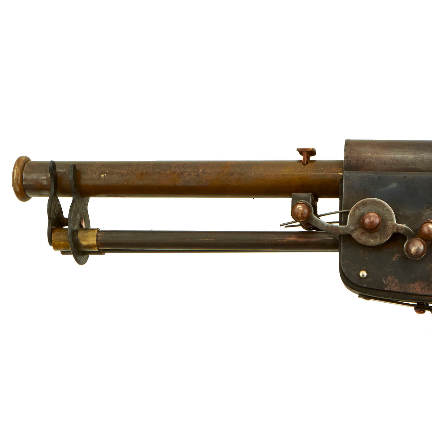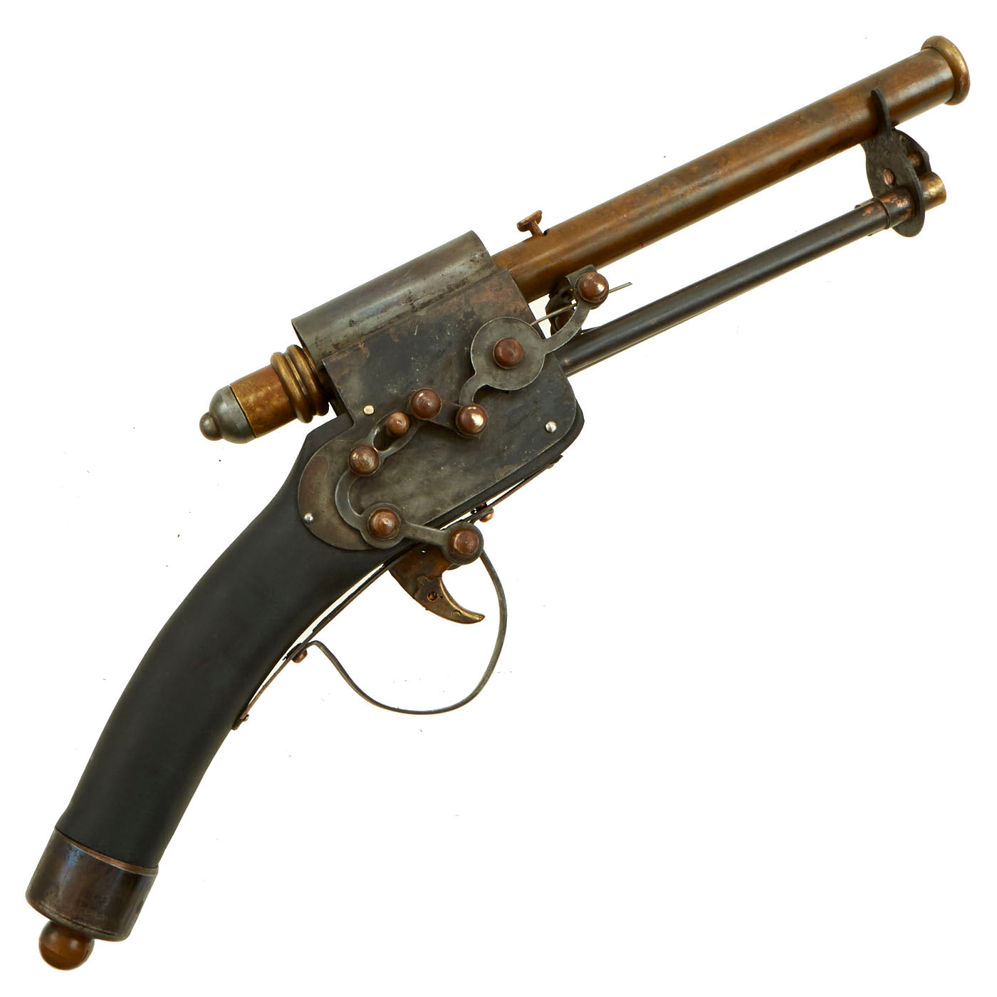 Original Item: One of a Kind. Steampunk fans, this is your chance!!! Looking like it came straight out of a Jules Verne novel is this brass barreled dart pistol, complete with two original darts! We have never seen or heard of anything like this before, and really do not know what its intended purpose was. We have seen these before on the market, and their origin has always been a bit of a mystery. It is powered by a large internal coil spring and the pistol has an elaborate trigger system, which releases the dart once it is loaded and the spring put under tension.