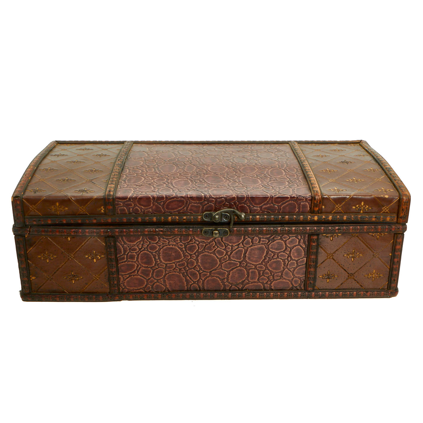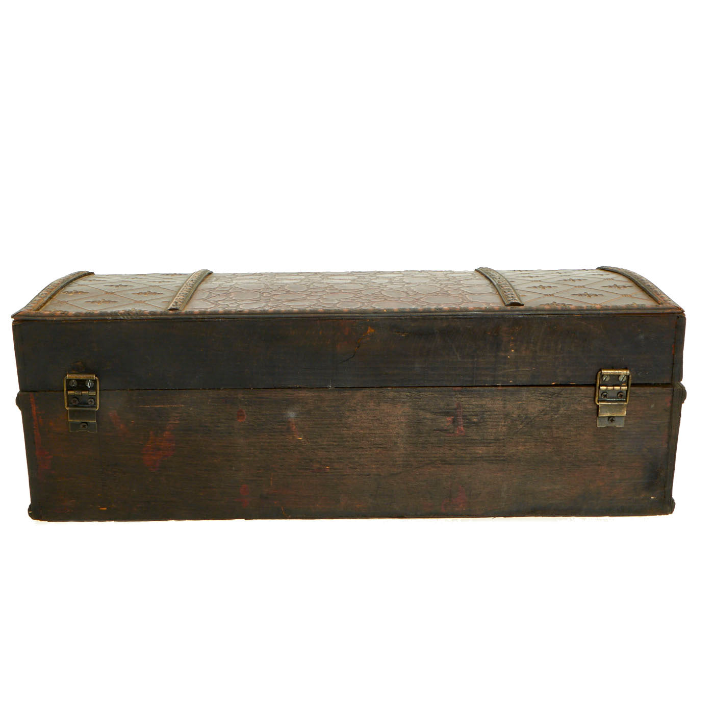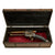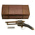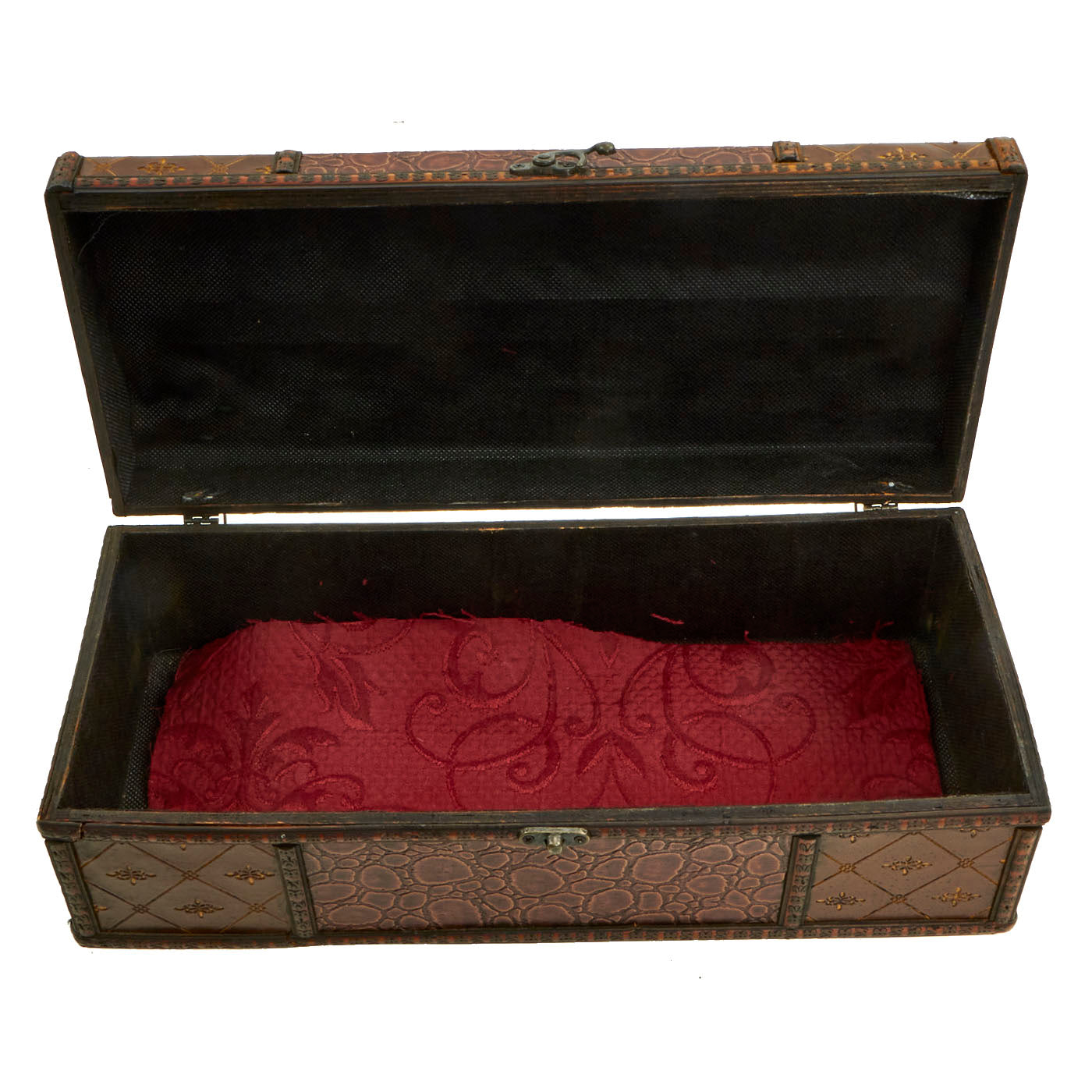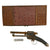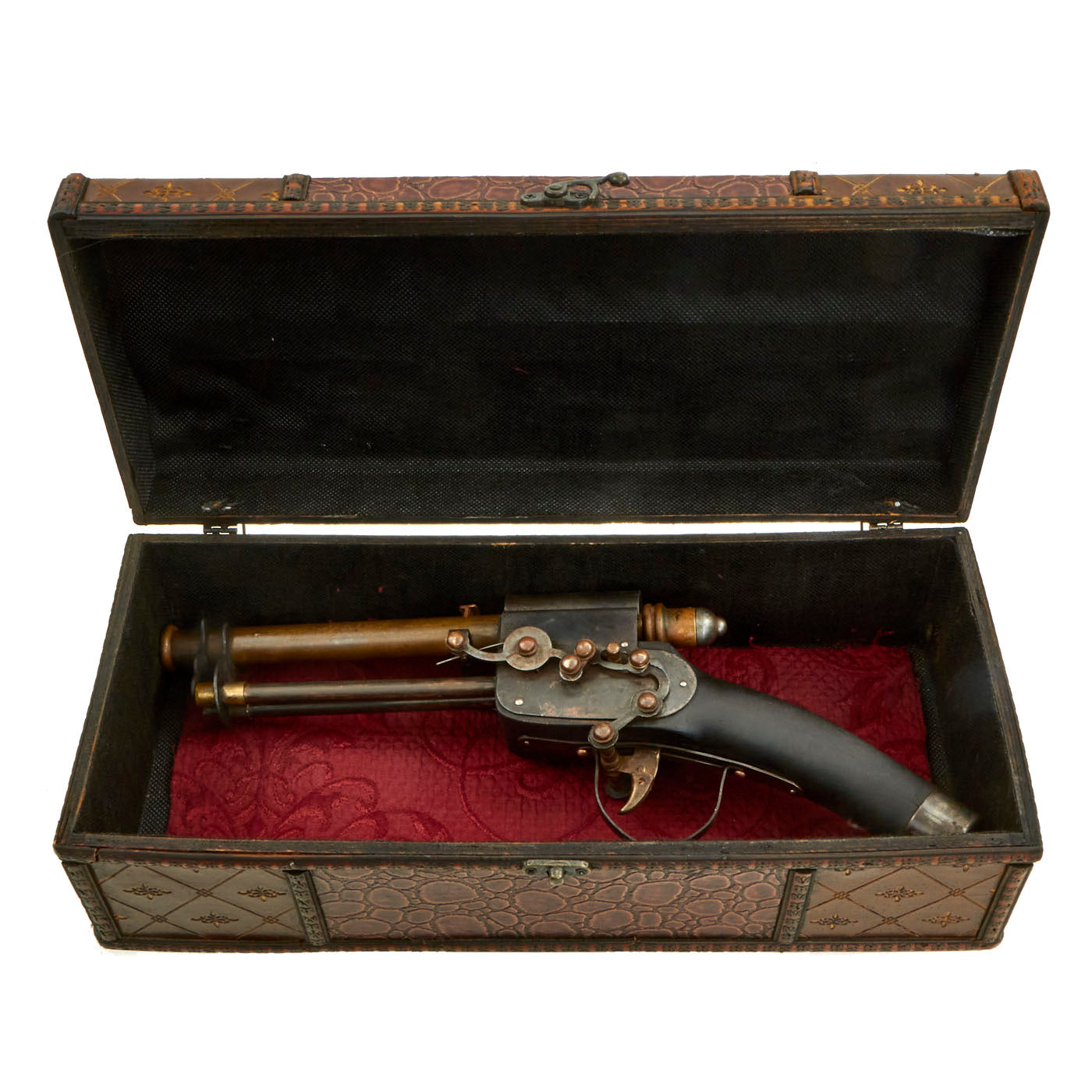 The pistol is housed in a lovely leather covered wood box decorated with Fleur de Lis motifs, which measures approximately 16” x 7” x 6”, with a latch on the front. This not only contains the "STEAMPUNK" Pistol, but two all steel "darts" which we assume to be the projectiles. These can also be stored in the tubes under the barrels, where the darts are held in place by a metal rotating lid.