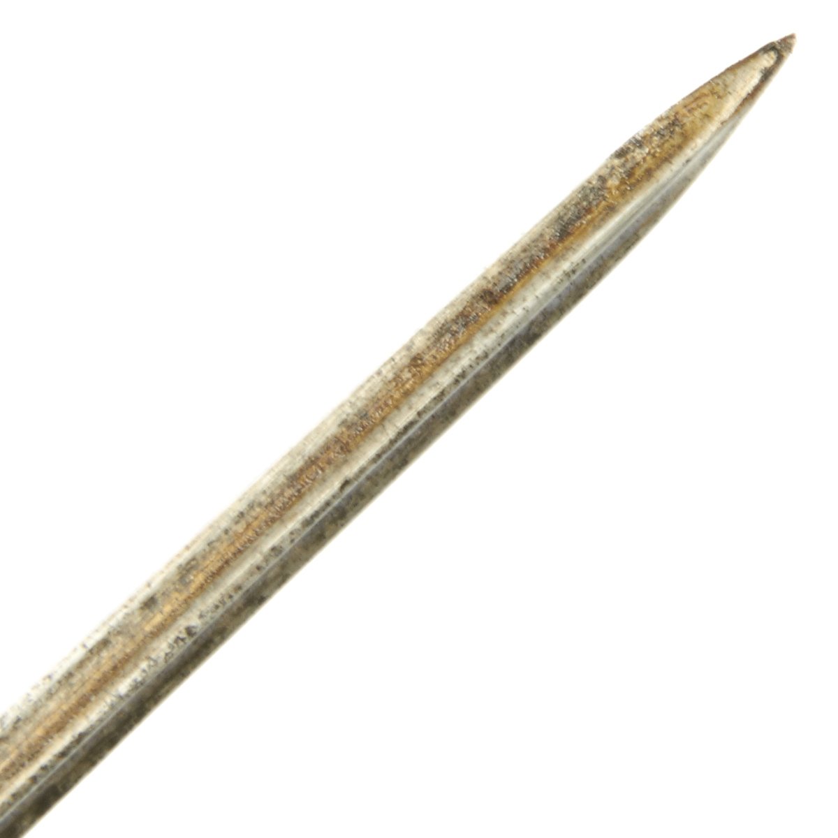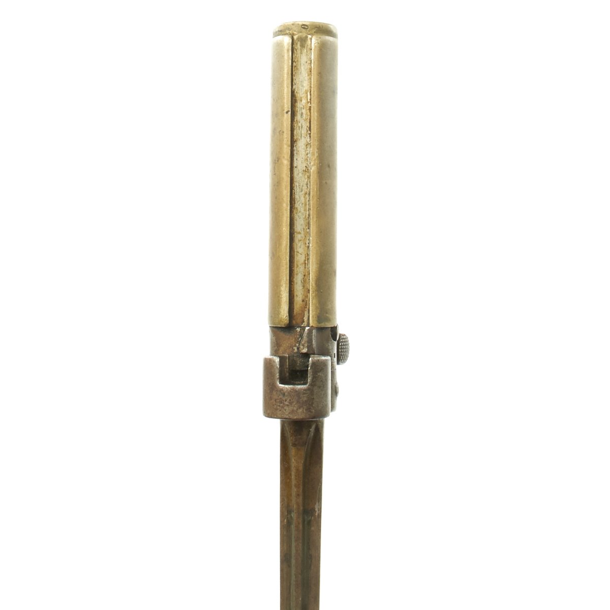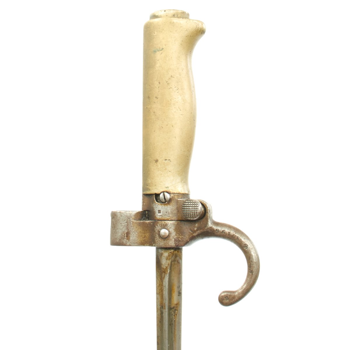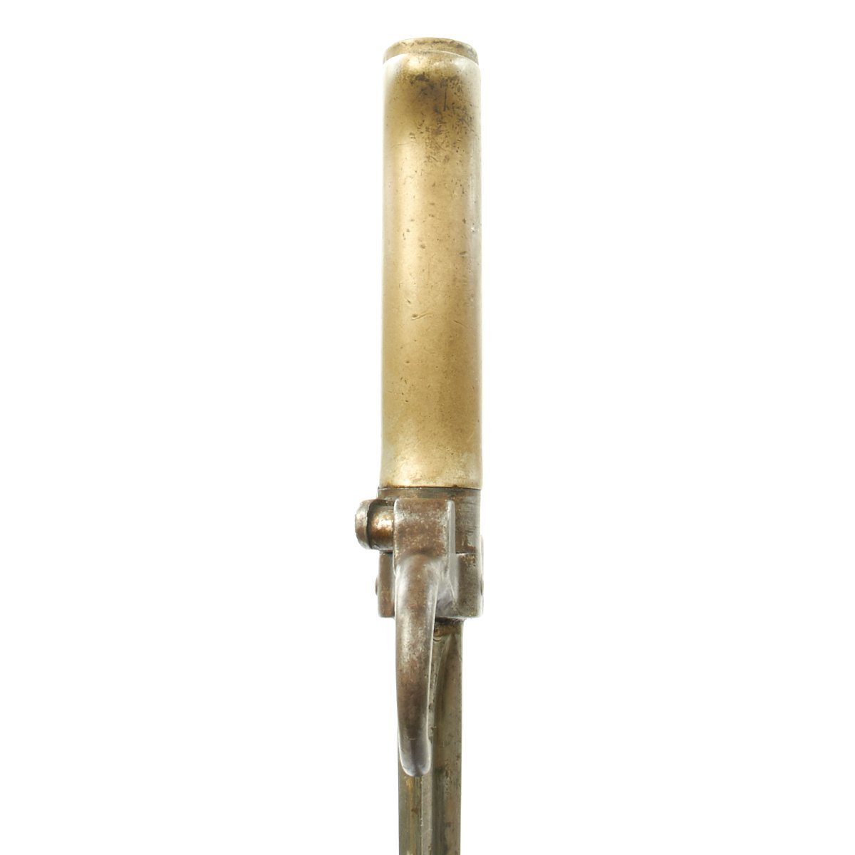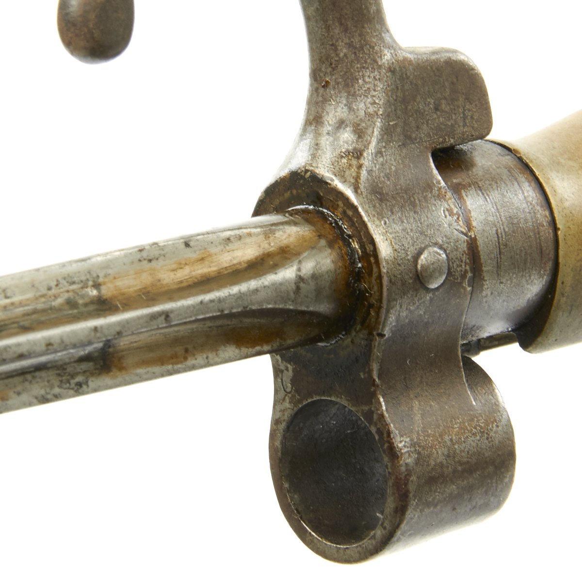 The accompanying bayonet, which is totally correct, with silver alloy grip is the original M1886 version, and still is in the original configuration with a 20 1/2 inch cruciform blade. This is an early example that escaped later modifications, retaining its long blade, quillion, and raised round press stud. The silver-alloy grip is removable. The scabbard is in great shape, with no dents or bends, and a great finish.