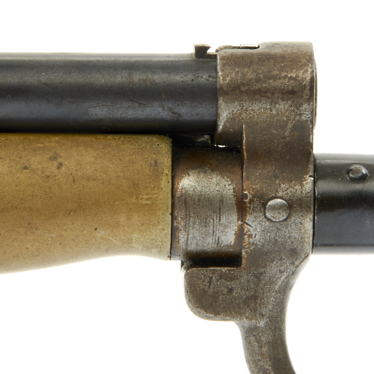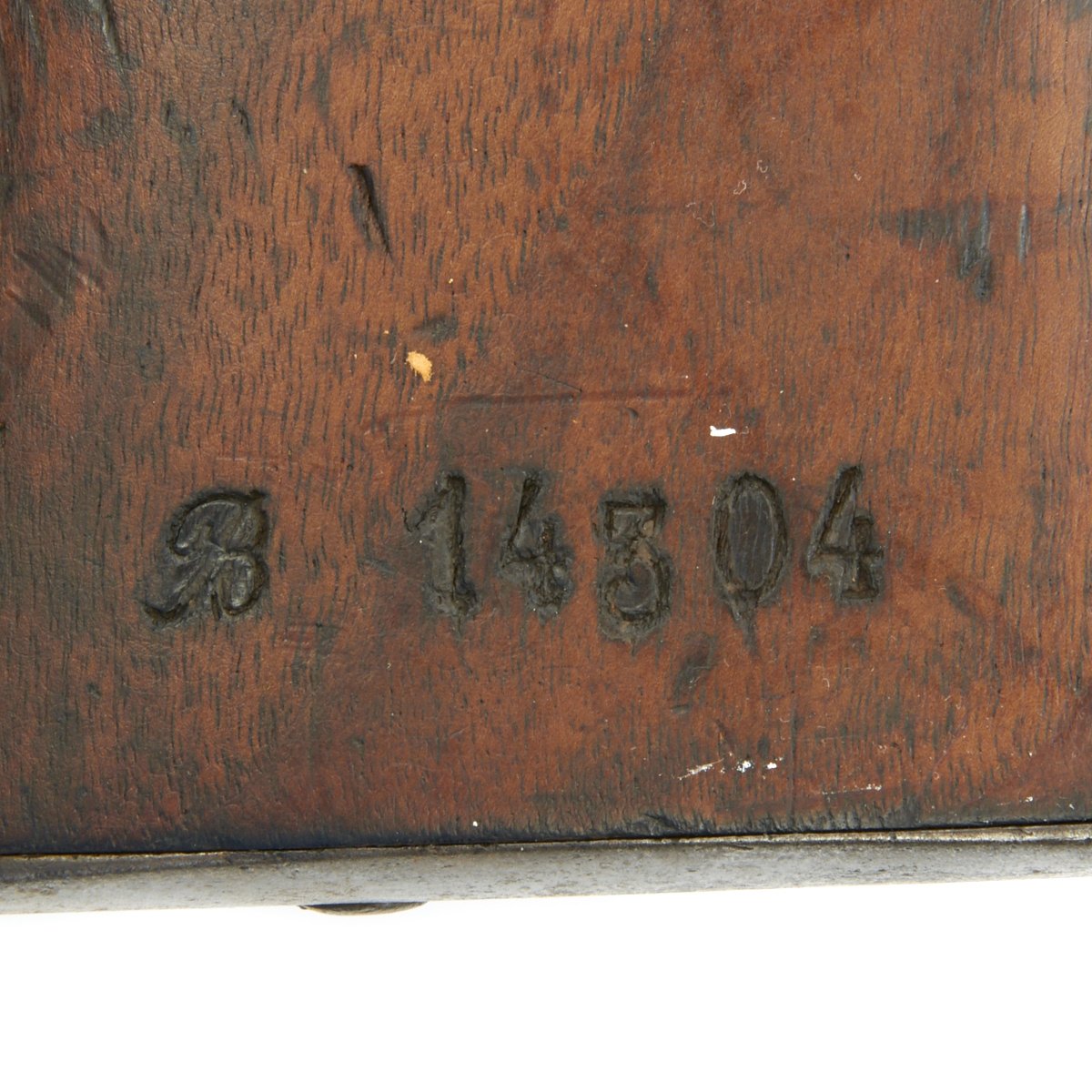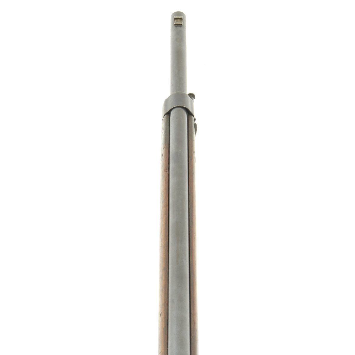 Condition of the rifle is good, though it definitely has seen long service, which has made the original markings faint, though still visible. The stock has numerous small repairs at the corners of the butt and fore stocks. The metalwork is in good condition, but does show signs of wear and past pitting. The bore shows lands and grooves, but there is much fouling and oxidation, so the finish is mostly dark. The fore sight blade is also missing.