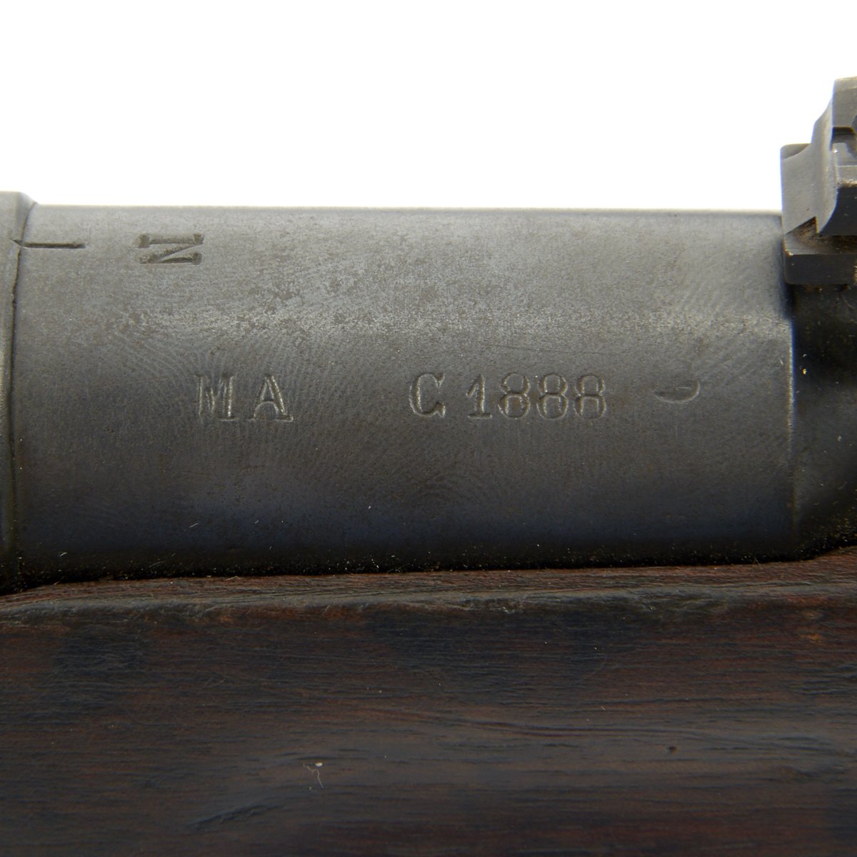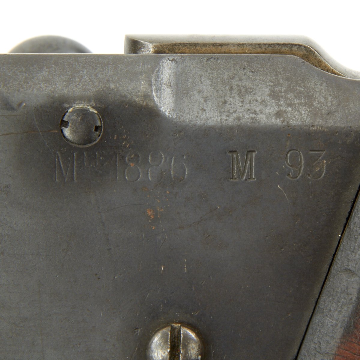 The left side of the receiver marked with the remnants of MANUFACTURE D'ARMES / Châtellerault, and to the right MLE 1886 M93, indicating manufacture at the government arsenal at Châtellerault. The rifle has arsenal proofs on most parts, and also is marked MA C 1888 indicating that it was produced in 1888, and later updated with the bolt modification after 1893. The rifle has serial number B 14304 on the barrel, butt stock, fore stock, and receiver floor plate. The bolt serial number is not matching, and was probably changed during the later bolt conversion.