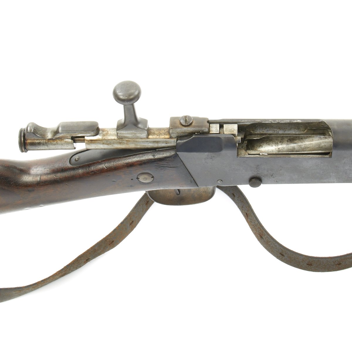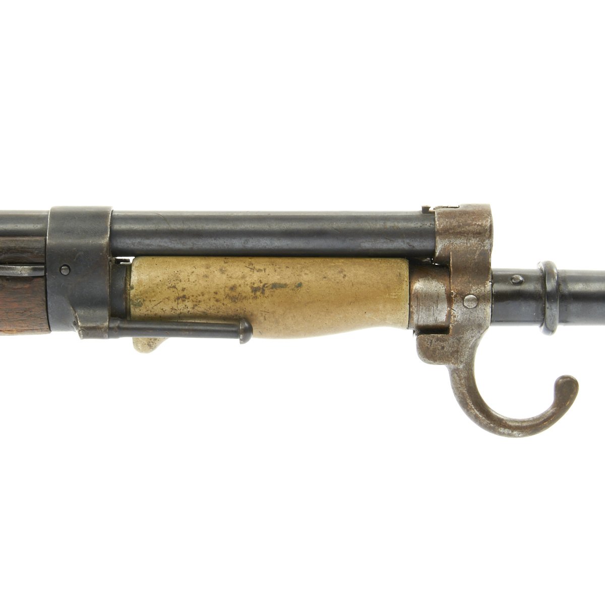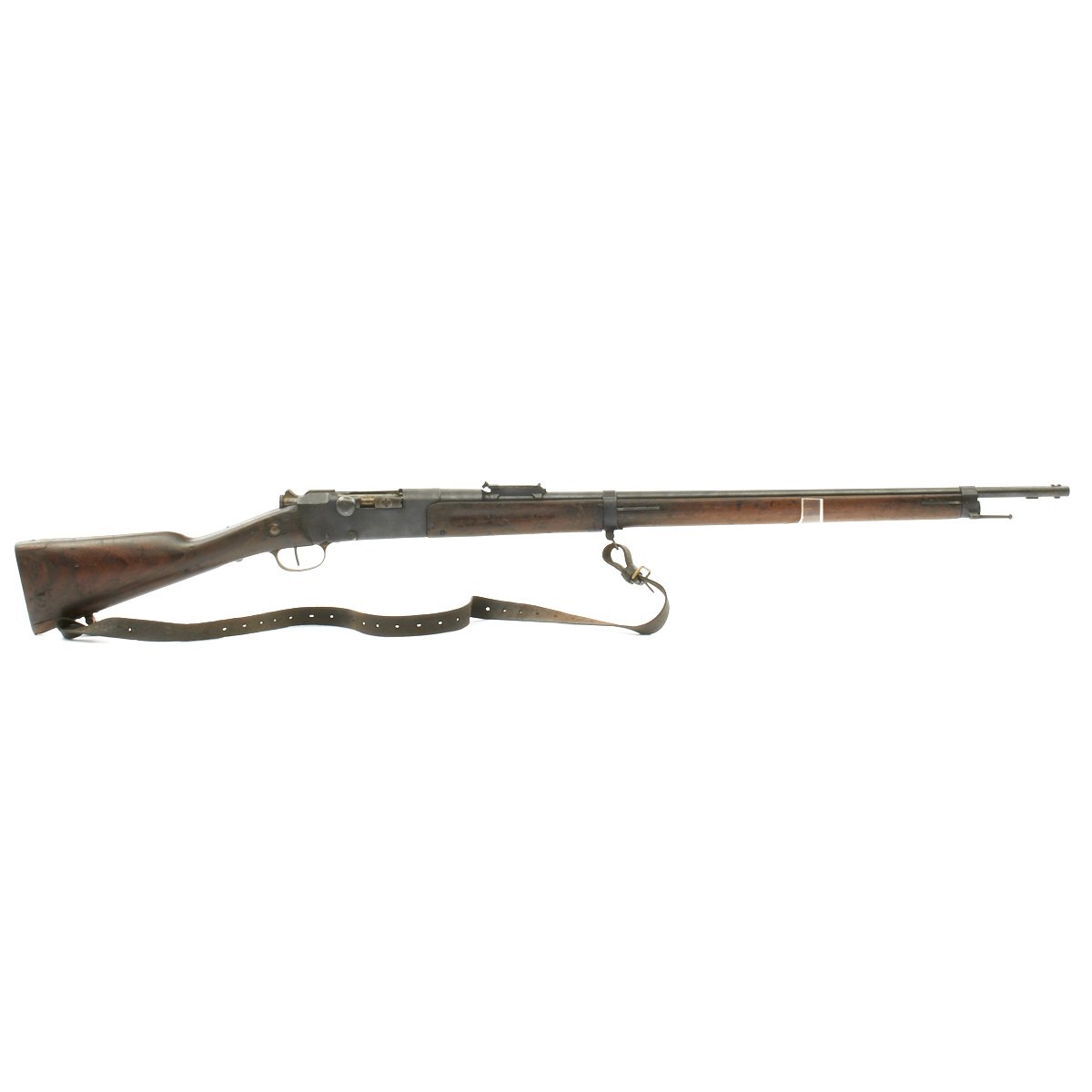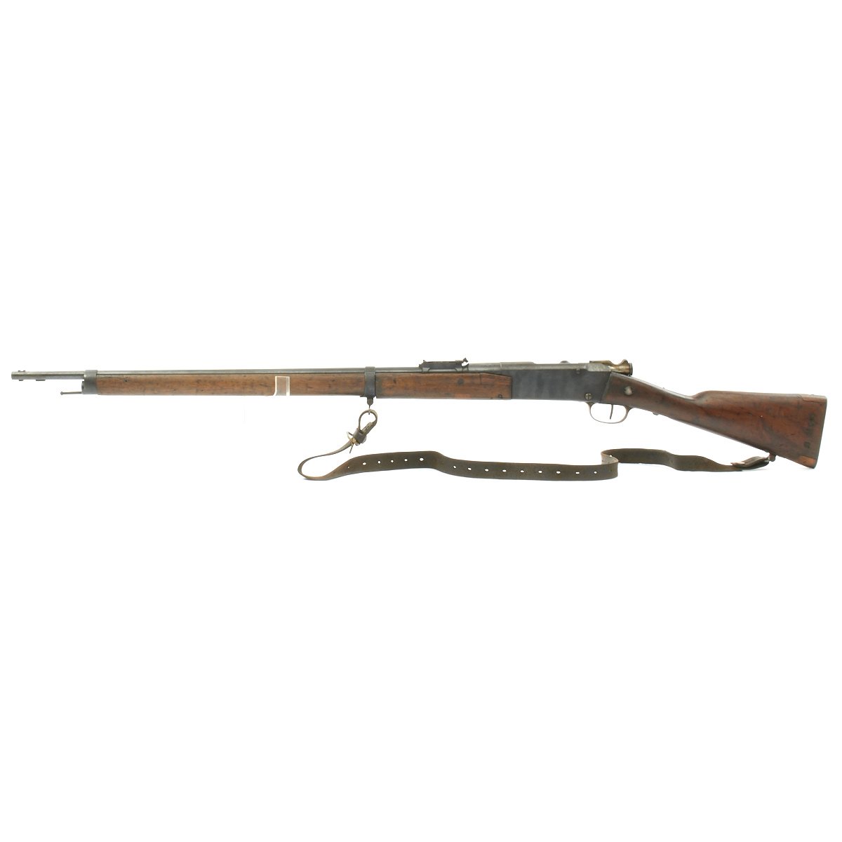 Original Item: Only One Available. The Lebel Model 1886 rifle (French: Fusil Modèle 1886 dit "Fusil Lebel") is also known as the "Fusil Mle 1886 M93", after a bolt modification was added in 1893. It is an 8 mm bolt action infantry rifle that entered service in the French Army in 1887. It is a repeating rifle that can hold eight rounds in its forestock tube magazine, one round in the transporter plus one round in the chamber. The Lebel rifle has the distinction of being the first military firearm to use smokeless powder ammunition. The new propellant powder, "Poudre B," was nitrocellulose-based and had been invented in 1884 by French chemist Paul Vieille. Lieutenant Colonel Nicolas Lebel contributed a flat nosed 8 mm full metal jacket bullet ("Balle M," or "Balle Lebel"). Twelve years later, in 1898, a solid brass pointed (spitzer) and boat-tail bullet called "Balle D" was retained for all 8mm Lebel ammunition. Each case was protected against accidental percussion inside the tube magazine by a primer cover and by a circular groove around the primer cup which caught the tip of the following pointed bullet. Featuring an oversized bolt with front locking lugs and a massive receiver, the Lebel rifle was a durable design capable of long range performance. In spite of early obsolete features, such as its tube magazine and the shape of 8mm Lebel rimmed ammunition, the Lebel rifle remained the basic weapon of French line infantry during World War I (1914–1918). Altogether, 3.45 million Lebel rifles were produced by the three French state factories between 1887 and 1916.