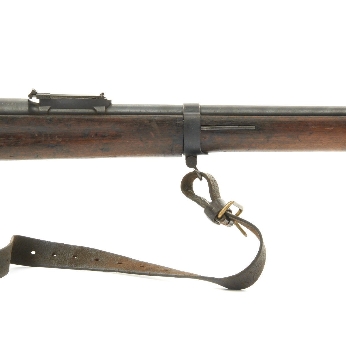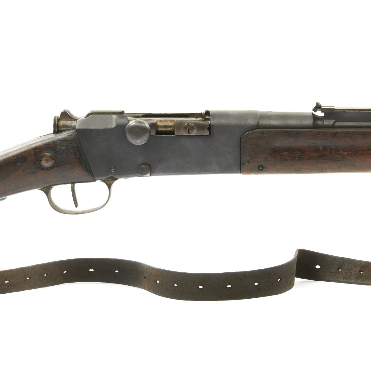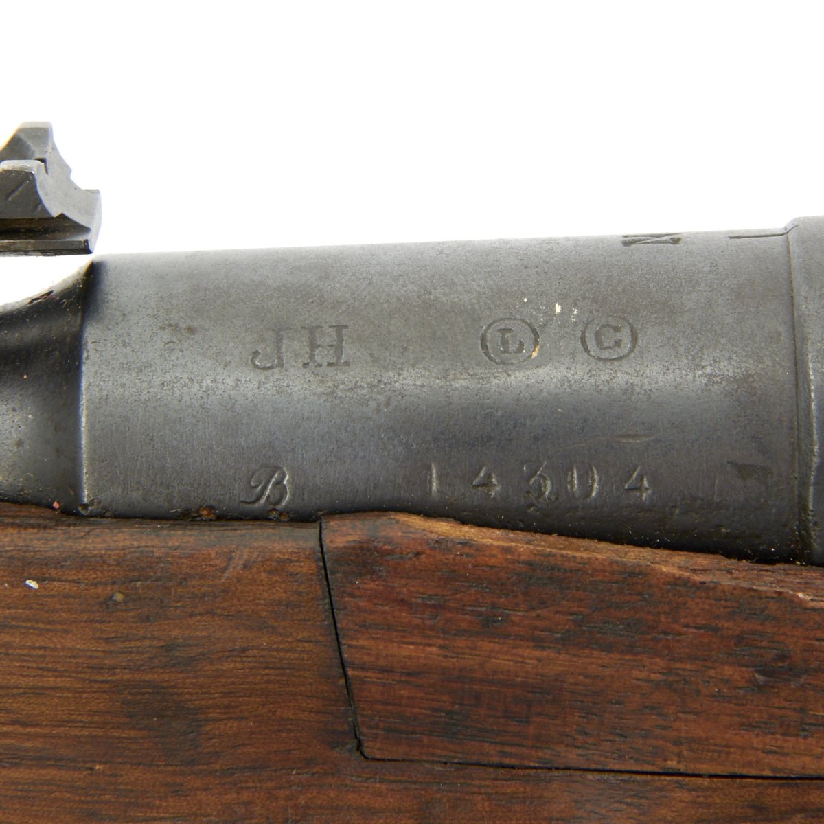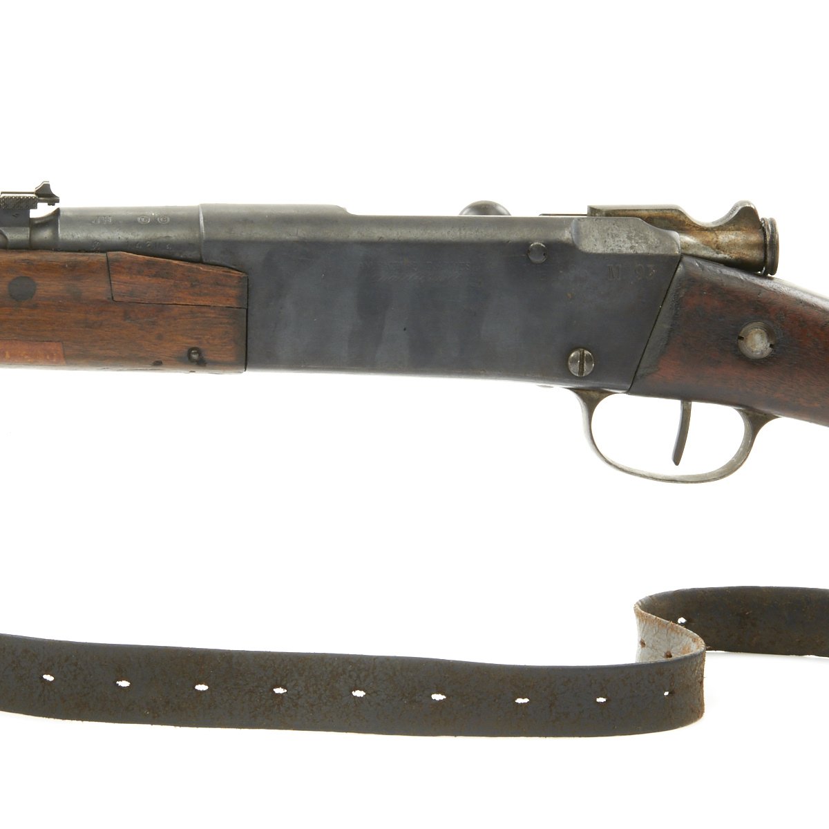 Original Item: Only One Available. The Lebel Model 1886 rifle (French: Fusil Modèle 1886 dit "Fusil Lebel") is also known as the "Fusil Mle 1886 M93", after a bolt modification was added in 1893. It is an 8 mm bolt action infantry rifle that entered service in the French Army in 1887. It is a repeating rifle that can hold eight rounds in its forestock tube magazine, one round in the transporter plus one round in the chamber. The Lebel rifle has the distinction of being the first military firearm to use smokeless powder ammunition. The new propellant powder, "Poudre B," was nitrocellulose-based and had been invented in 1884 by French chemist Paul Vieille. Lieutenant Colonel Nicolas Lebel contributed a flat nosed 8 mm full metal jacket bullet ("Balle M," or "Balle Lebel"). Twelve years later, in 1898, a solid brass pointed (spitzer) and boat-tail bullet called "Balle D" was retained for all 8mm Lebel ammunition. Each case was protected against accidental percussion inside the tube magazine by a primer cover and by a circular groove around the primer cup which caught the tip of the following pointed bullet. Featuring an oversized bolt with front locking lugs and a massive receiver, the Lebel rifle was a durable design capable of long range performance. In spite of early obsolete features, such as its tube magazine and the shape of 8mm Lebel rimmed ammunition, the Lebel rifle remained the basic weapon of French line infantry during World War I (1914–1918). Altogether, 3.45 million Lebel rifles were produced by the three French state factories between 1887 and 1916.