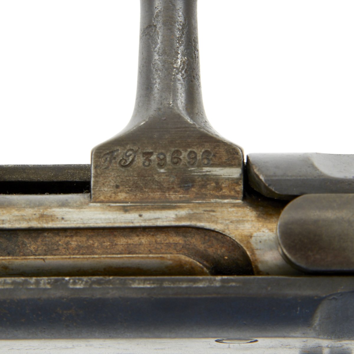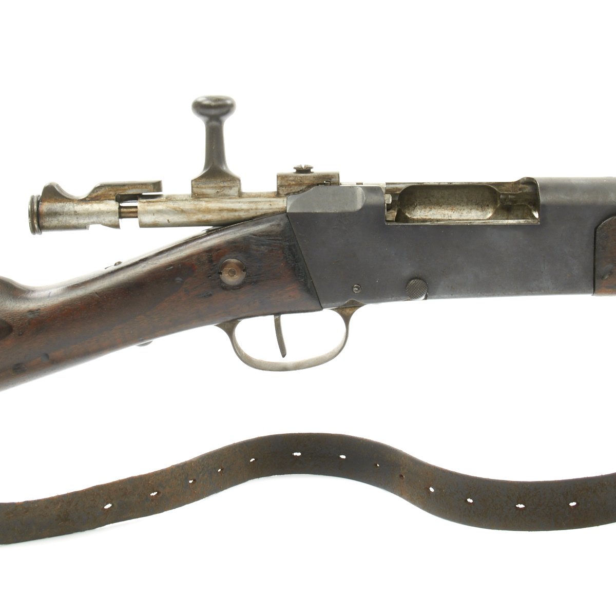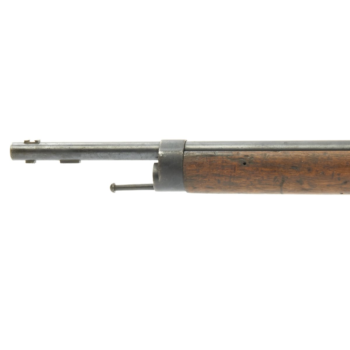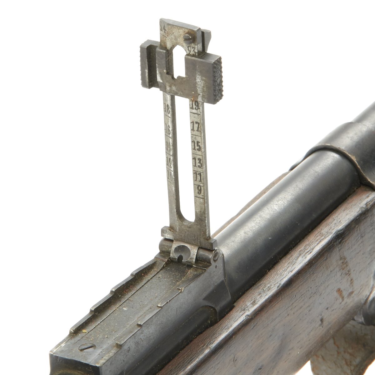 Original Item: Only One Available. The Lebel Model 1886 rifle (French: Fusil Modèle 1886 dit "Fusil Lebel") is also known as the "Fusil Mle 1886 M93", after a bolt modification was added in 1893. It is an 8 mm bolt action infantry rifle that entered service in the French Army in 1887. It is a repeating rifle that can hold eight rounds in its forestock tube magazine, one round in the transporter plus one round in the chamber. The Lebel rifle has the distinction of being the first military firearm to use smokeless powder ammunition. The new propellant powder, "Poudre B," was nitrocellulose-based and had been invented in 1884 by French chemist Paul Vieille. Lieutenant Colonel Nicolas Lebel contributed a flat nosed 8 mm full metal jacket bullet ("Balle M," or "Balle Lebel"). Twelve years later, in 1898, a solid brass pointed (spitzer) and boat-tail bullet called "Balle D" was retained for all 8mm Lebel ammunition. Each case was protected against accidental percussion inside the tube magazine by a primer cover and by a circular groove around the primer cup which caught the tip of the following pointed bullet. Featuring an oversized bolt with front locking lugs and a massive receiver, the Lebel rifle was a durable design capable of long range performance. In spite of early obsolete features, such as its tube magazine and the shape of 8mm Lebel rimmed ammunition, the Lebel rifle remained the basic weapon of French line infantry during World War I (1914–1918). Altogether, 3.45 million Lebel rifles were produced by the three French state factories between 1887 and 1916.