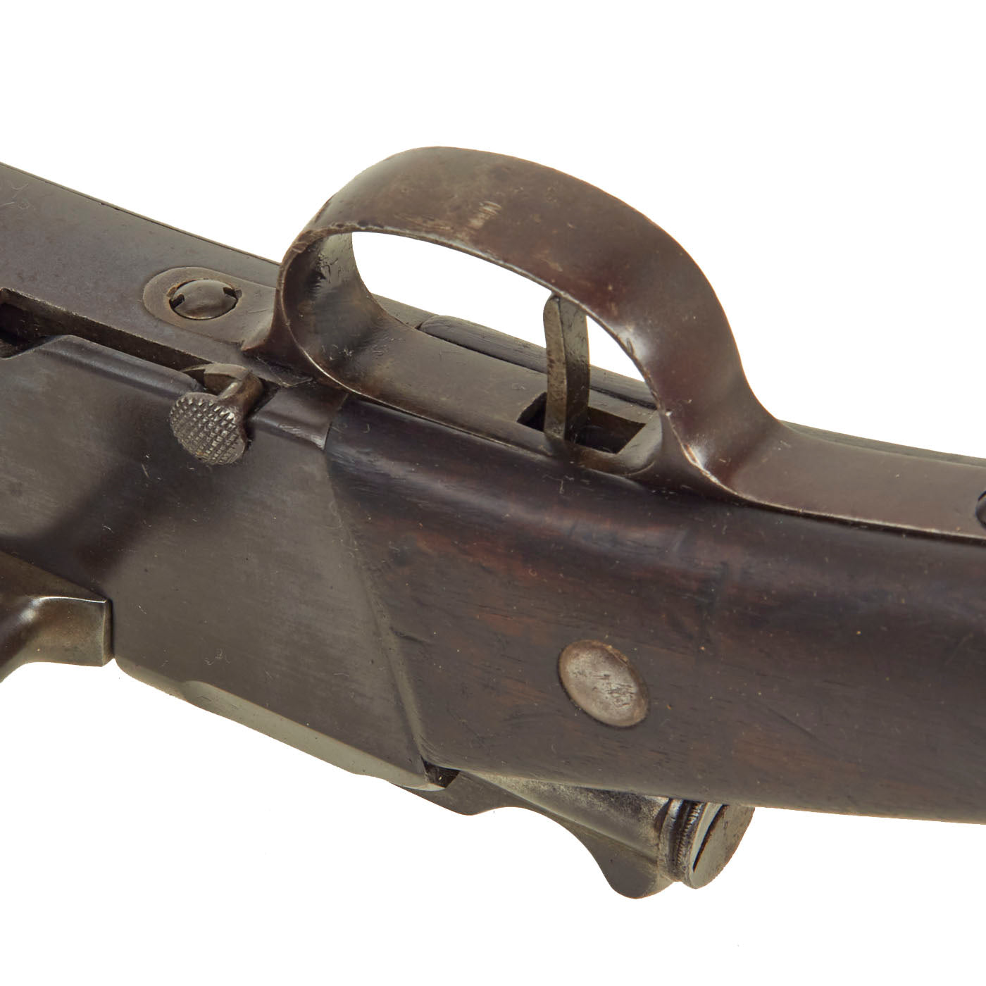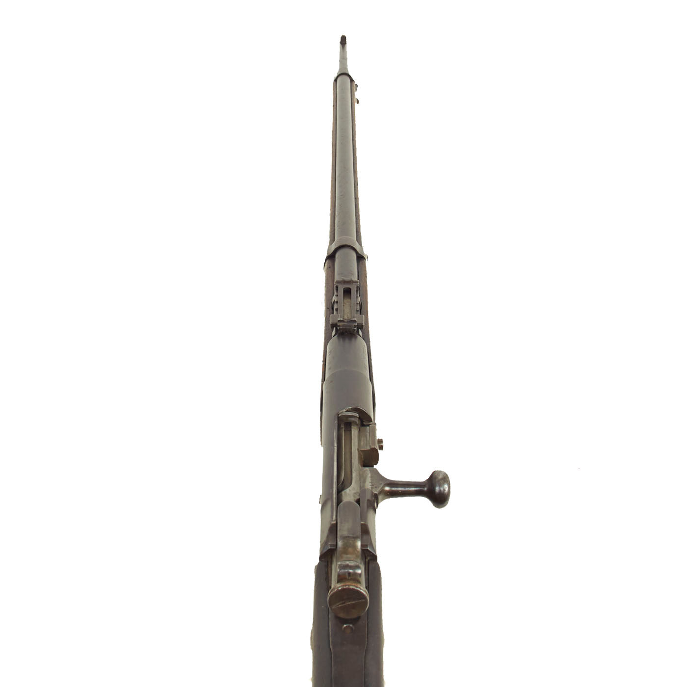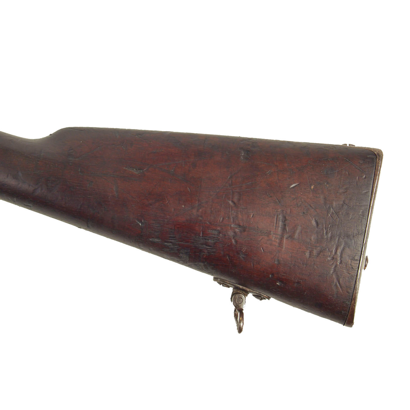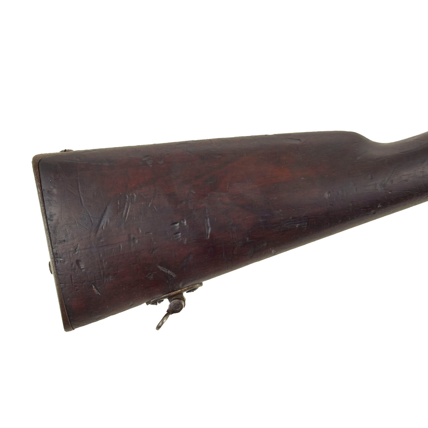 Condition of the rifle is good, though it definitely has seen long service, indicated by the numerous dents, dings, scratches, and other wear on the stock. There is a dowel repair through the fore stock under the rear sight, which we have seen on many other examples. The metalwork is in very good condition, with little sign of rust or other damage. Overall it shows a nice oxidized patina, with some traces of black paint, often added to rifles destined for colonial service.