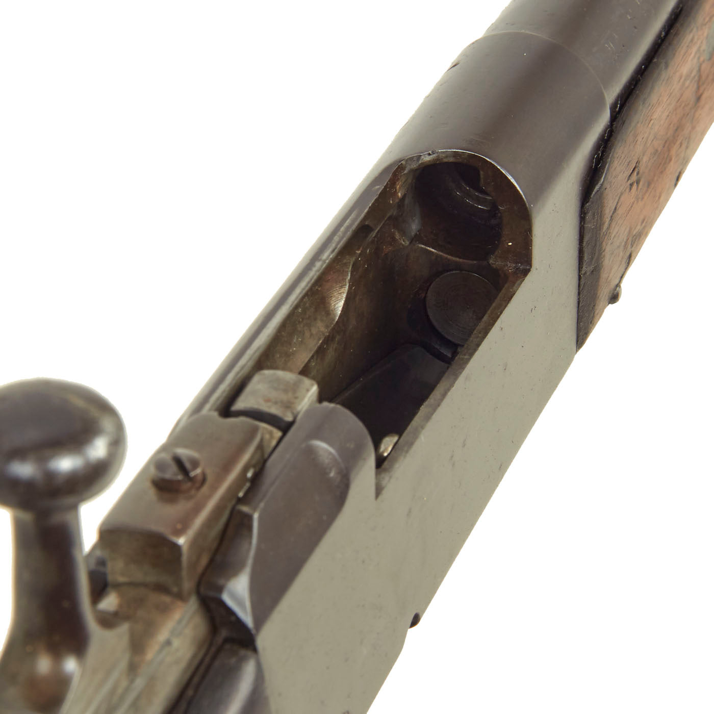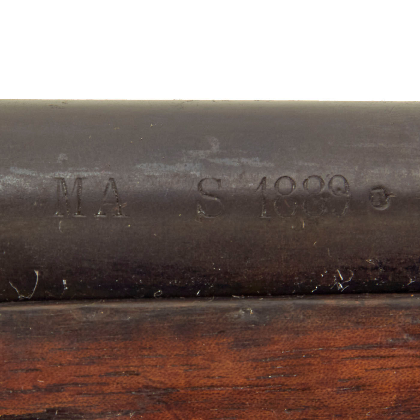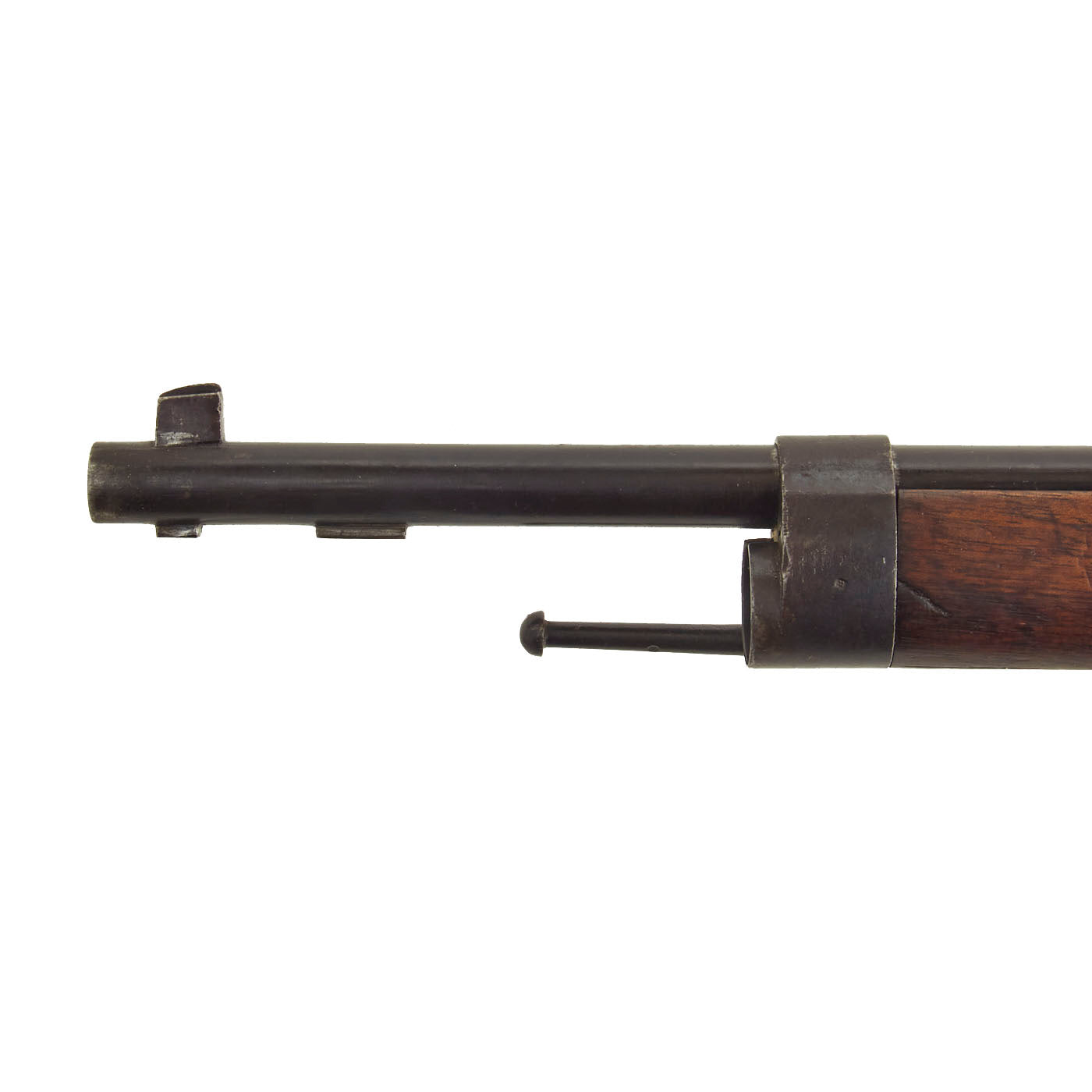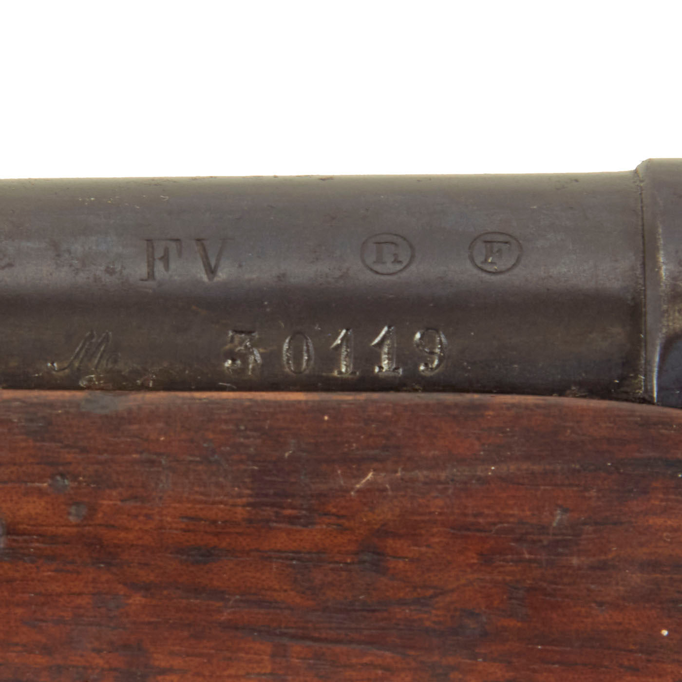 The left side of the receiver on this fine example is marked with MANUFACTURE D'ARMES / St.-Étienne, and to the right MLE 1886 M93, indicating manufacture at the government arsenal at Saint-Étienne. The rifle has arsenal proofs on most parts, and also is marked MA S 1889 indicating that it was produced in 1889, and later updated with the bolt modification after 1893. The rifle has serial number M 30119 on the barrel, while the bolt is marked with K 58278, and other markings are too worn to read. This rifle saw long service, having parts swapped out at arsenal.