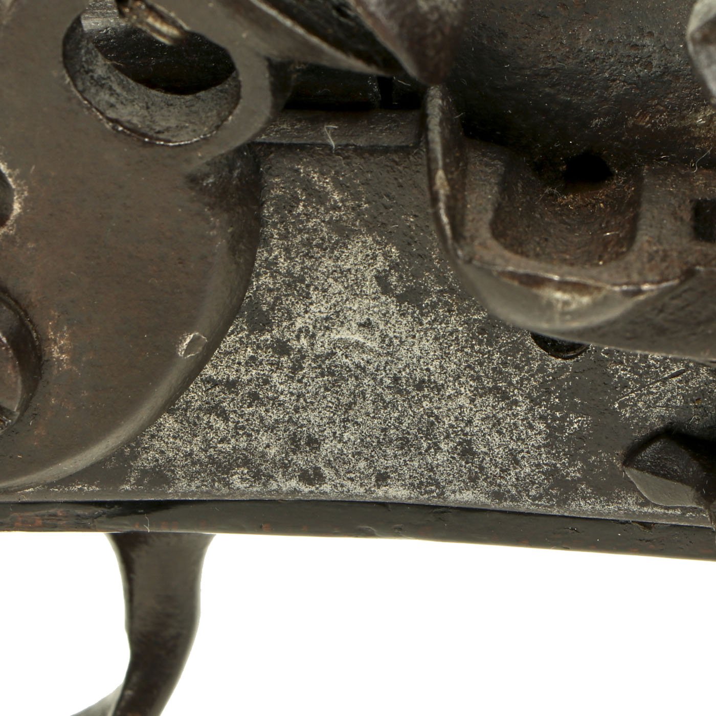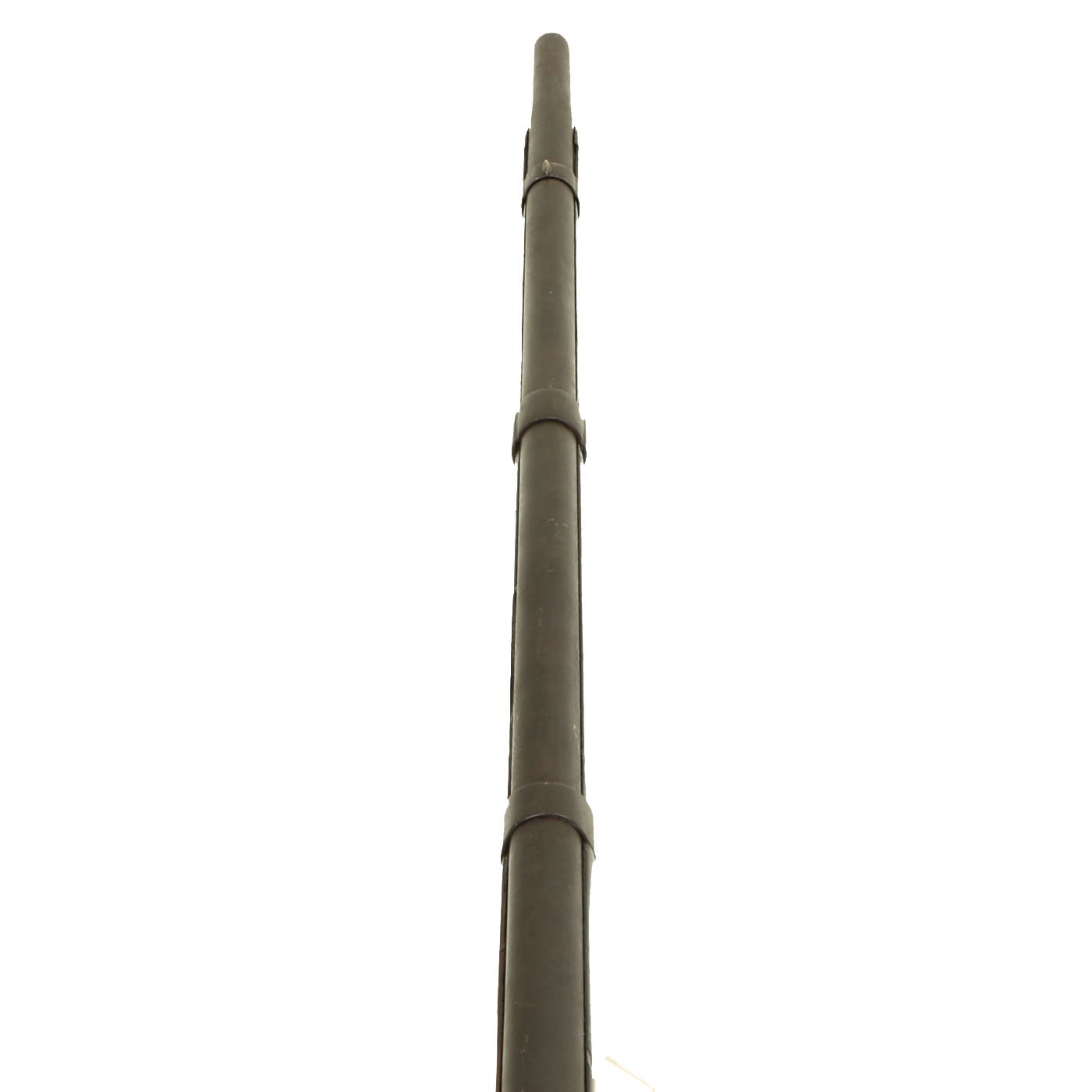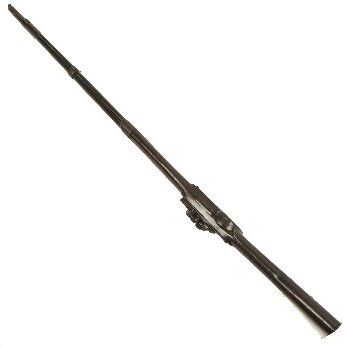 This is a somewhat shorter and smaller version of the Charleville, a Sergeant or Artillery fusil. It also has a smaller bore, and was intended to fire the same ammunition used by pistols. This example has all steel mounts, as brass mounts were generally only used for Naval issue. The lock and barrel are both unmarked, worn down by years of service and age. Differing from the Brown Bess not only using all steel mounts the barrel is secured by three-barrel bands and not pins. Very good used overall condition this musket comes with an early model all steel ramrod.