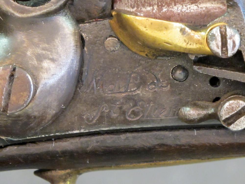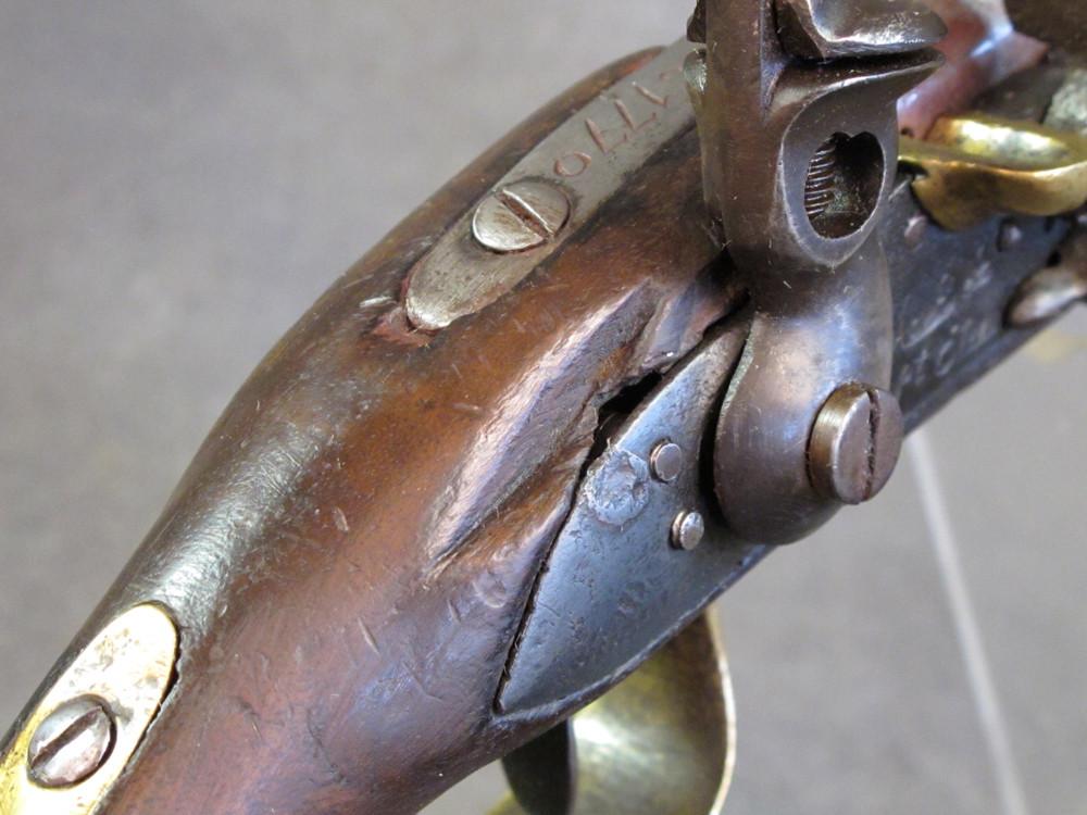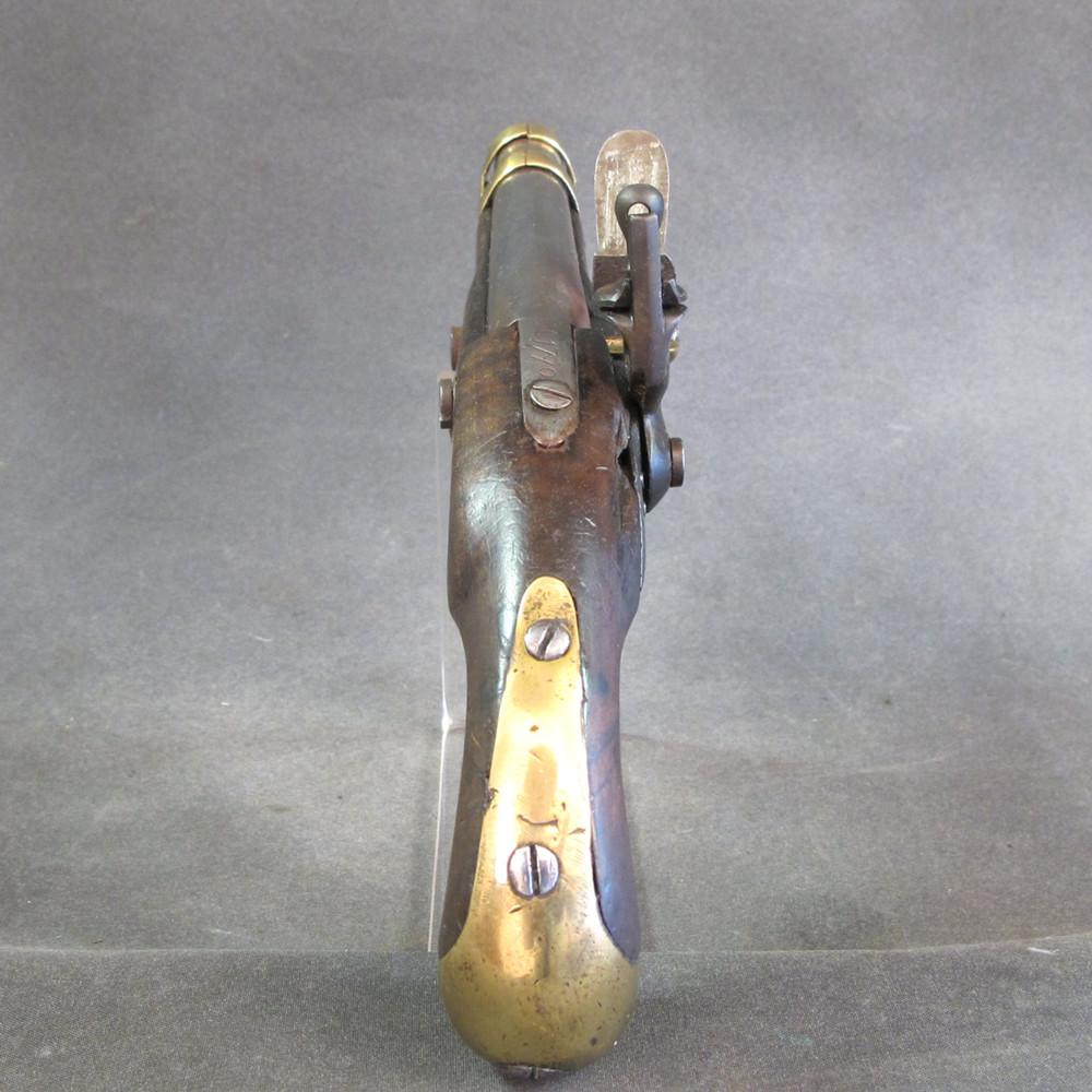5-inch barrel and an overall length of just 10 inches, fires a 5/8" ball, so this pistol carried quite a punch. The lockplate marked MANF. A ST.ETIENNE has a brass powder pan and all brass mounts. The barrel tang marked M 1770