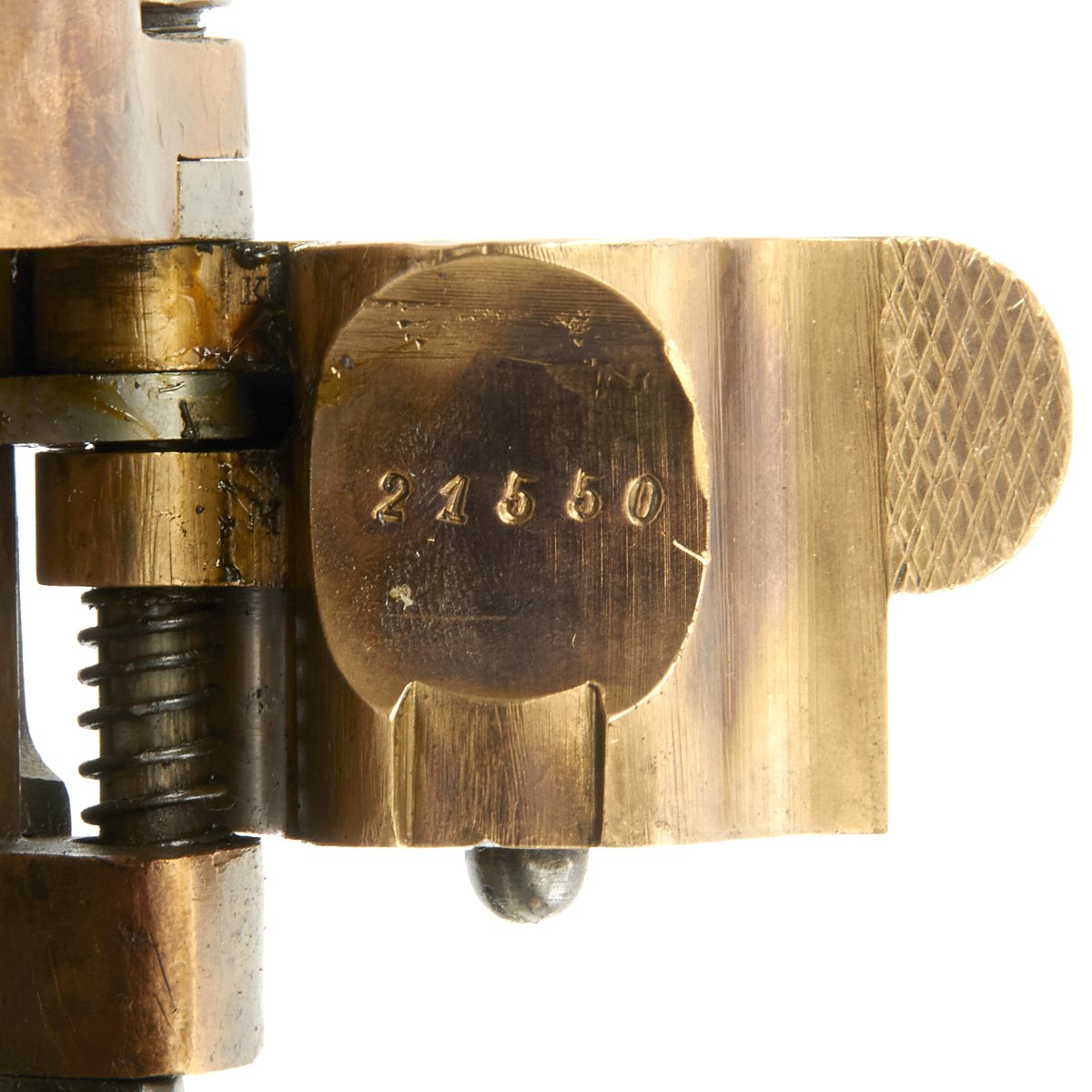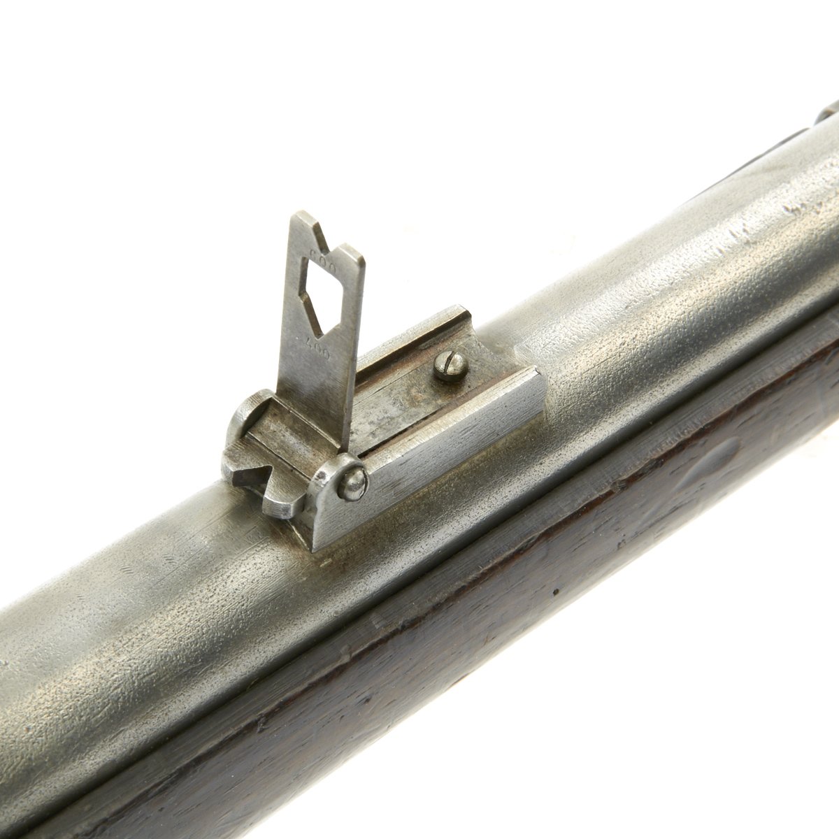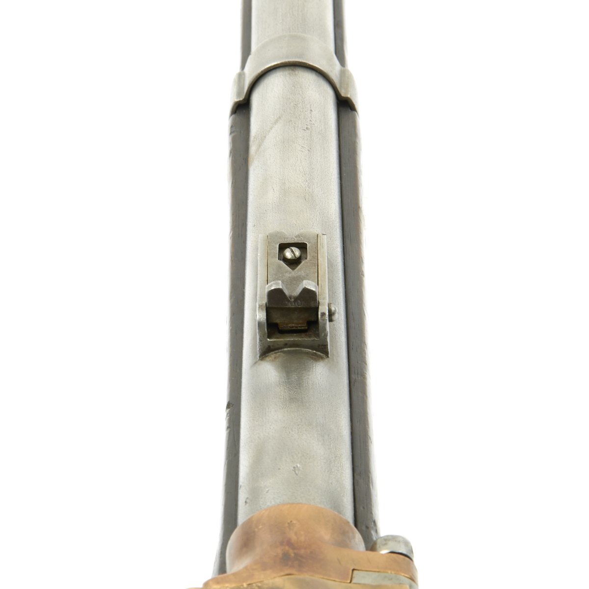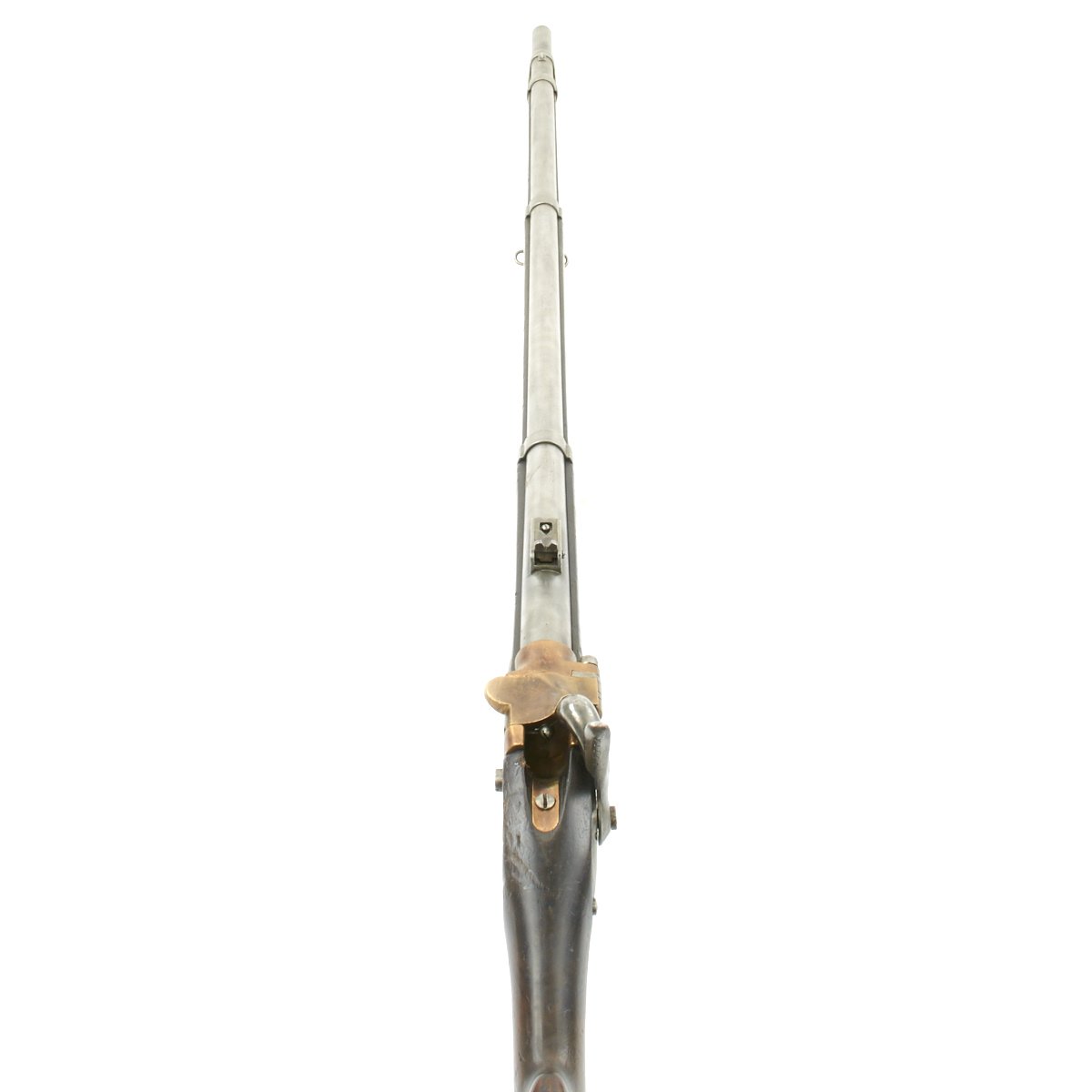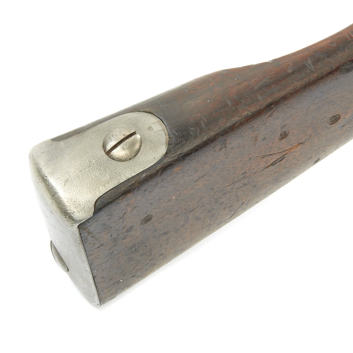 This rifle came from a Museum Collection in London and is in very nice collectible condition. The metalwork is in great shape, with a bright finish and just a bit of pitting. The bore shows clear lands and grooves, with a partly bright finish, showing some areas of light corrosion. Stock wood is very good, and has a great patina, though there are a good amount of small dents and dings.