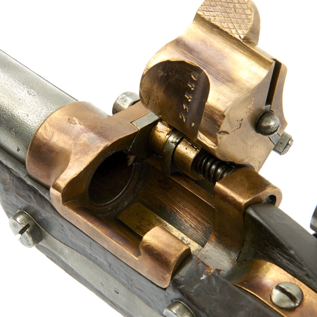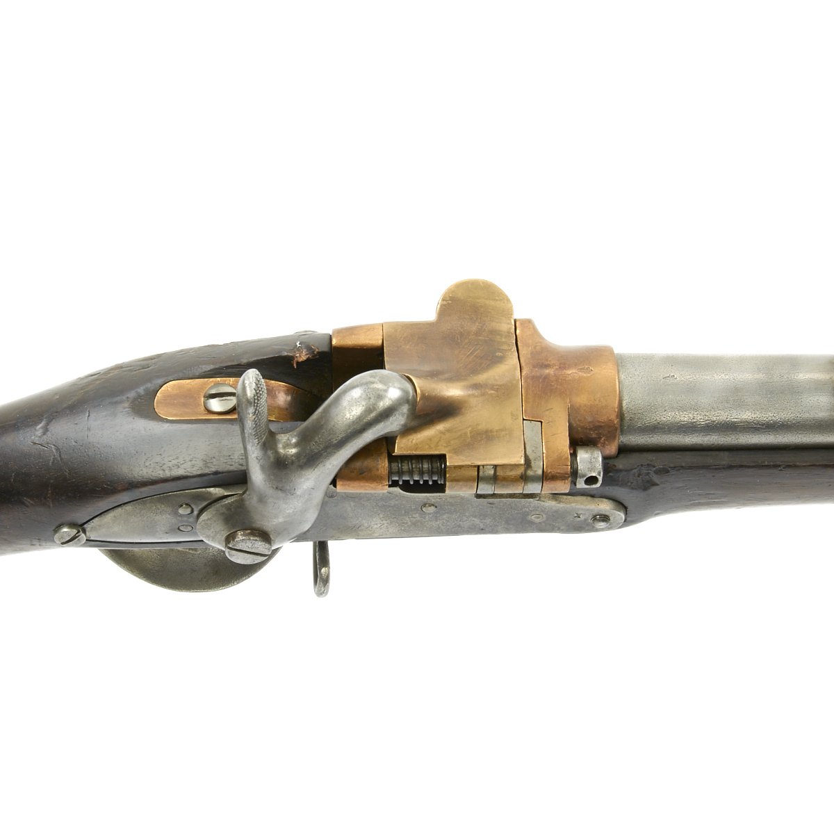 What we offer here is the best of all worlds, it is an original French Model 1822 Musket that started life as a SIDE LOCK Flintlock, was converted to Percussion in the 1840 and fitted with a rifled barrel. It was then transformed a second time to an early TABATIERE RIFLE using a BRONZE Breech system. The Lock retains traces of the early markings the look like the original Manufacture took place at the French Arsenal at MUTZIG. The markings are faded, so unfortunately we cannot be certain, but de Mut.. is definitely visible. There breech block is marked on the underside with 21550.