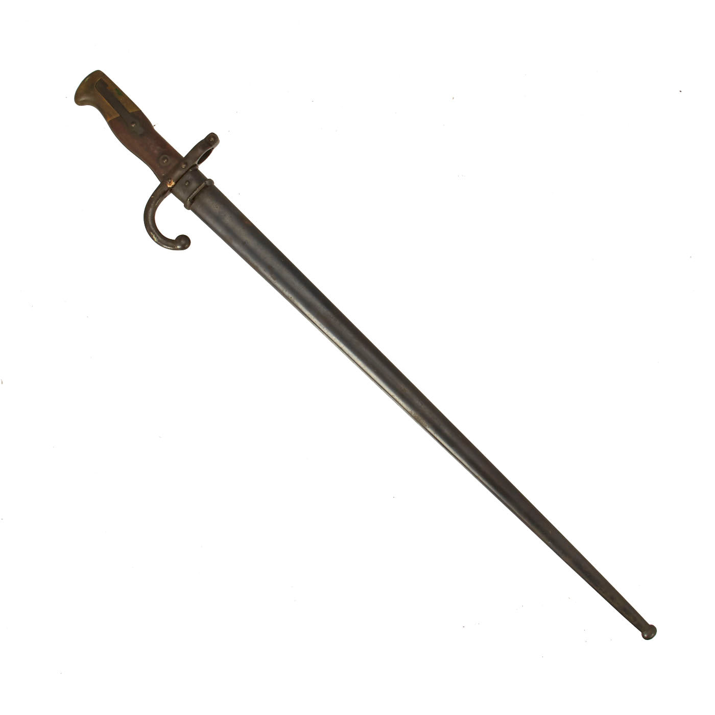 Original Item: Only One Available. This is a very nice early example of the long bladed bayonet for the French Fusil Modèle 1874 "Gras" Rifle, first developed as a cartridge conversion of their Chassepot Fusil modèle 1866 Needle Fire Rifle. The attachment dimensions were the same as the Chassepot, so the original "Yataghan" saber bayonets also fit, but the more modern straight design with the reinforced spine had superior penetrating power against any type of armor.