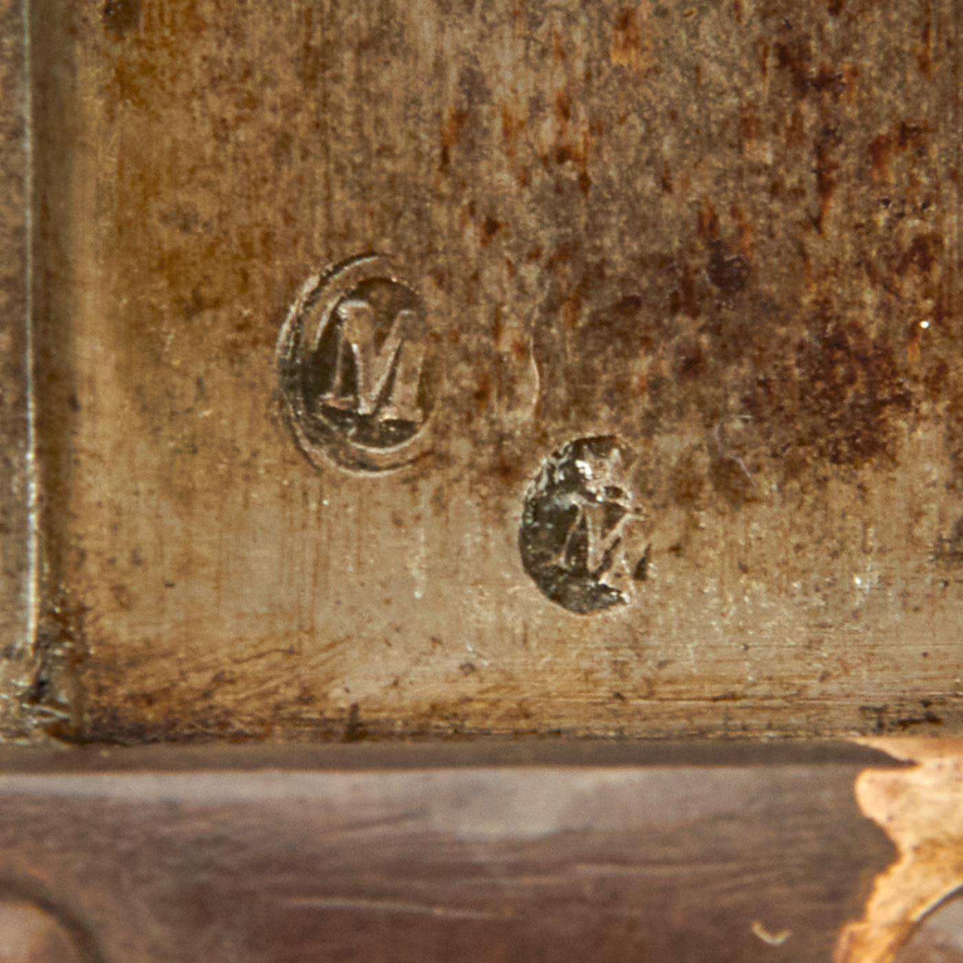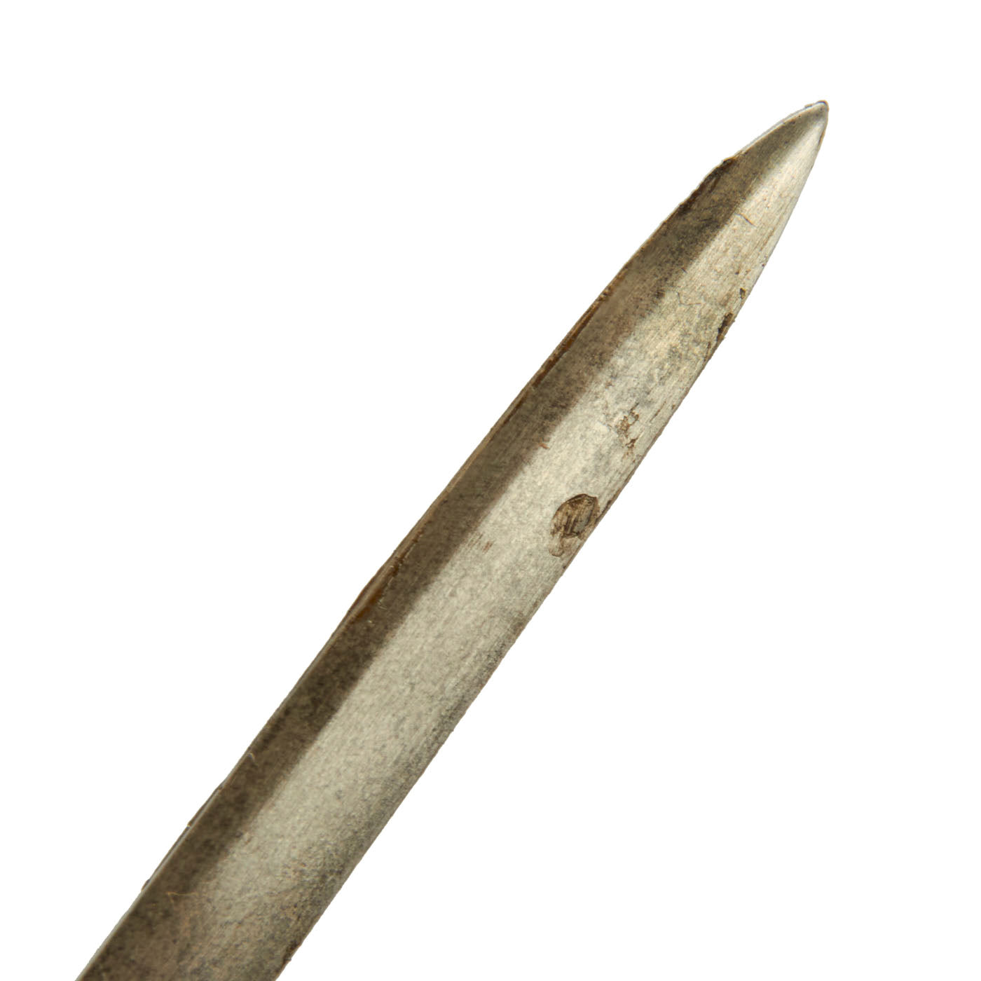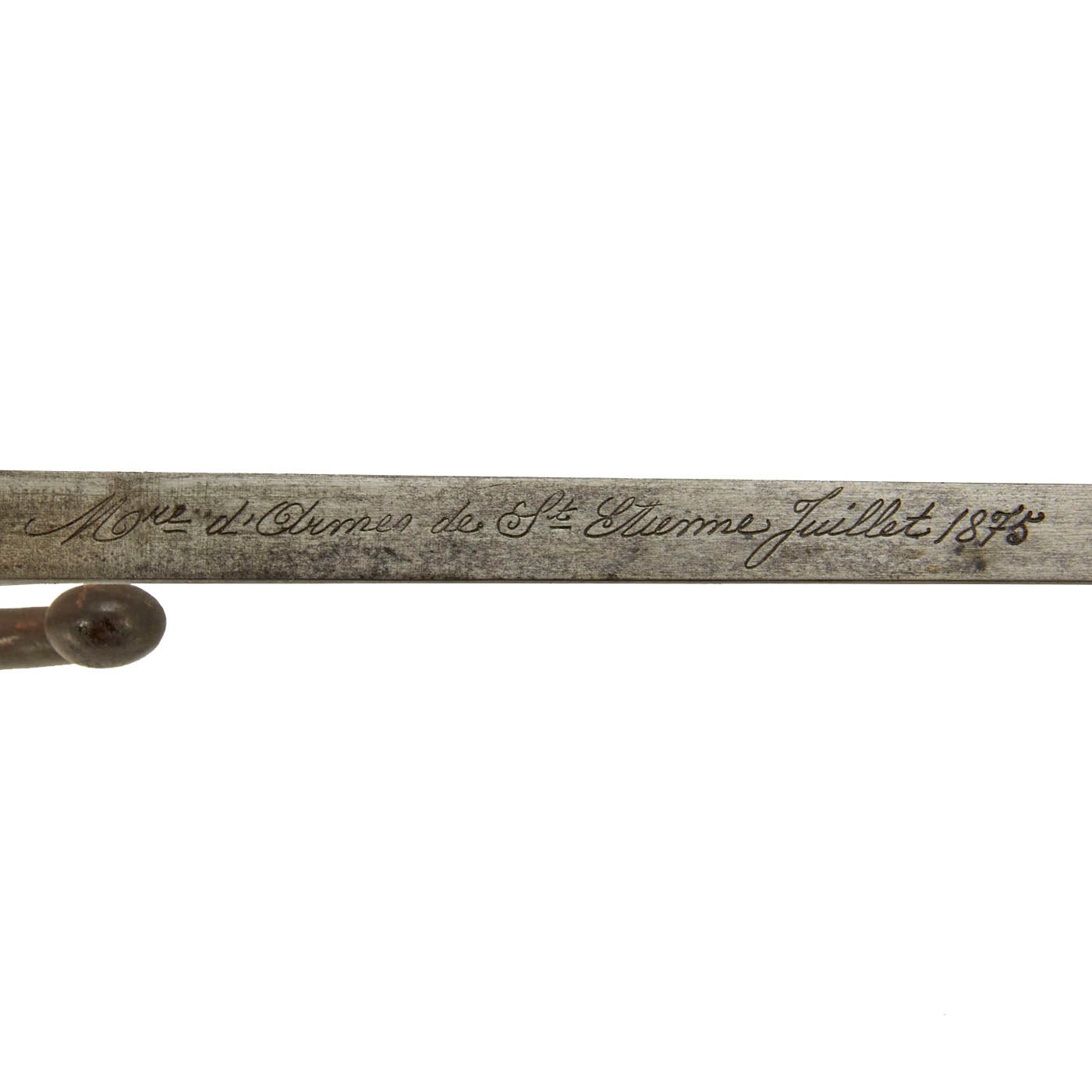 These were very often cut down or altered later on in their service life, and this example has been slightly shortened to have a 19 blade and overall length of 24, It looks like the tip broke off, rather than shortened on purpose. The T-shaped spine of the bayonet is marked M're d'Armes de St. Étienne Juillet 1875, indicating original manufacture at the arsenal in St. Étienne, during July, 1875, relatively early during the production of these bayonets. It is in good condition, with some evidence of past oxidation. It looks like the tip was most likely broken off due to rust, and then profiled. The wood of the handle is nicely worn, and the brass pommel has a yellow green patina.