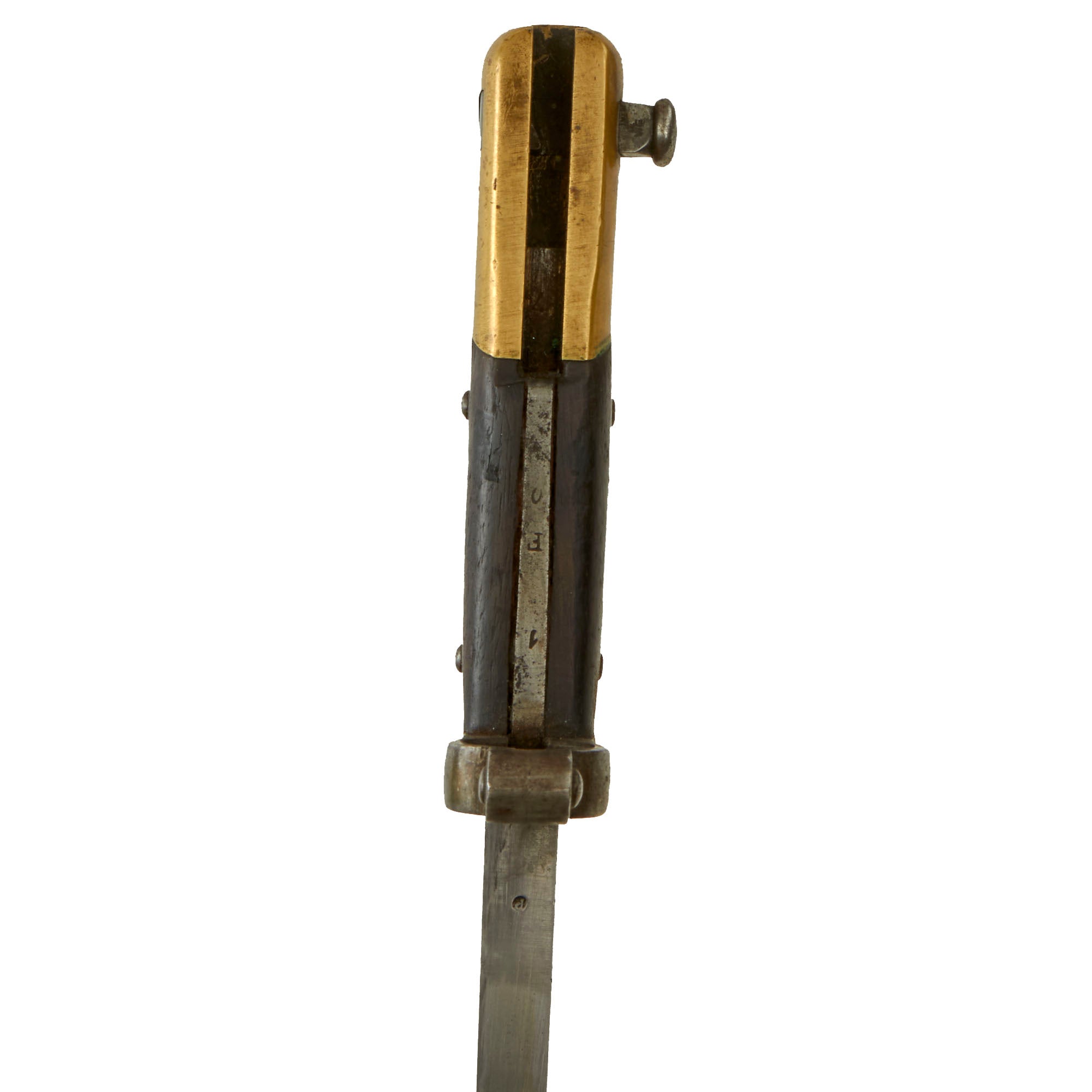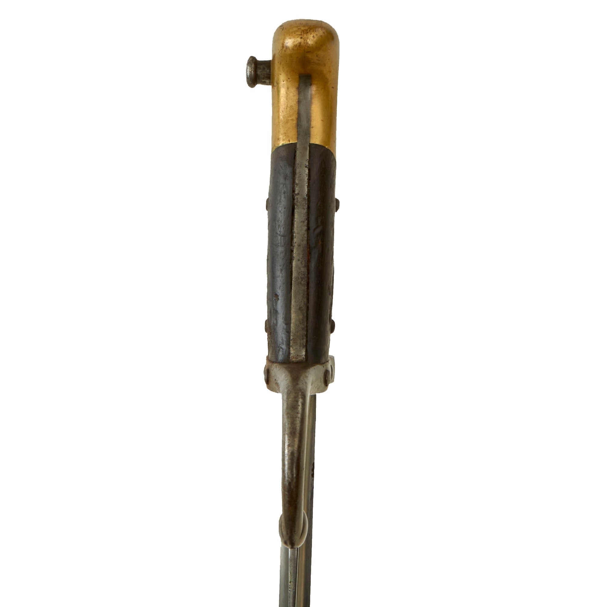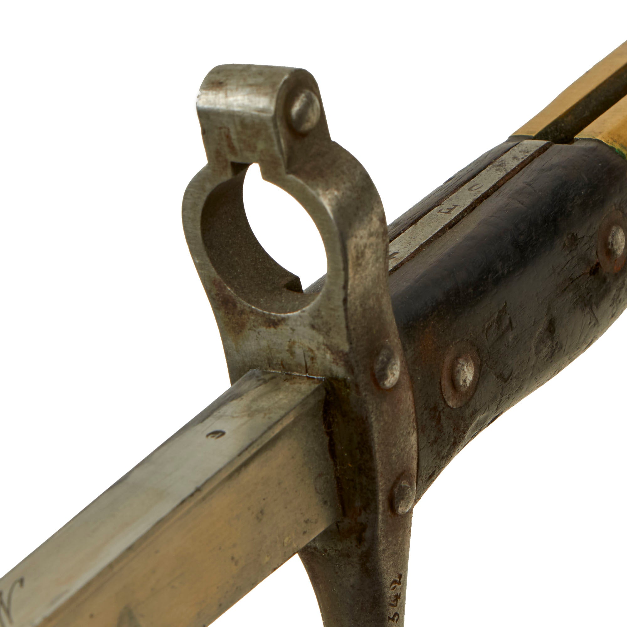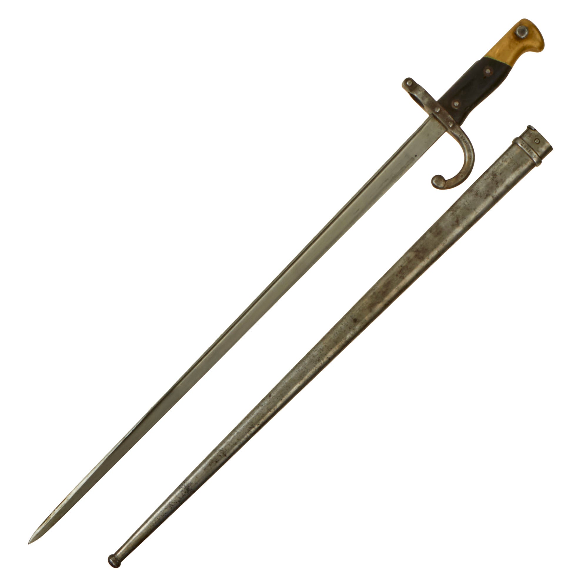 Original Item: Only One Available. This is a very nice early example of the long bladed bayonet for the French Fusil Modèle 1874 "Gras" Rifle, first developed as a cartridge conversion of their Chassepot Fusil modèle 1866 Needle Fire Rifle. The attachment dimensions were the same as the Chassepot, so the original "Yataghan" saber bayonets also fit, but the more modern straight design with the reinforced spine had superior penetrating power against any type of armor.