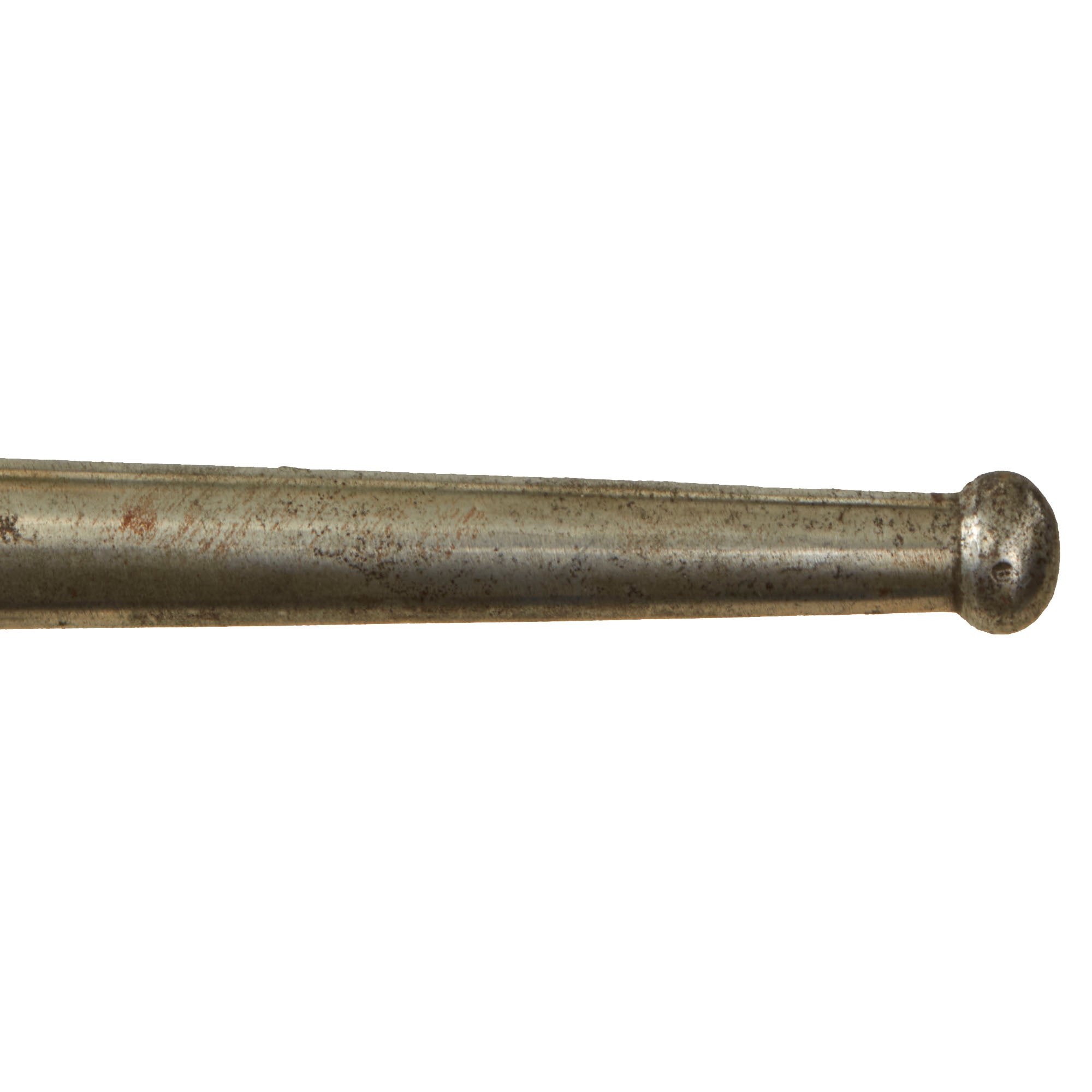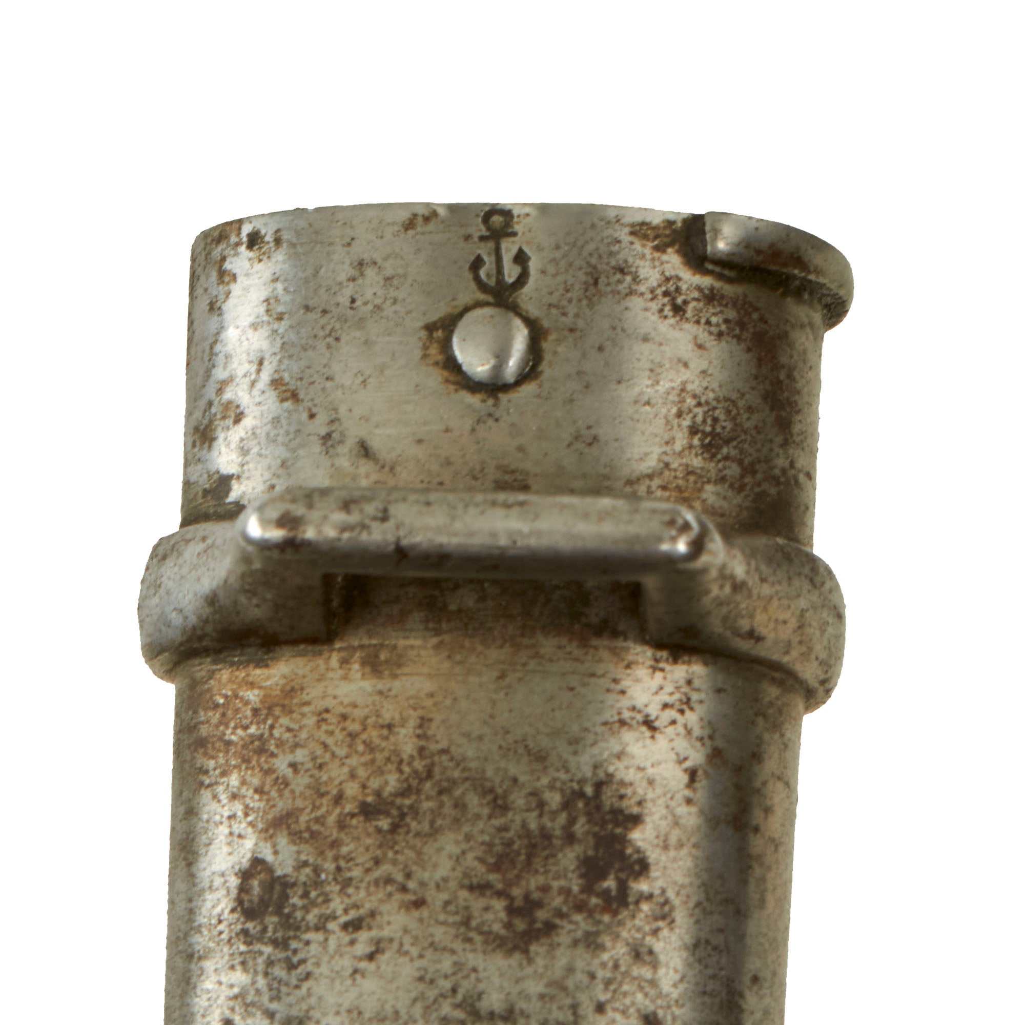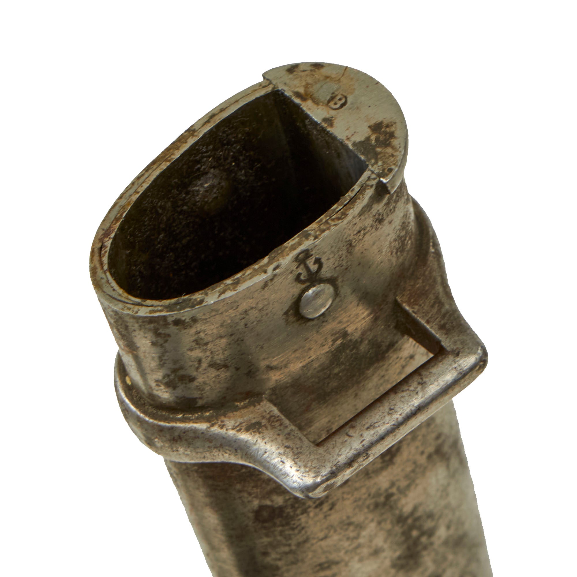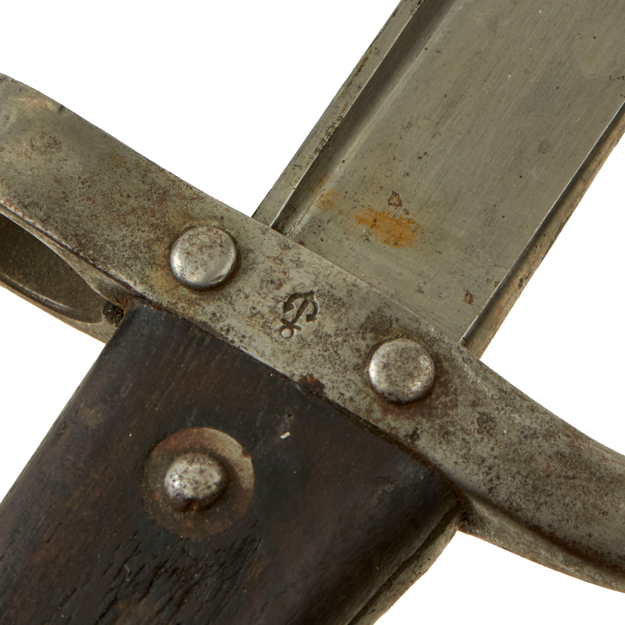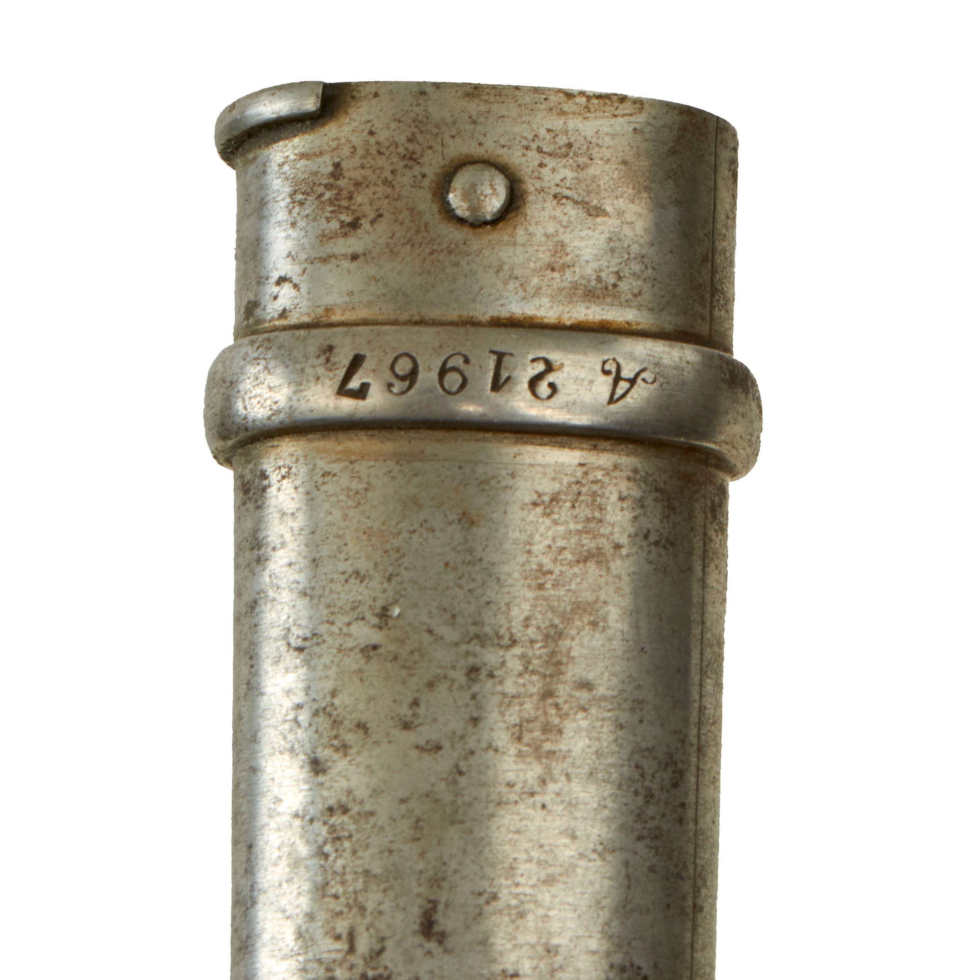 These were very often cut down or altered later on in their service life, though this one was not. The T-shaped spine of the bayonet is marked M’re de Steyr, M’re de Wernd, 1879, indicating original Manufacture at Steyr Werndl in 1879. This is one of the scarcest makers of this bayonet. This example has serial number 10432 on the bayonet and 21967 on the scabbard. Both the bayonet and scabbard are marked with Navy Anchors indicating colonial issue.