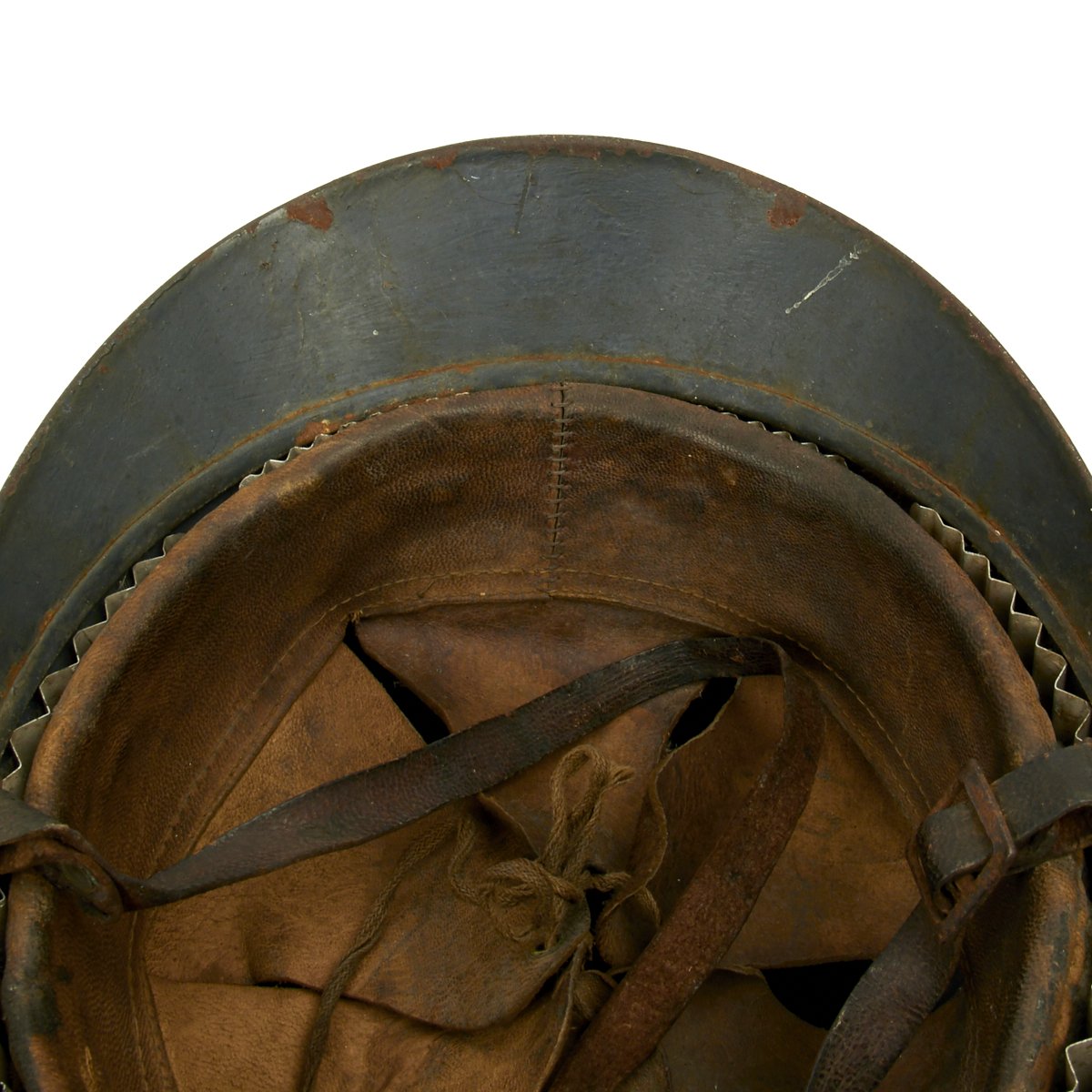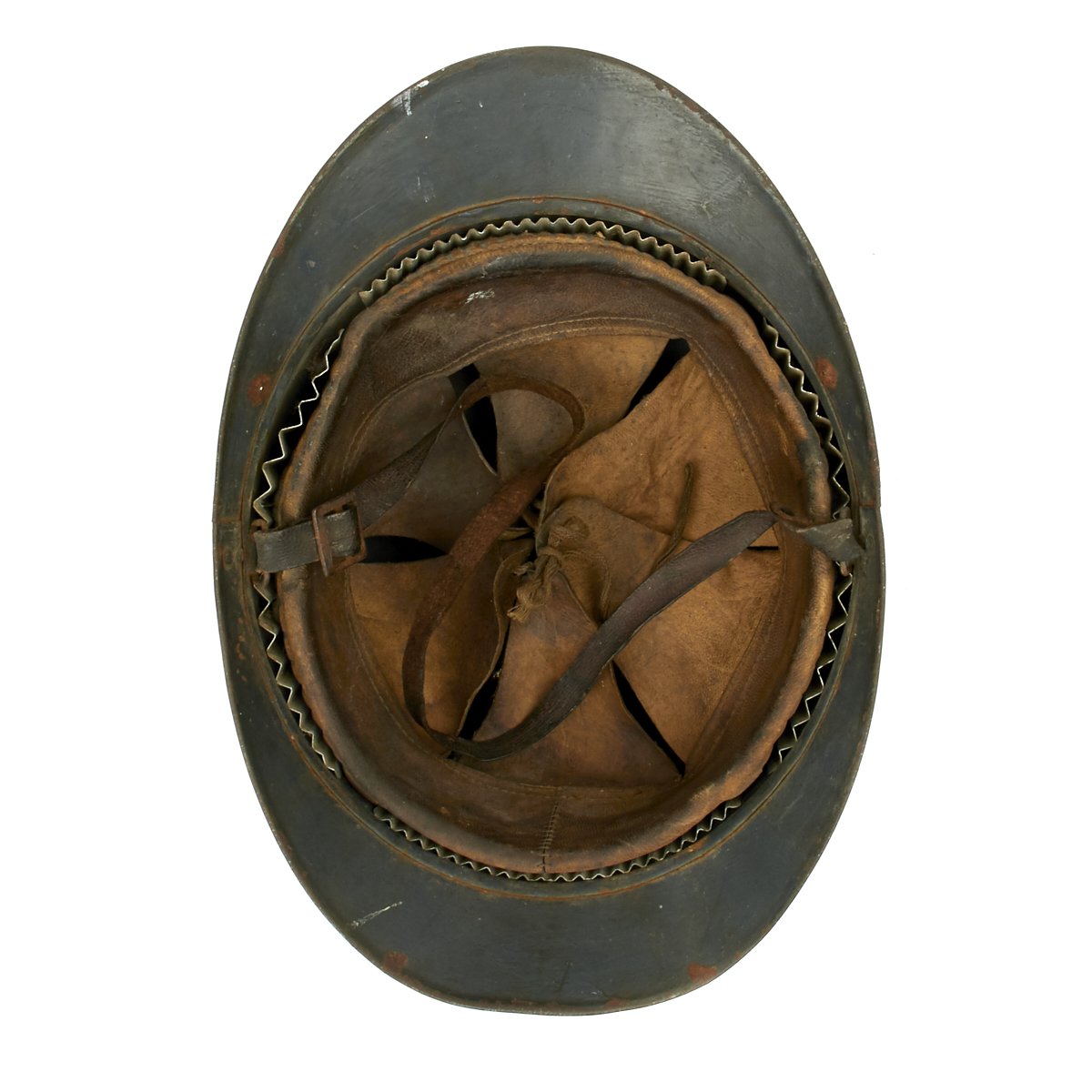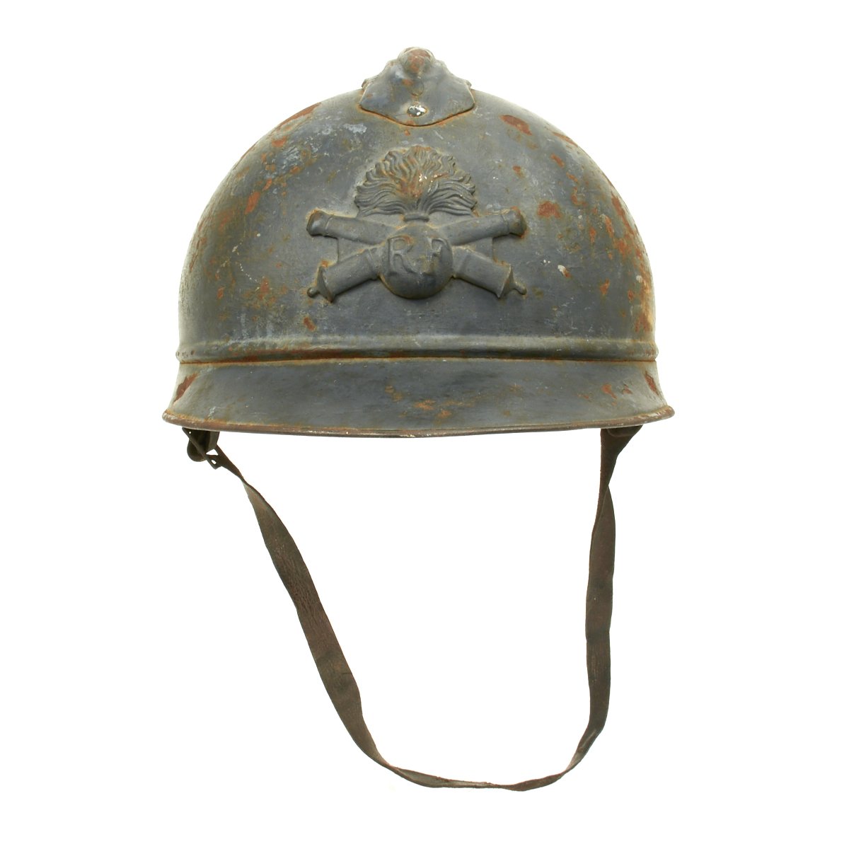 Original Item: Only One Available. Excellent genuine World War I M1915 French Army Artillery "Adrian" helmet. The helmet retains the original "dark horizon blue" paint and has a plate with large bomb insignia, crossed cannons and RF to the front. Size is approximately US 7 (56cm). Features a wonderful complete original leather liner in excellent condition, with complete leather chinstrap. Liner is ink stamped R.G.F. Overall condition of the helmet is very good, shell shows some minor dings, paint ships and areas of minor surface rust.