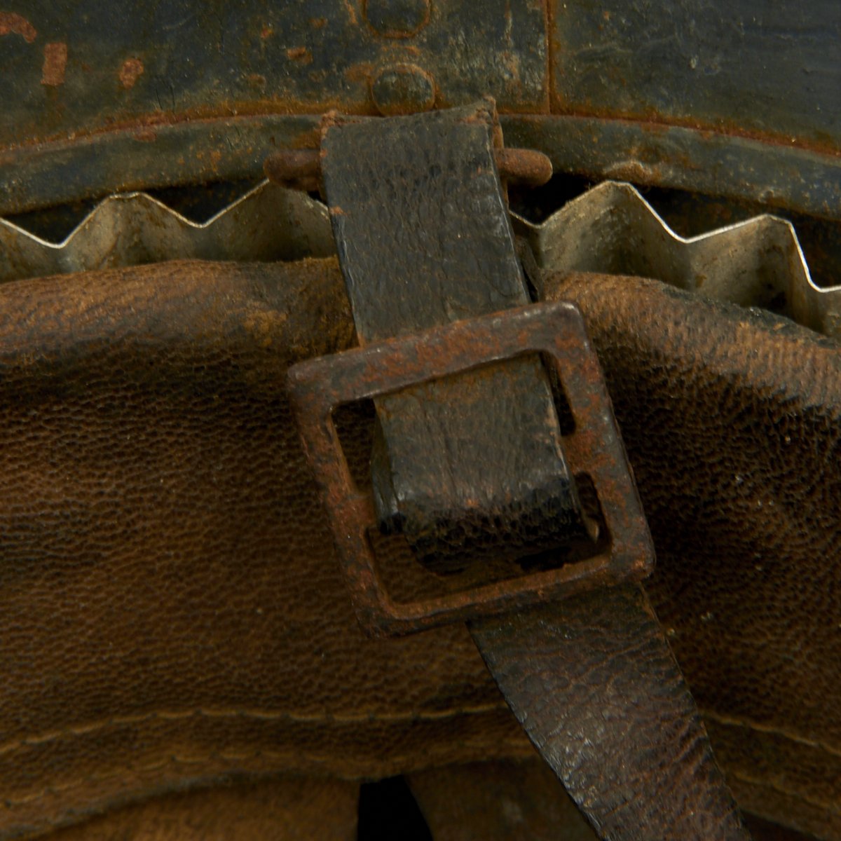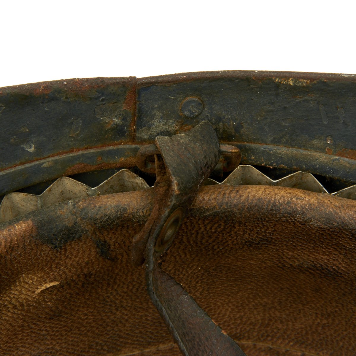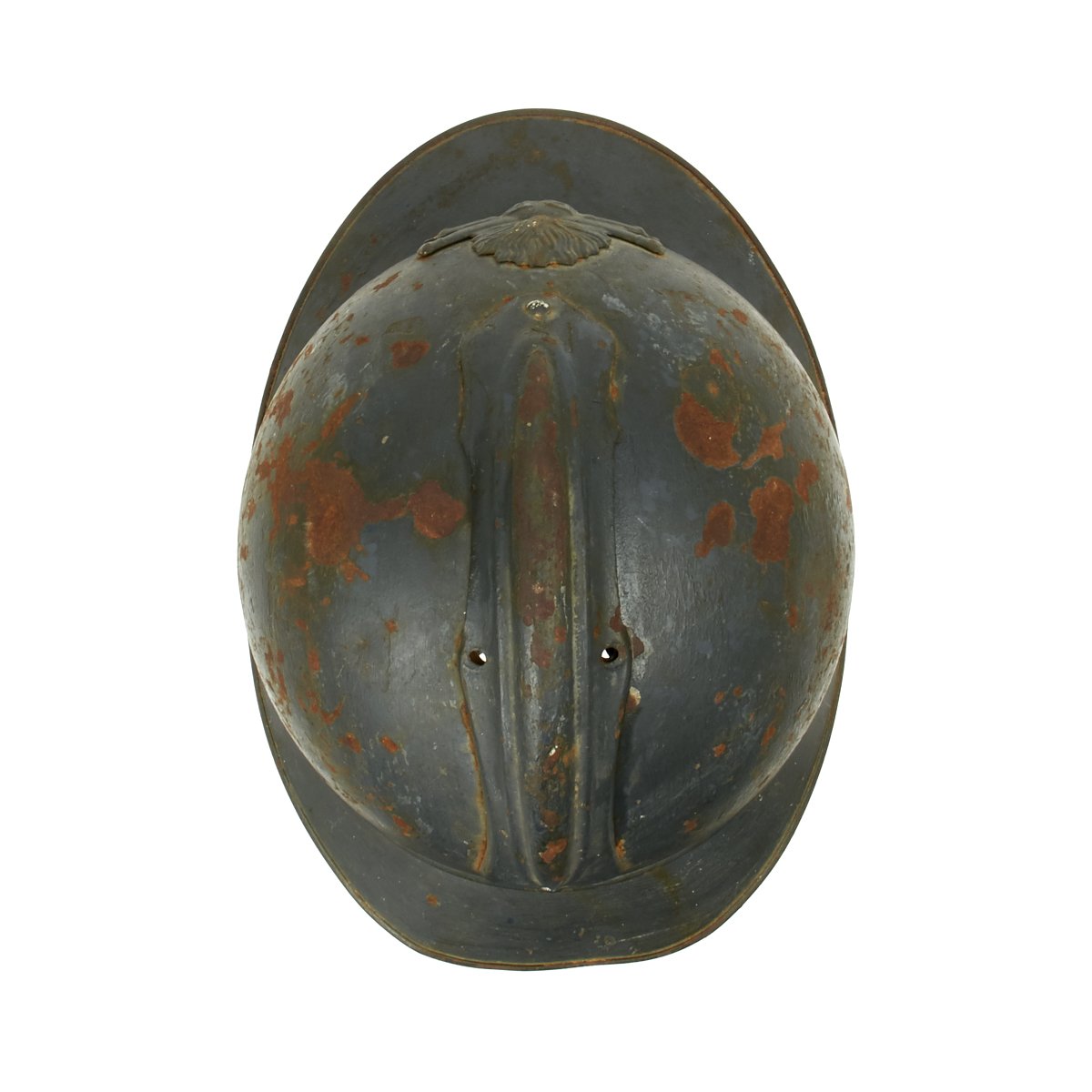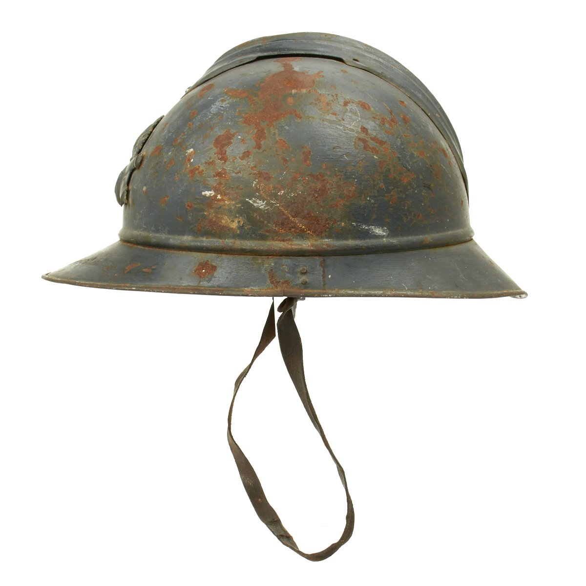 Original Item: Only One Available. Excellent genuine World War I M1915 French Army Artillery "Adrian" helmet. The helmet retains the original "dark horizon blue" paint and has a plate with large bomb insignia, crossed cannons and RF to the front. Size is approximately US 7 (56cm). Features a wonderful complete original leather liner in excellent condition, with complete leather chinstrap. Liner is ink stamped R.G.F. Overall condition of the helmet is very good, shell shows some minor dings, paint ships and areas of minor surface rust.