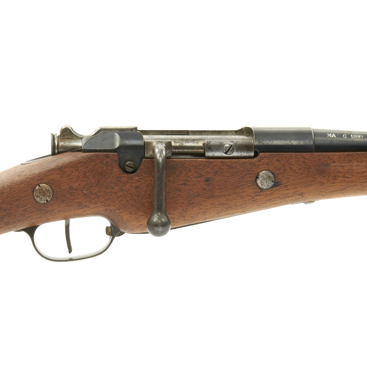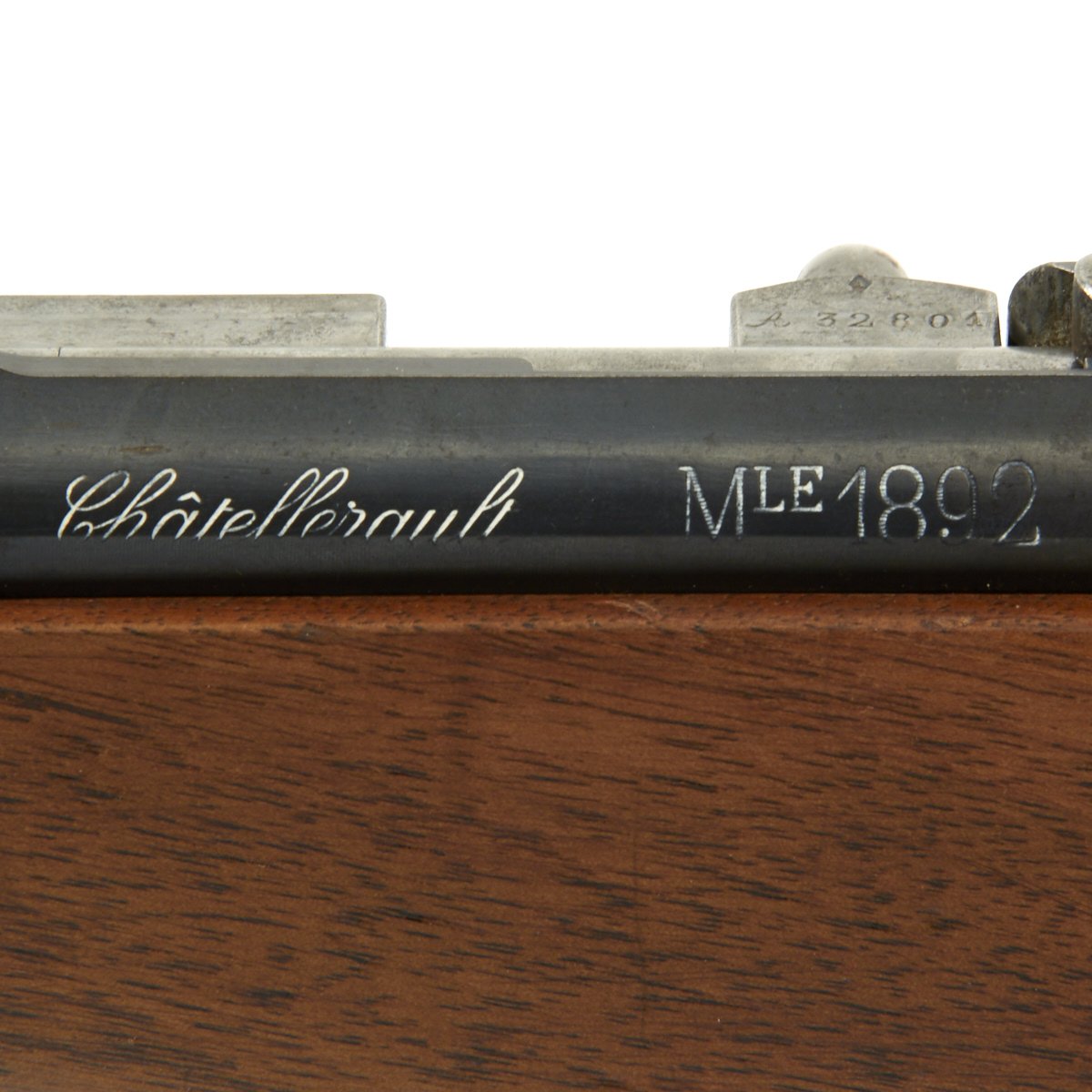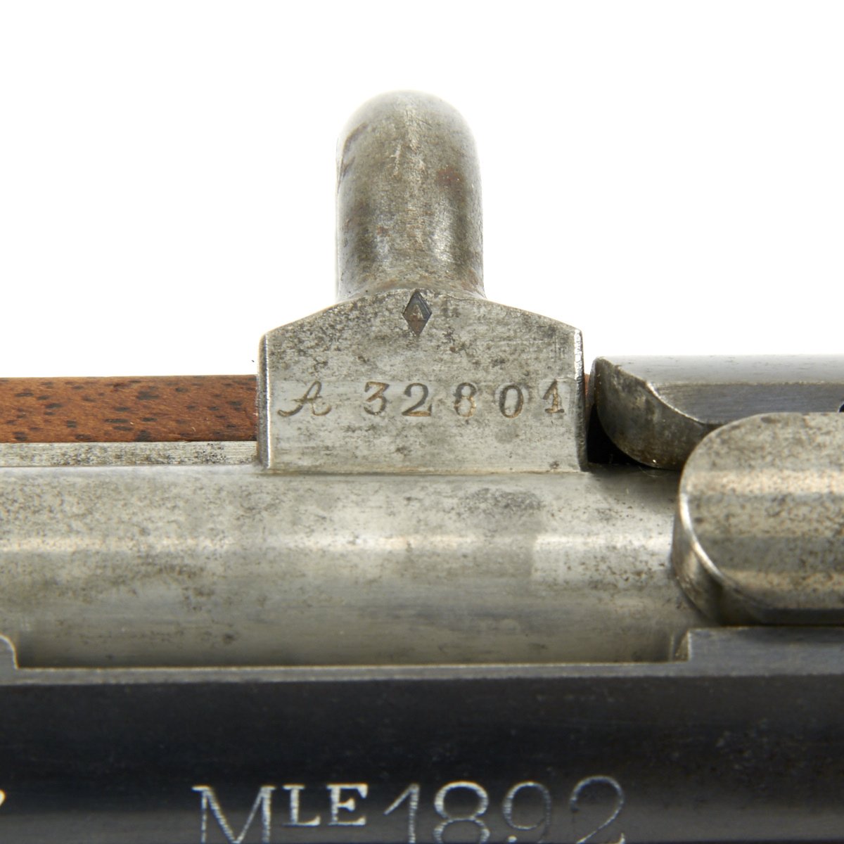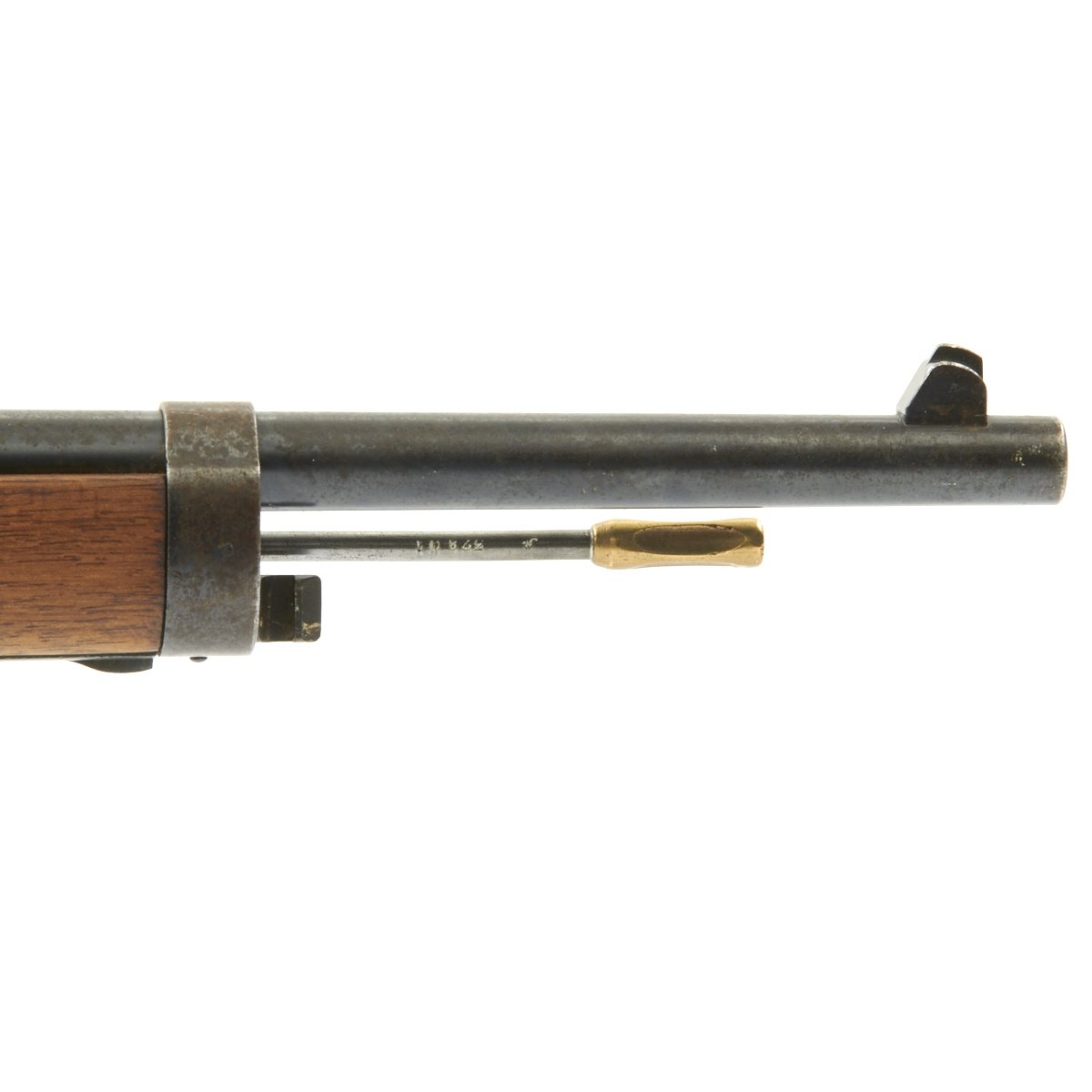 The left side of the receiver on this fine example is clearly marked with Châtellerault, and to the right MLE 1892, indicating manufacture at the government arsenal at Châtellerault. The rifle has arsenal proofs on most parts, and also is marked MA C 1892, the abbreviation for Manufacture d'Armes Châtellerault, indicating that it was produced in 1890, and later updated with the bolt modification after 1893. The rifle has serial number A 32801 on the barrel, bolt, cleaning rod and receiver floor plate/trigger guard. It also was marked on the left side of the butt stock, but this is faded due to refinishing. The carbine is fitted with a large Saddle Ring on the left side of the 17" barrel. It still retains its original brass tipped cleaning rod.