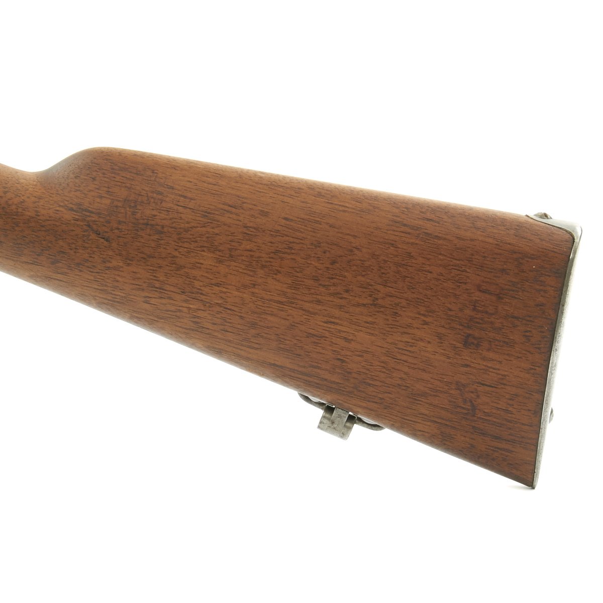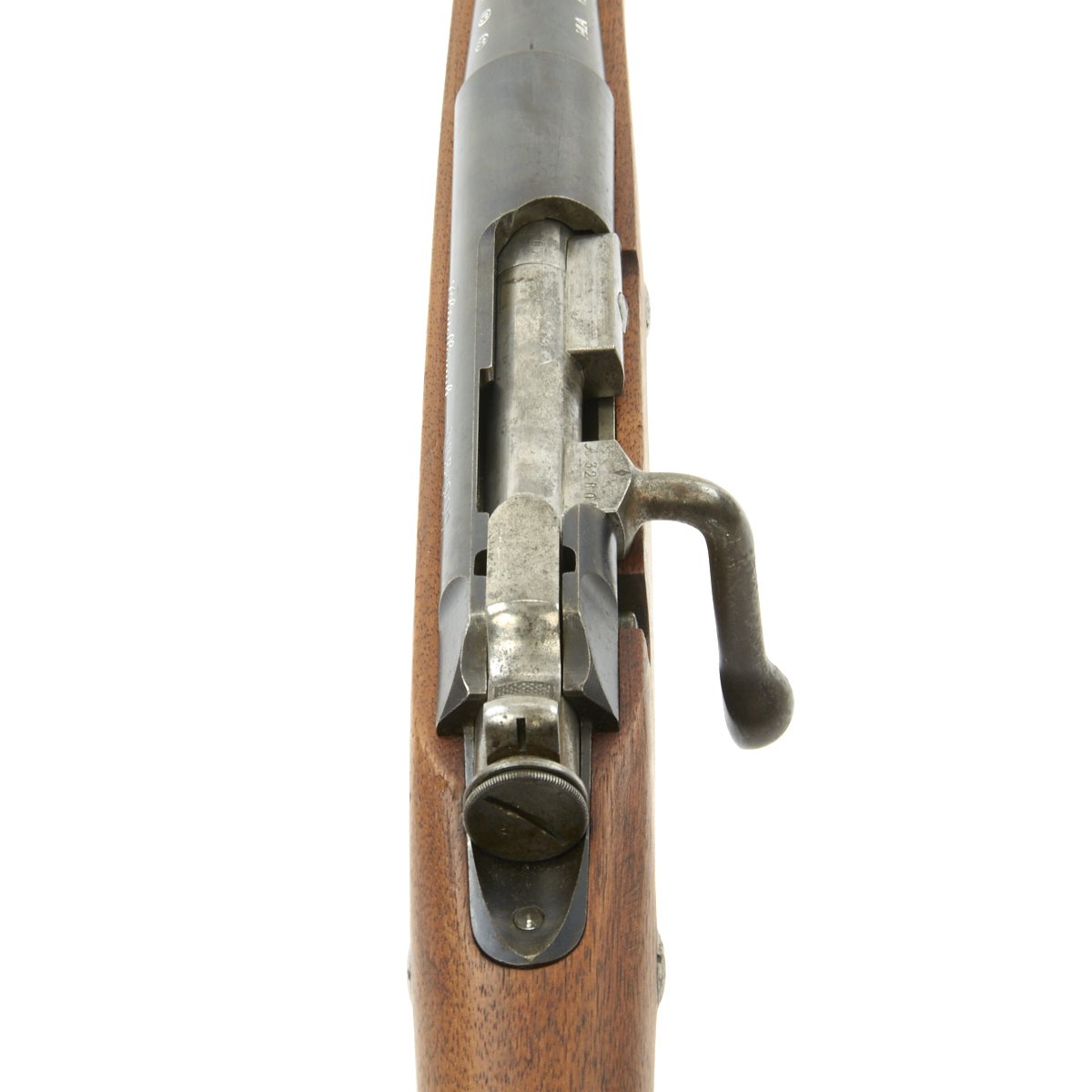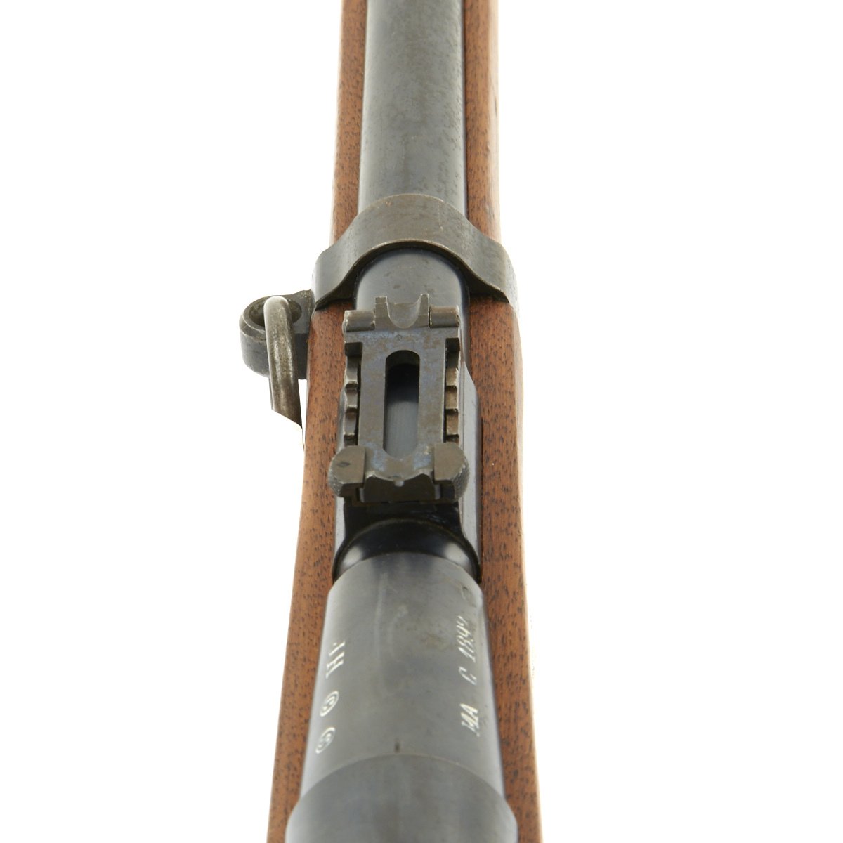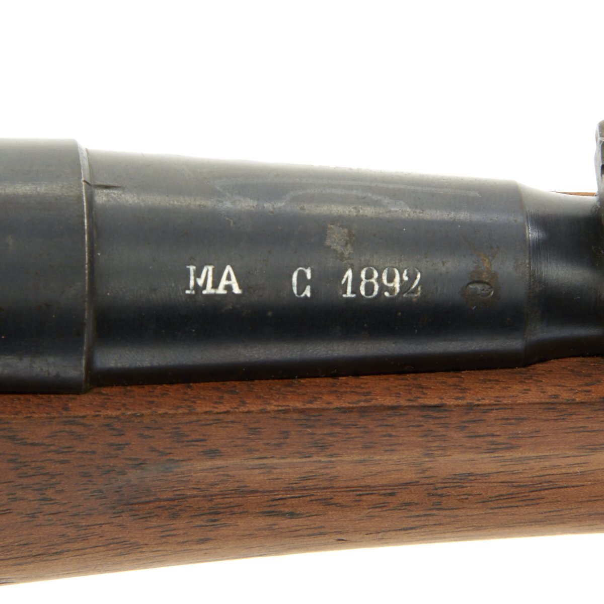 The left side of the receiver on this fine example is clearly marked with Châtellerault, and to the right MLE 1892, indicating manufacture at the government arsenal at Châtellerault. The rifle has arsenal proofs on most parts, and also is marked MA C 1892, the abbreviation for Manufacture d'Armes Châtellerault, indicating that it was produced in 1890, and later updated with the bolt modification after 1893. The rifle has serial number A 32801 on the barrel, bolt, cleaning rod and receiver floor plate/trigger guard. It also was marked on the left side of the butt stock, but this is faded due to refinishing. The carbine is fitted with a large Saddle Ring on the left side of the 17" barrel. It still retains its original brass tipped cleaning rod.