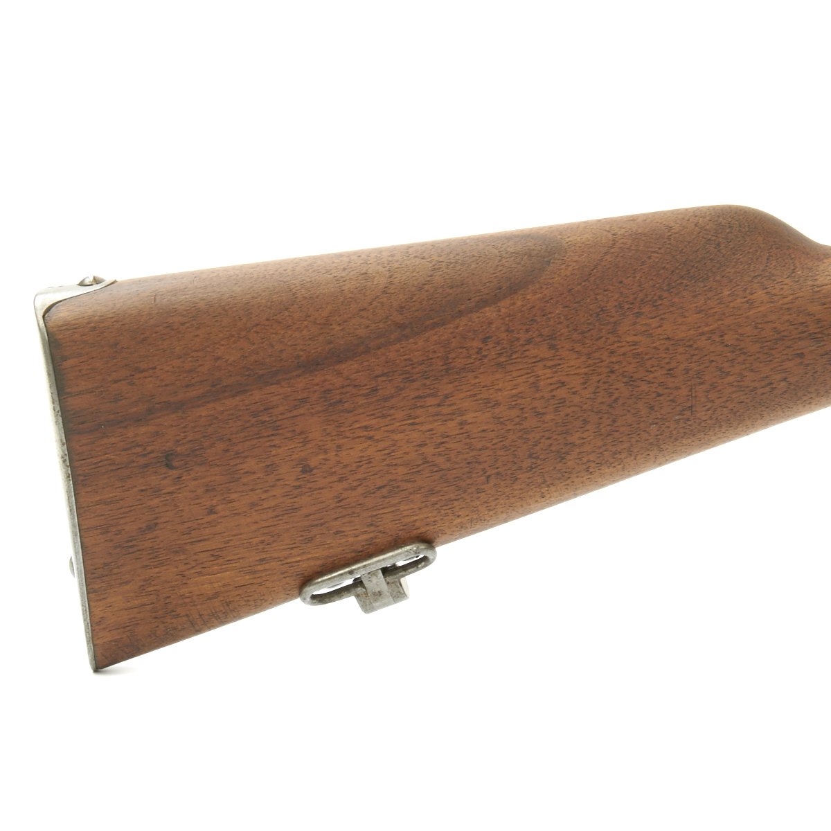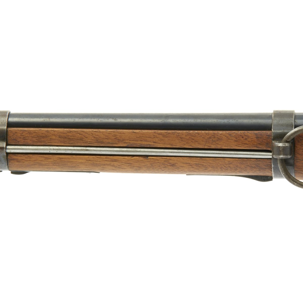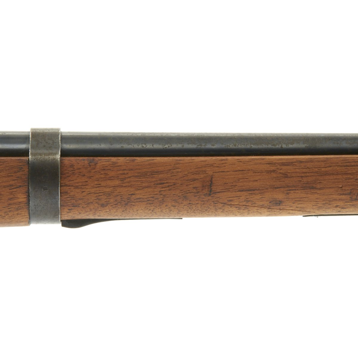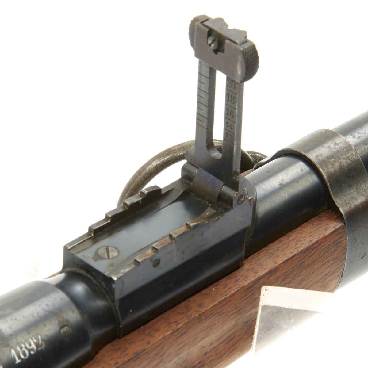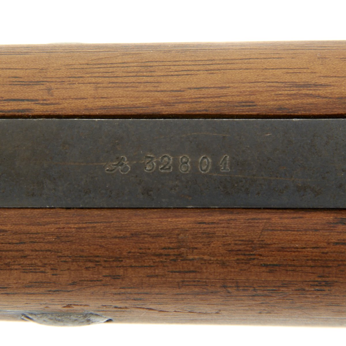 The left side of the receiver on this fine example is clearly marked with Châtellerault, and to the right MLE 1892, indicating manufacture at the government arsenal at Châtellerault. The rifle has arsenal proofs on most parts, and also is marked MA C 1892, the abbreviation for Manufacture d'Armes Châtellerault, indicating that it was produced in 1890, and later updated with the bolt modification after 1893. The rifle has serial number A 32801 on the barrel, bolt, cleaning rod and receiver floor plate/trigger guard. It also was marked on the left side of the butt stock, but this is faded due to refinishing. The carbine is fitted with a large Saddle Ring on the left side of the 17" barrel. It still retains its original brass tipped cleaning rod.