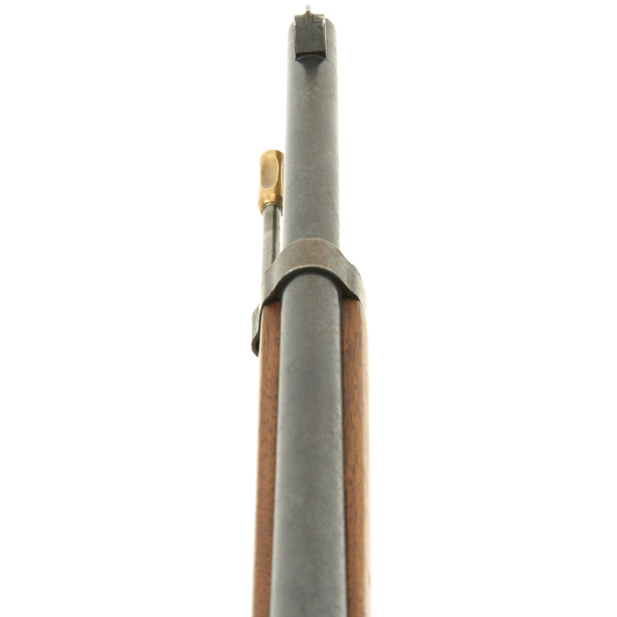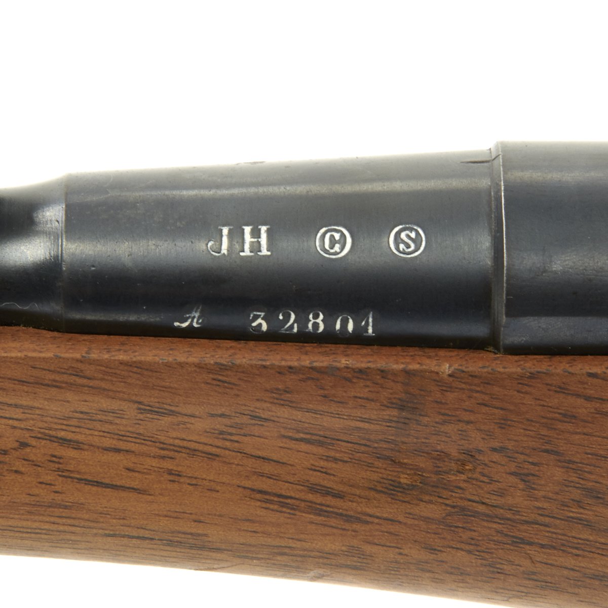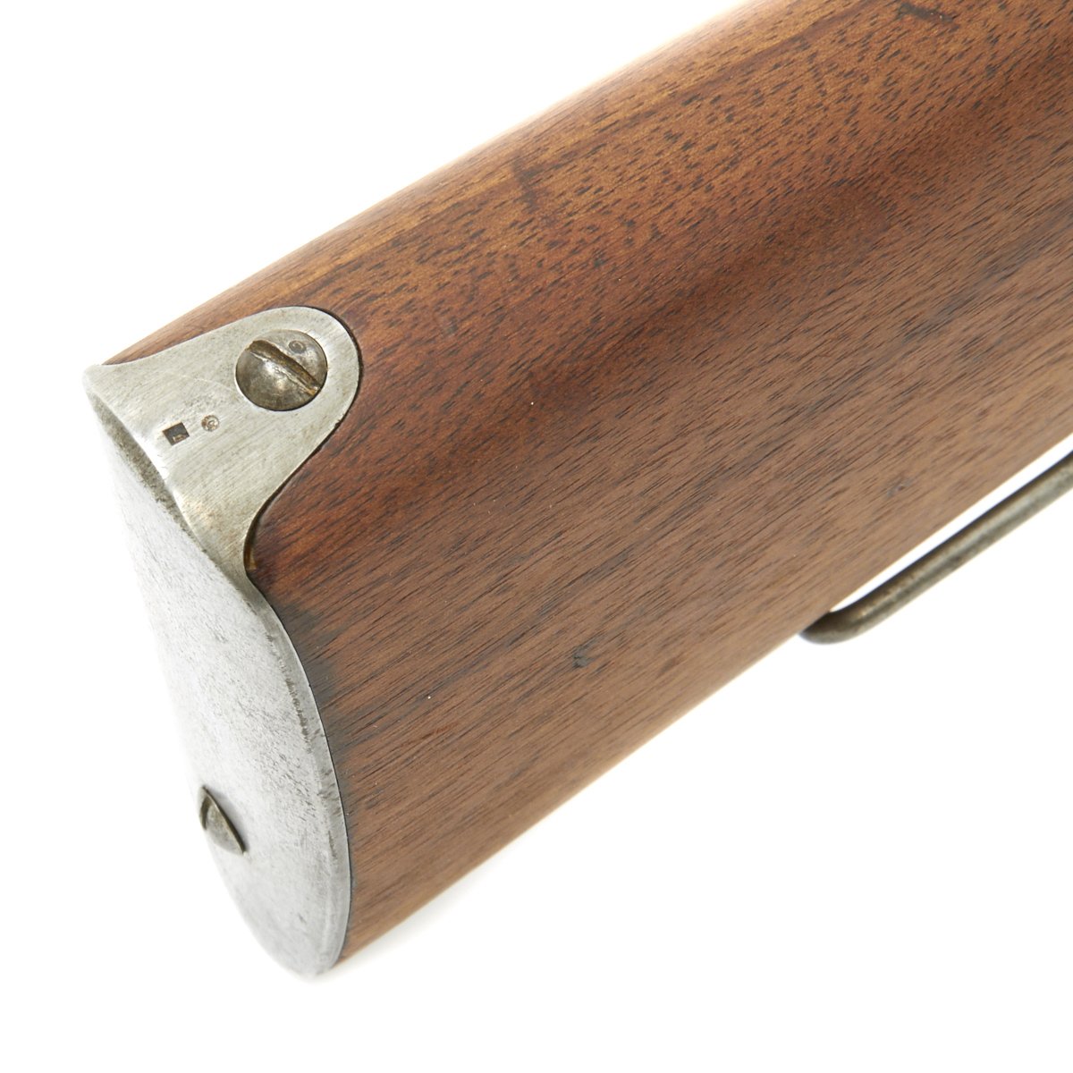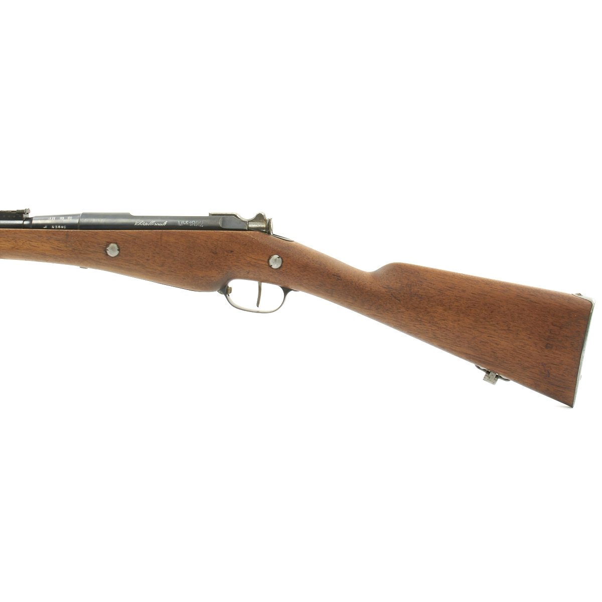 The left side of the receiver on this fine example is clearly marked with Châtellerault, and to the right MLE 1892, indicating manufacture at the government arsenal at Châtellerault. The rifle has arsenal proofs on most parts, and also is marked MA C 1892, the abbreviation for Manufacture d'Armes Châtellerault, indicating that it was produced in 1890, and later updated with the bolt modification after 1893. The rifle has serial number A 32801 on the barrel, bolt, cleaning rod and receiver floor plate/trigger guard. It also was marked on the left side of the butt stock, but this is faded due to refinishing. The carbine is fitted with a large Saddle Ring on the left side of the 17" barrel. It still retains its original brass tipped cleaning rod.