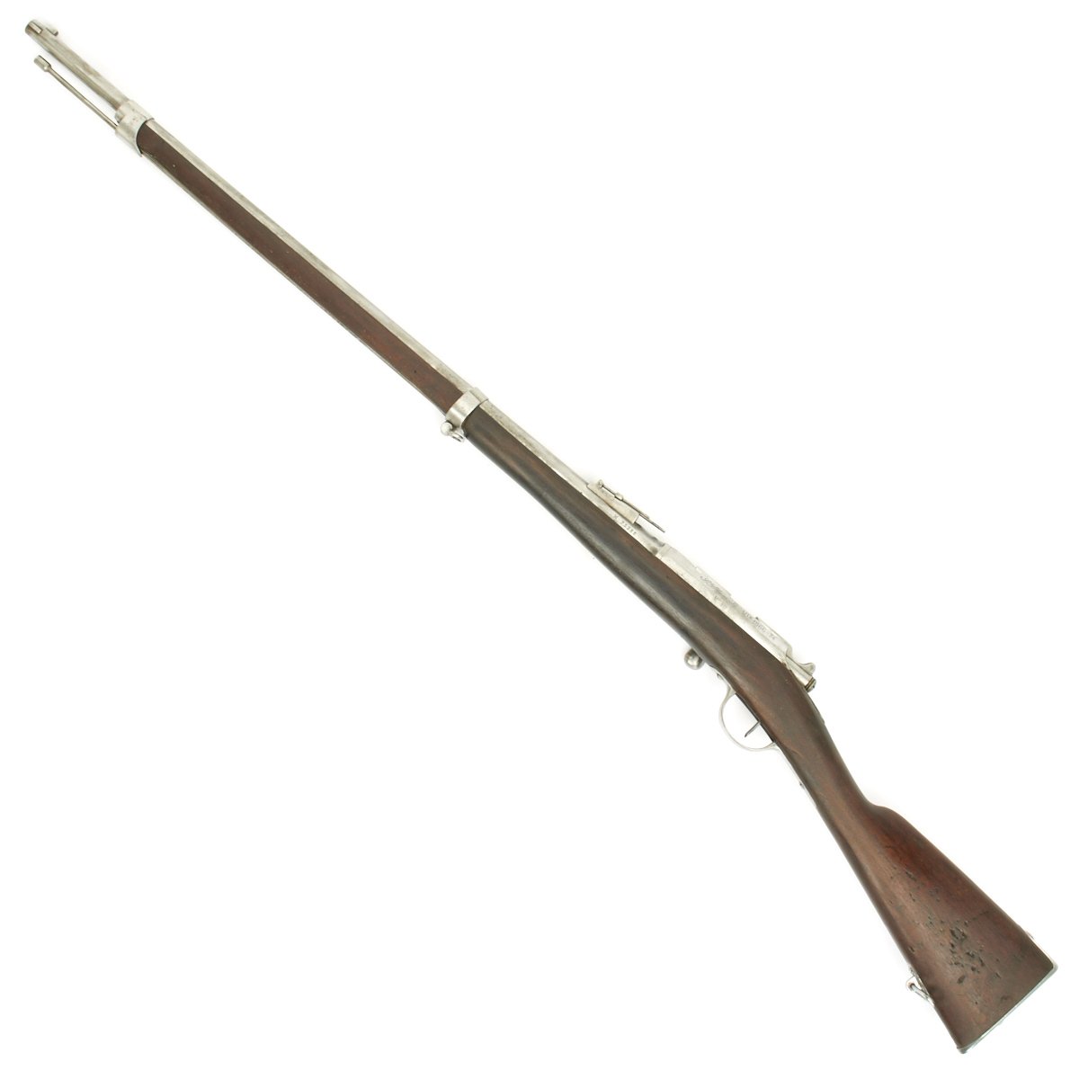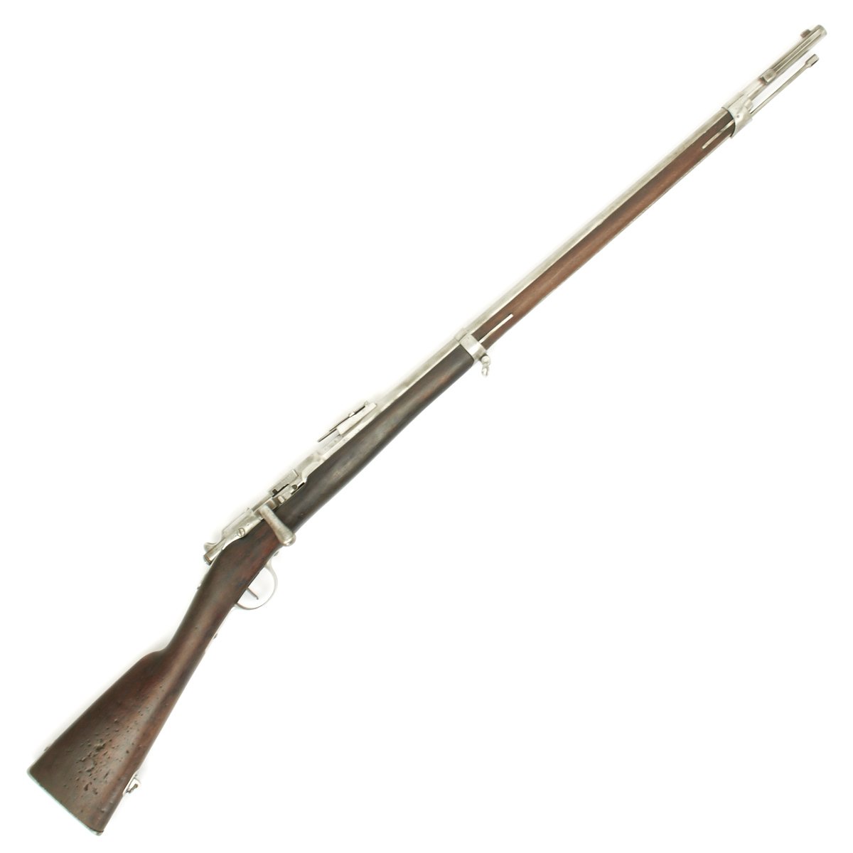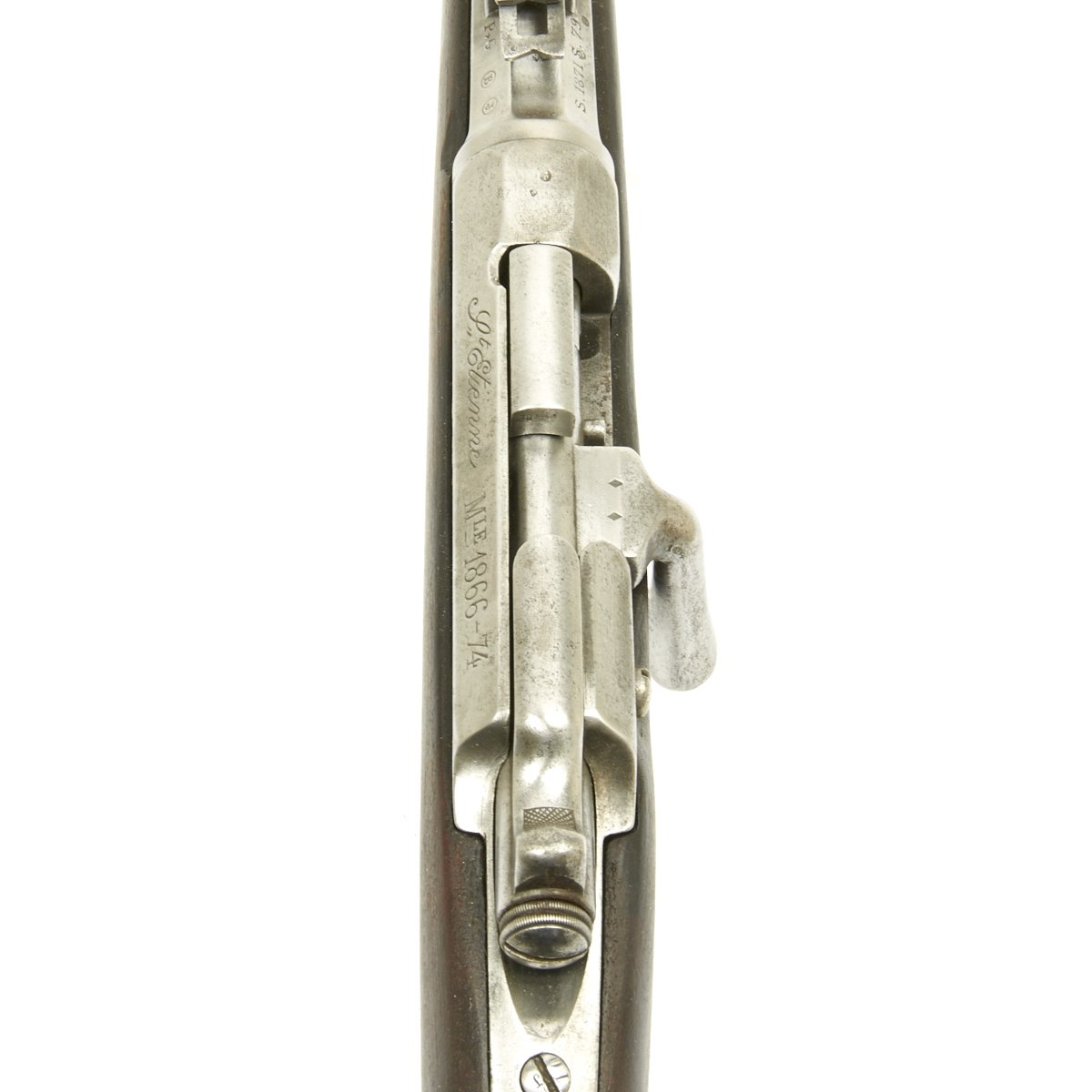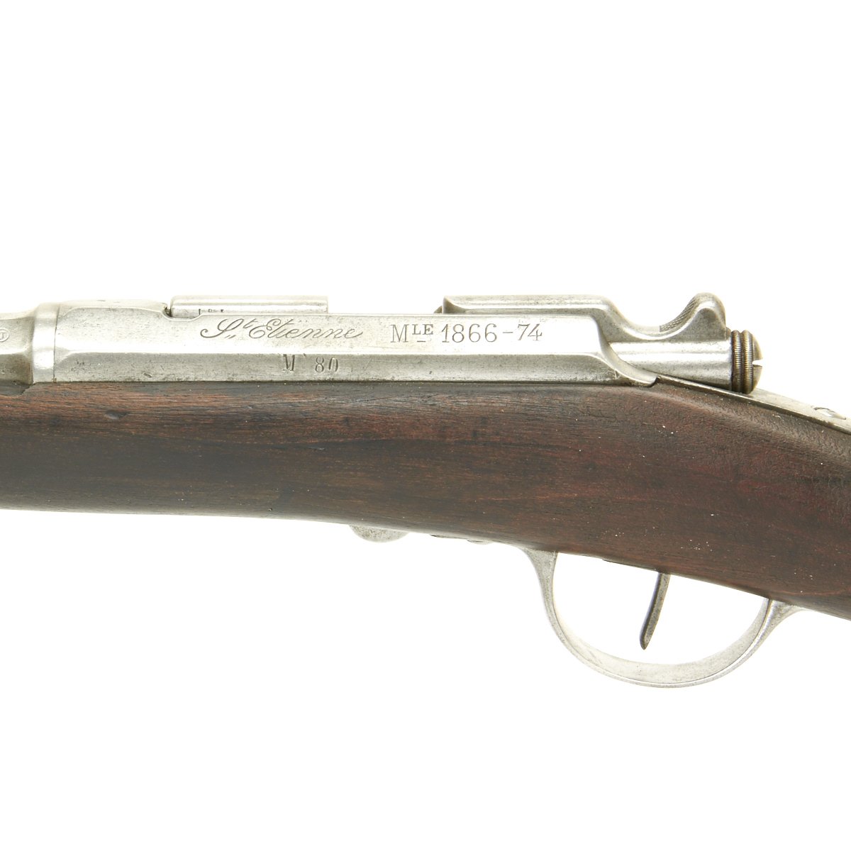 Original Item: Only One Available. The Fusil Gras Modèle 1874 M80 was a French service rifle of the 19th century. The Gras used by the French Army was an adaptation to metallic cartridge of the Chassepot breech-loading rifle by Colonel Basile Gras. This example was originally a needle fire Chassepot, the French ignition system introduced in 1866. It was a single shot bolt-action rifle and was among the best of its kind at the type, being superior to the German Dreyse Needle fire system. It was quickly surpassed however, principally by the British Martini-Henry system. In 1874 the self contained cartridge Gras bolt-action system was introduced, and the Chassepots in service were converted to this system, and had additional markings added indicating this.