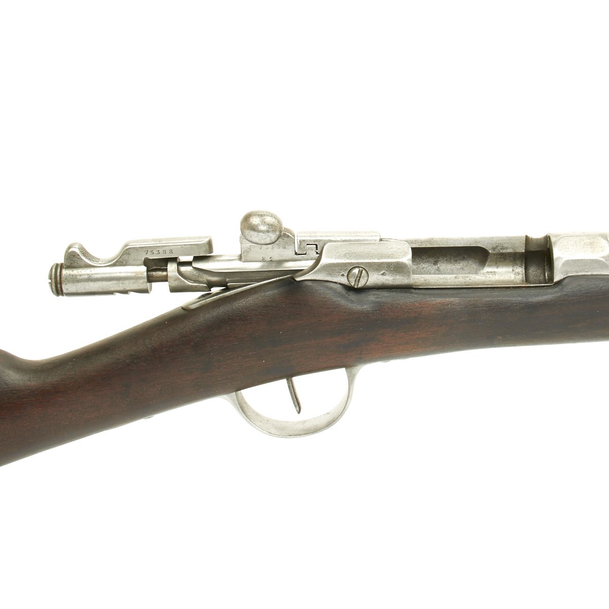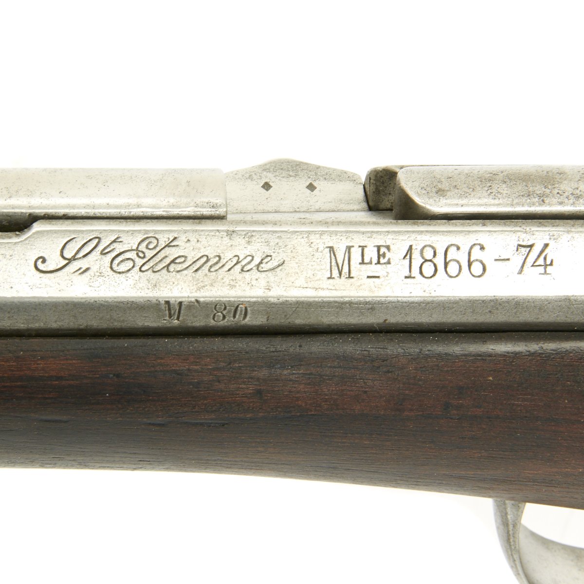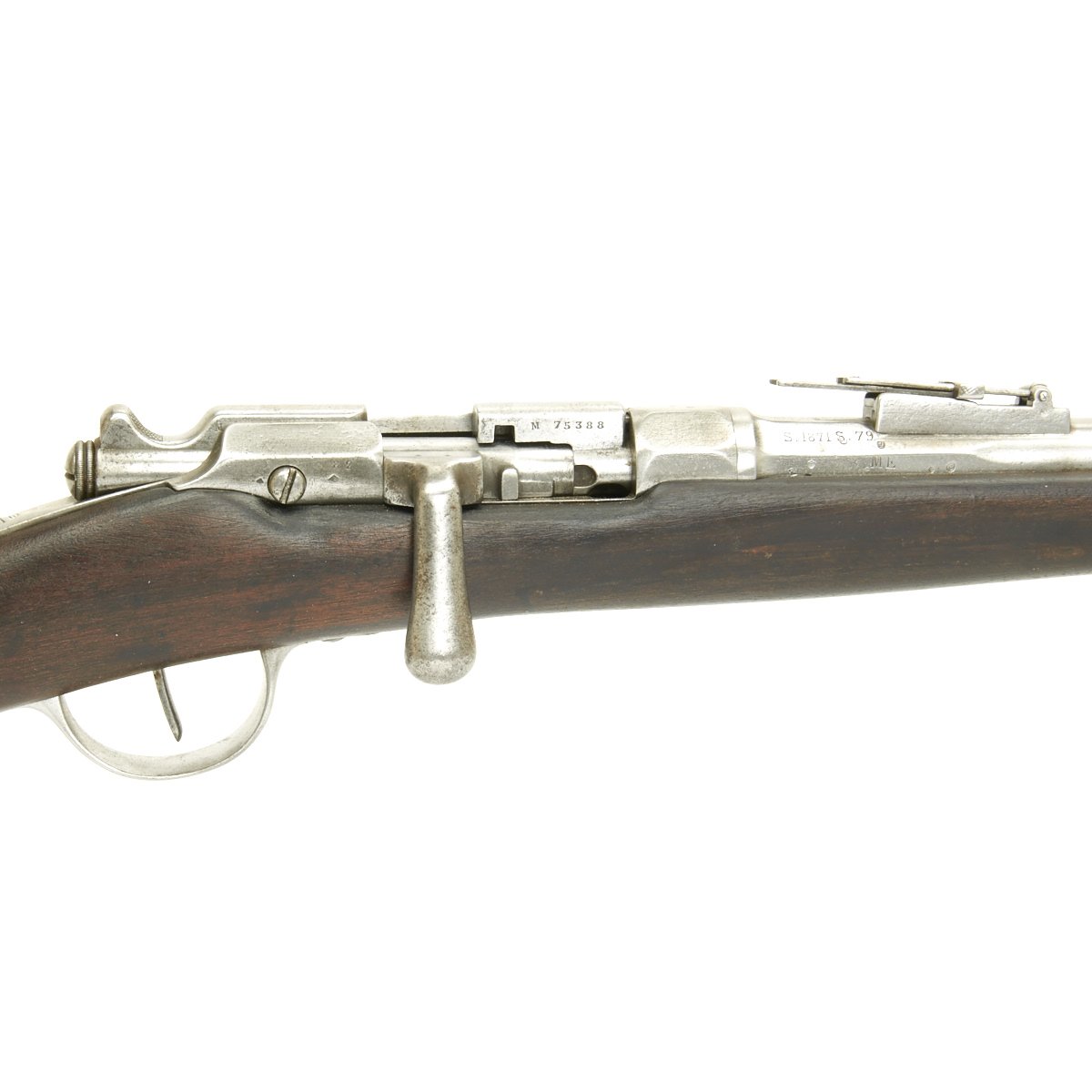 The left side of the receiver marked St. Étienne MLE 1866 - 74 / M80 indicating manufacture at the government arsenal at St. Etienne. The rifle has arsenal proofs on most parts, and also is marked S.1871 S.79 indicating that it was originally manufactured as a Chassepot in 1871, an then converted to Gras in 1879. The rifle has all matching serial numbers, with M 75388 on the barrel, bayonet stand, and all parts of the bolt. There is no stock serial number visible, as wear has obliterated virtually all stock markings.