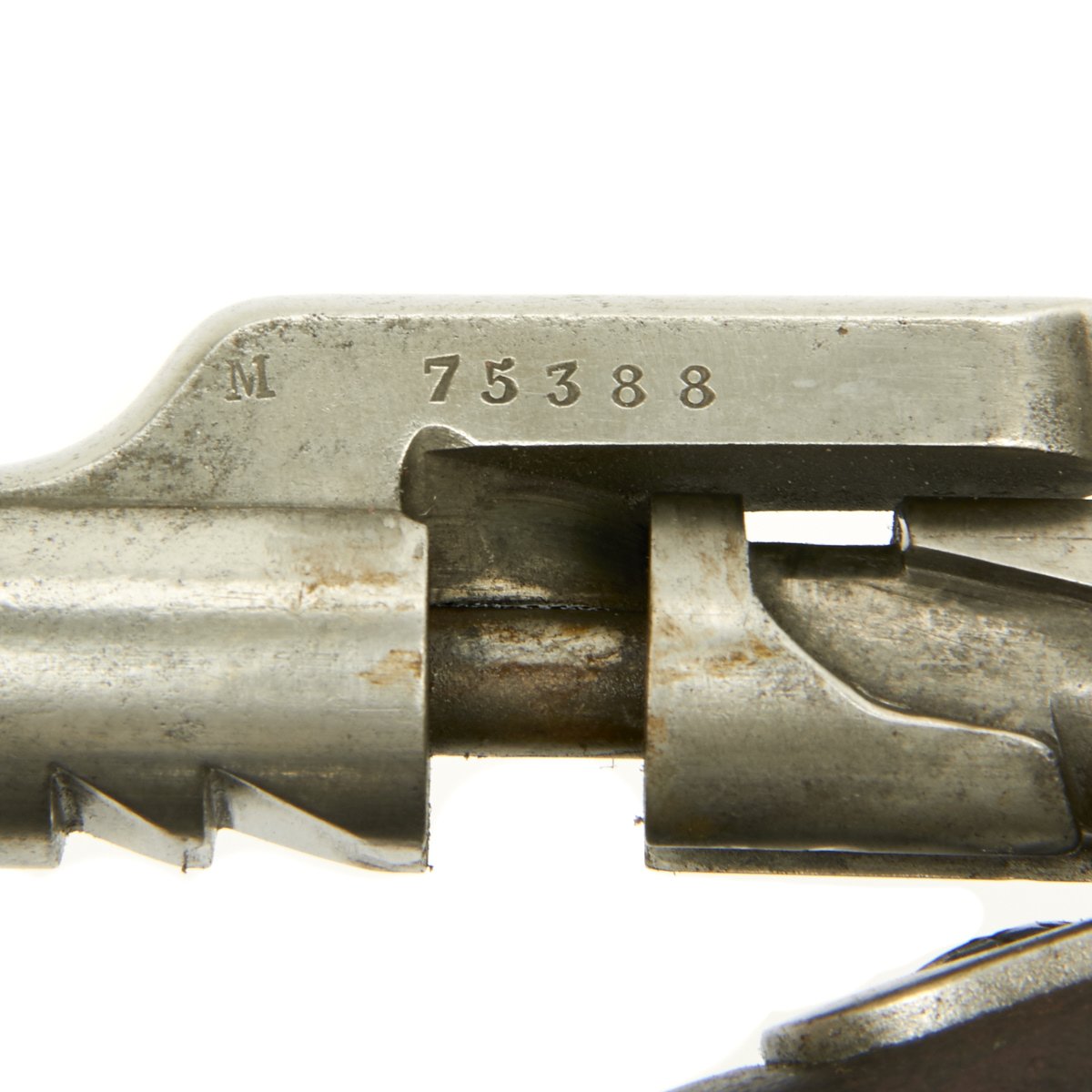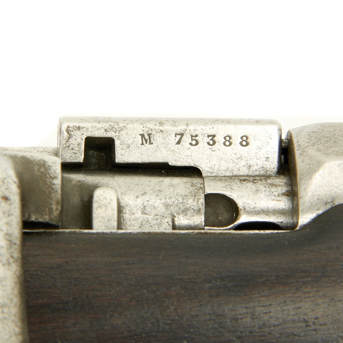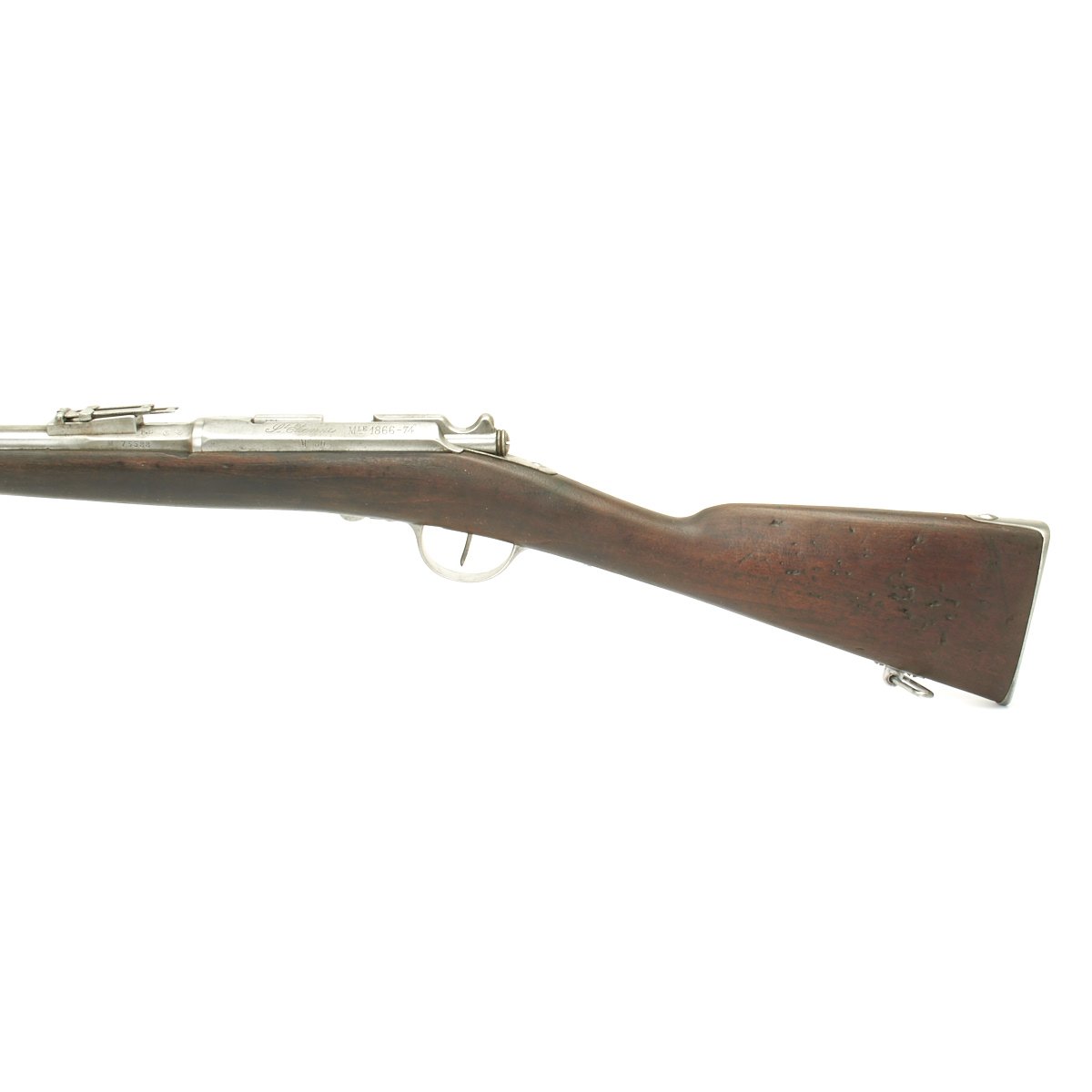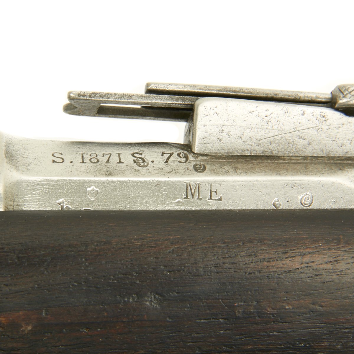 The left side of the receiver marked St. Étienne MLE 1866 - 74 / M80 indicating manufacture at the government arsenal at St. Etienne. The rifle has arsenal proofs on most parts, and also is marked S.1871 S.79 indicating that it was originally manufactured as a Chassepot in 1871, an then converted to Gras in 1879. The rifle has all matching serial numbers, with M 75388 on the barrel, bayonet stand, and all parts of the bolt. There is no stock serial number visible, as wear has obliterated virtually all stock markings.